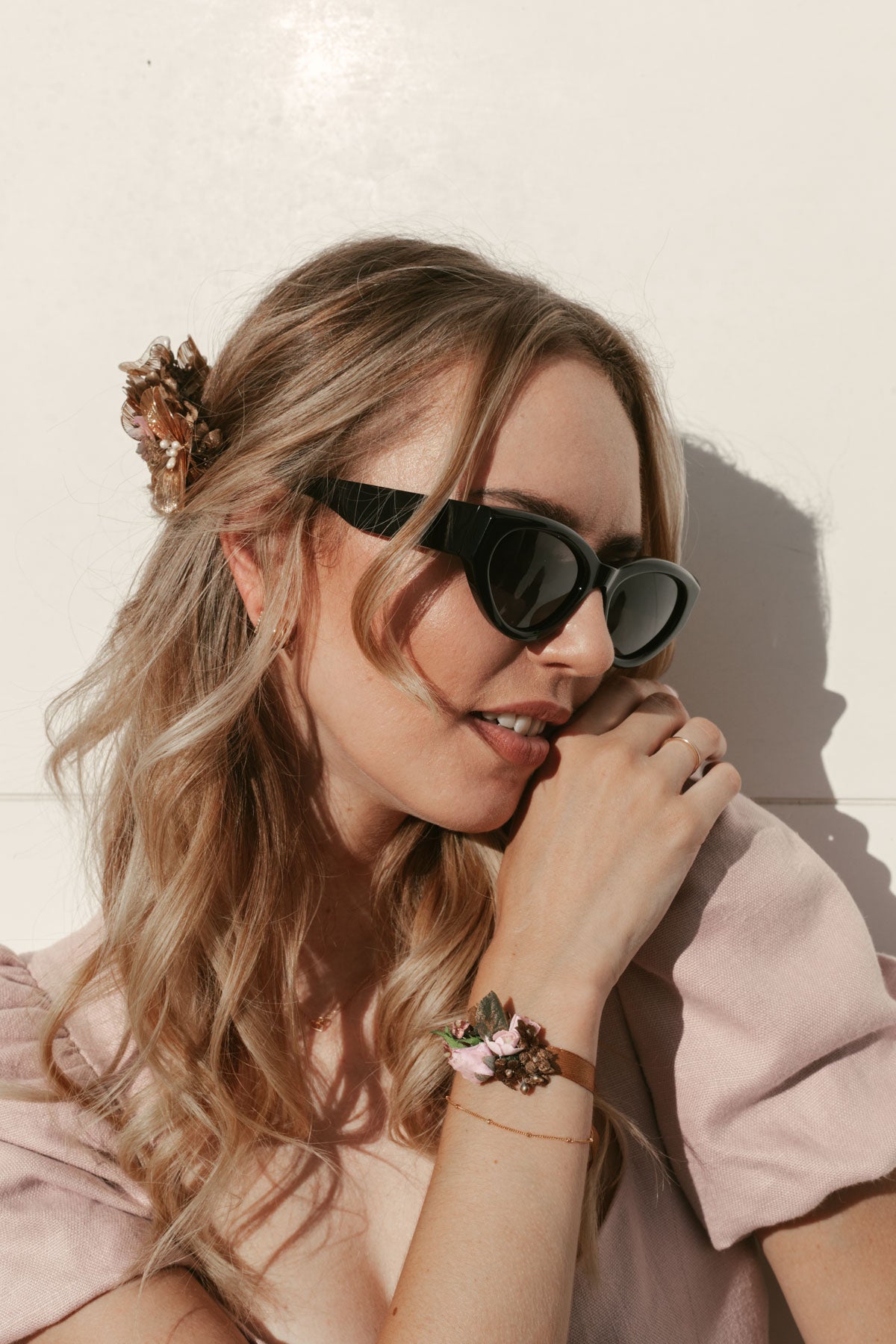 Beachte, dass unsere Designs aus hochwertigen Materialien gefertigt werden. Jedes Stück wird in unserem Wiener Atelier mit Blumen-Raritäten aus den 50ern bis 90ern sowie Trockenblumen, Perlen und Steinen per Hand gefertigt. Daher behandle dein Stück bitte mit Liebe, lege das Design nicht über länge Zeit in die Sonne und schütze es vor Nässe. So hält dein Unikat ein Leben lang und überdauert Generationen.
