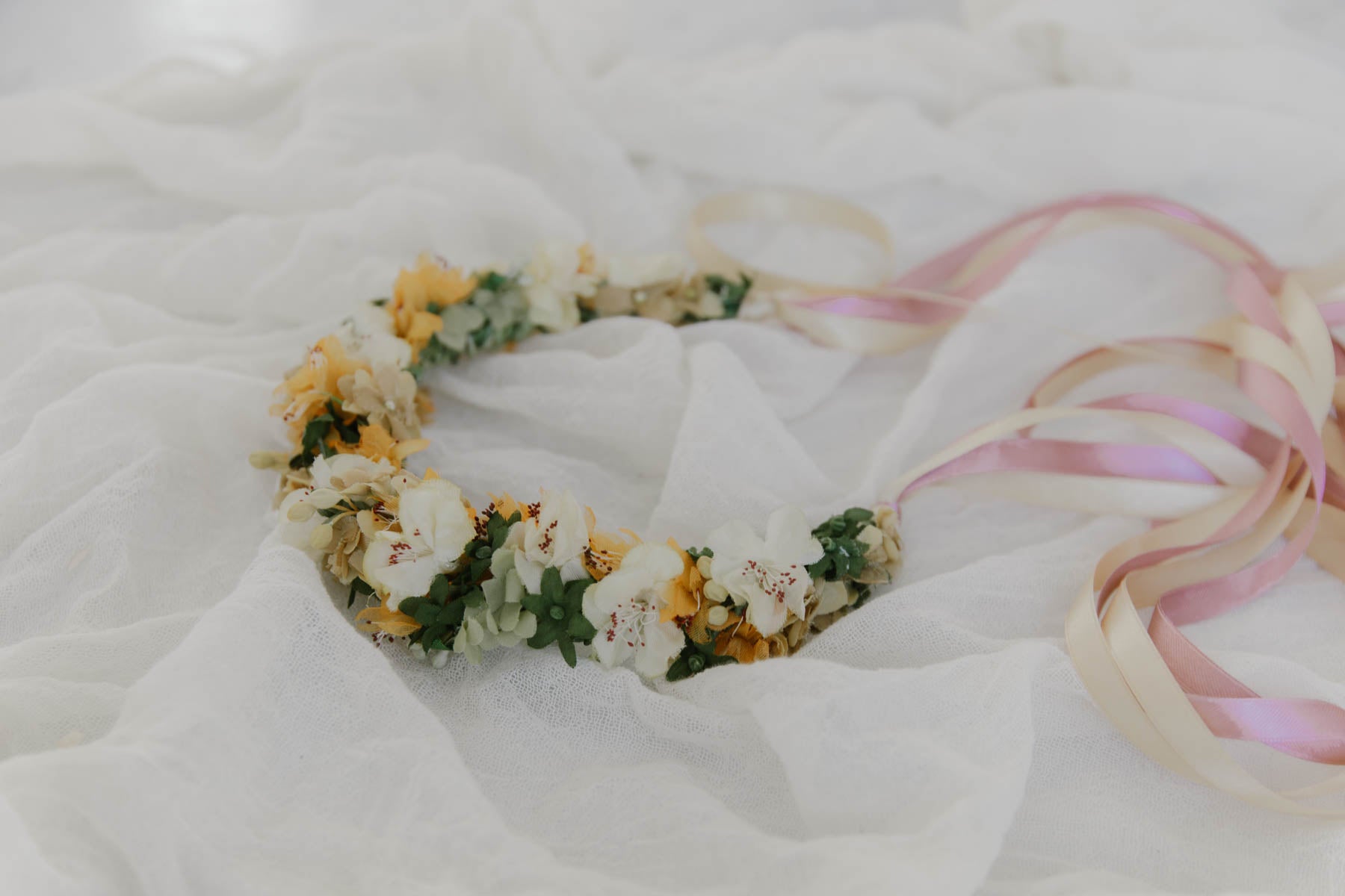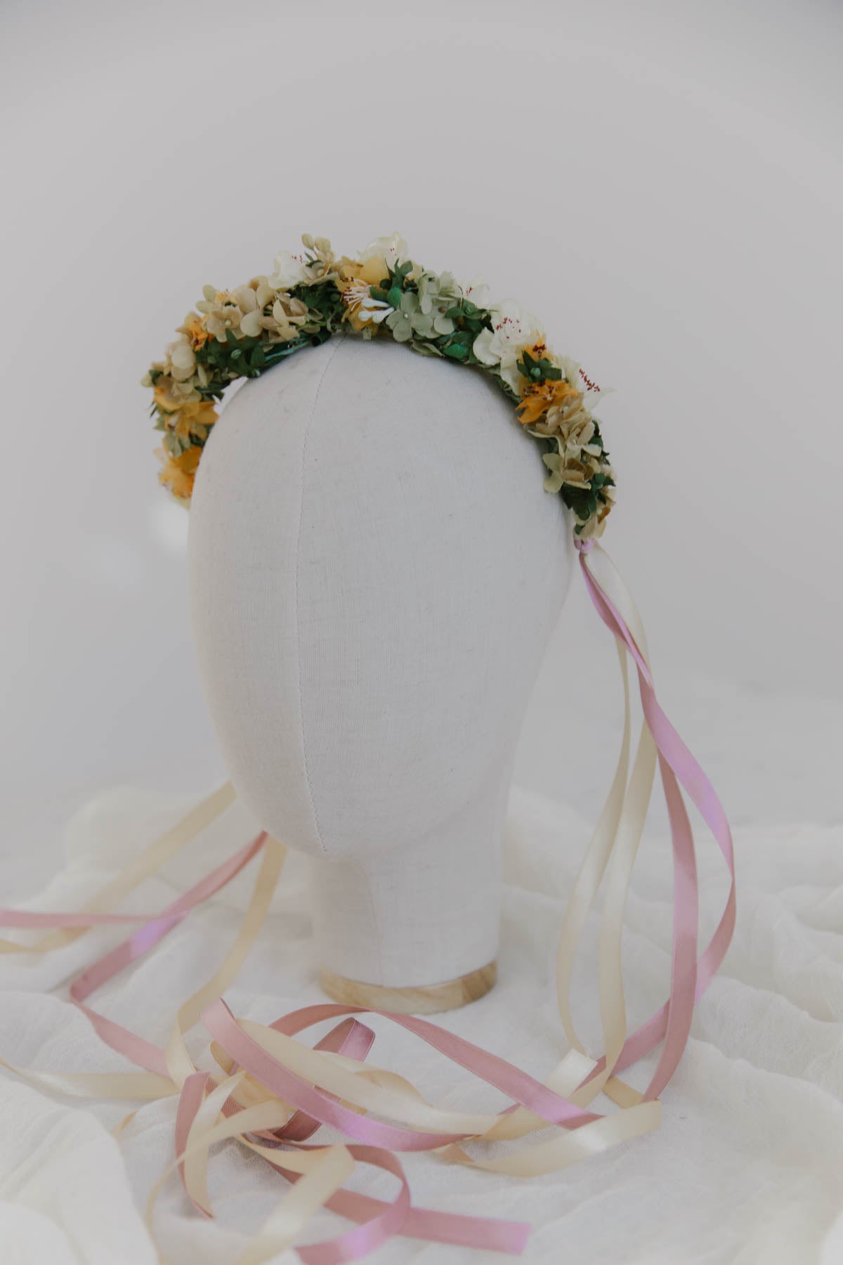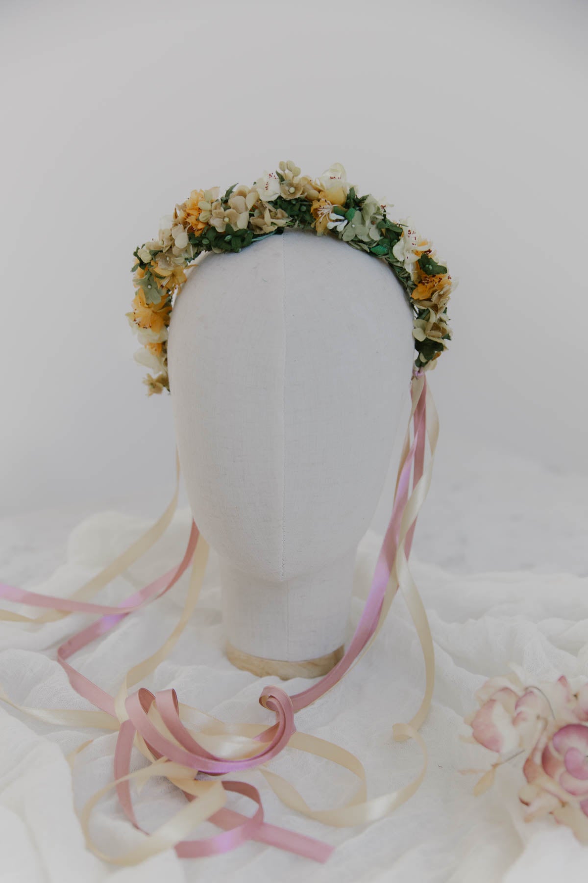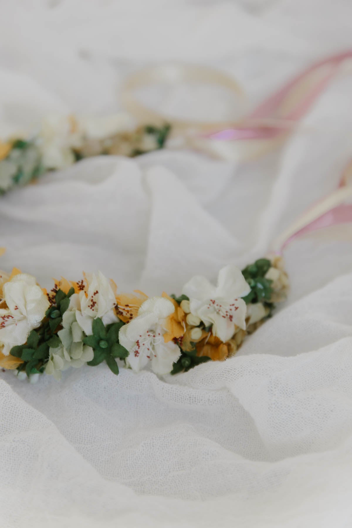 Flowercrown Ina ist eine romantische Blumenkrone für die Ewigkeit die niemals verblüht. Handgemacht in Wien aus vintage Seidenblumen im Wiener Atelier von We Are Flowergirls. Zum Binden mit Satinbändern aus der Schweiz.