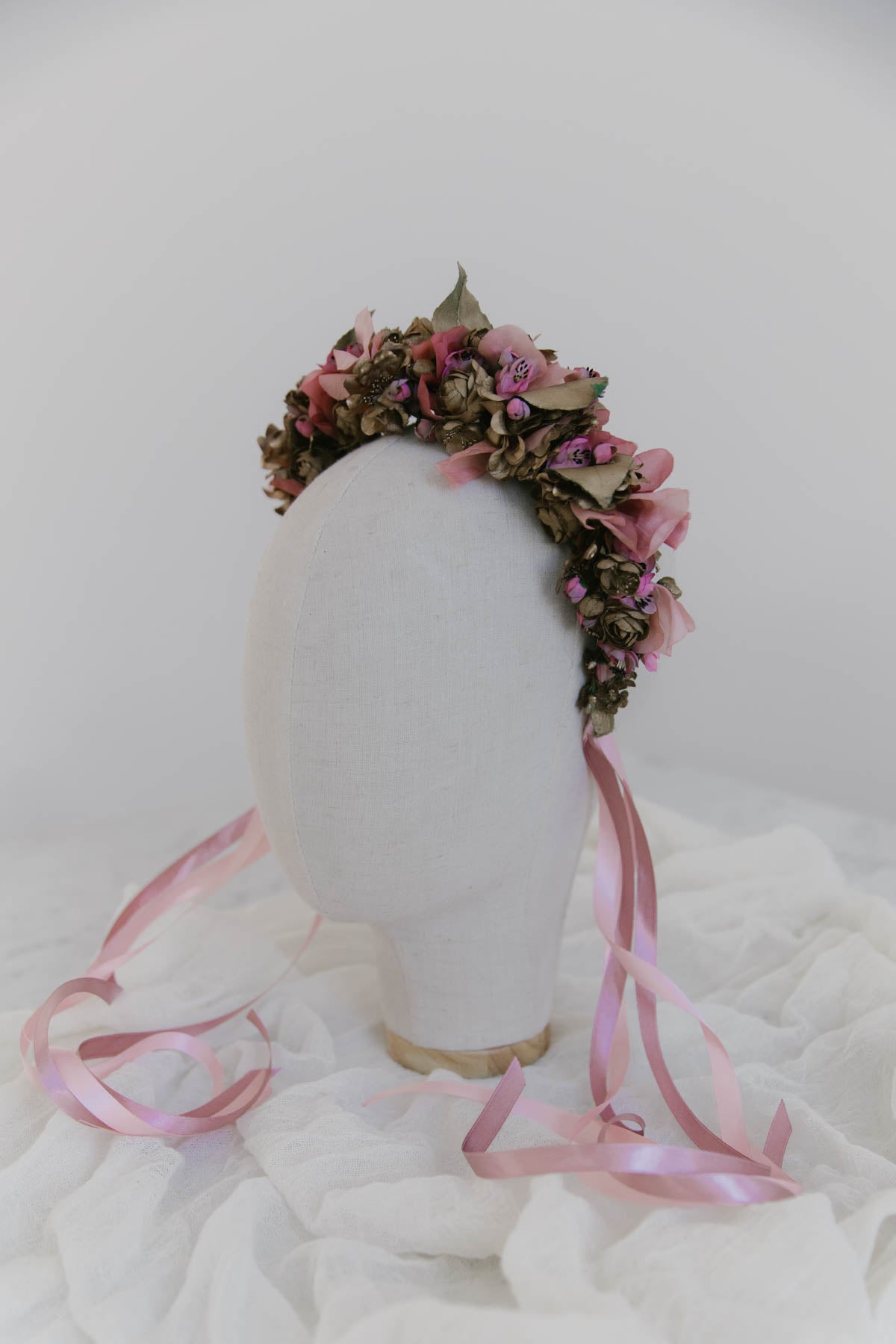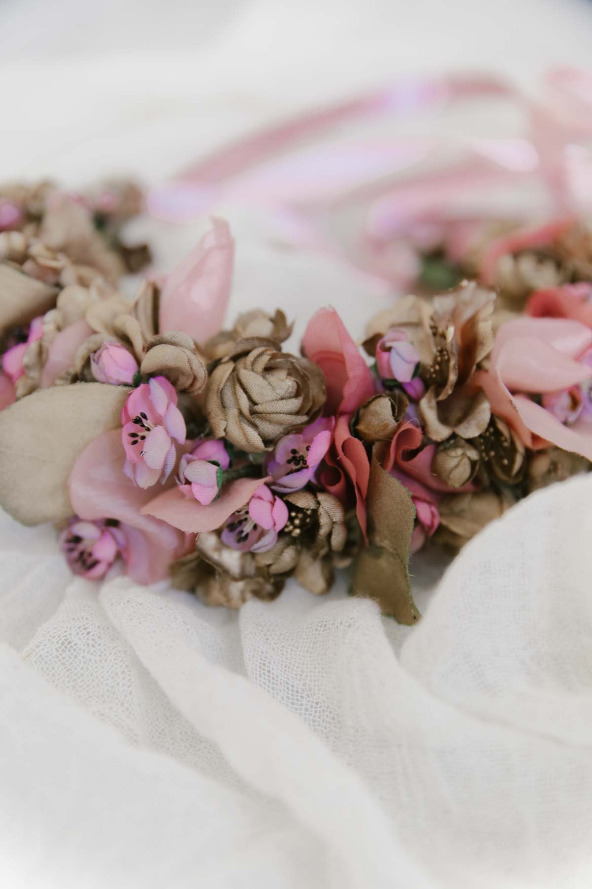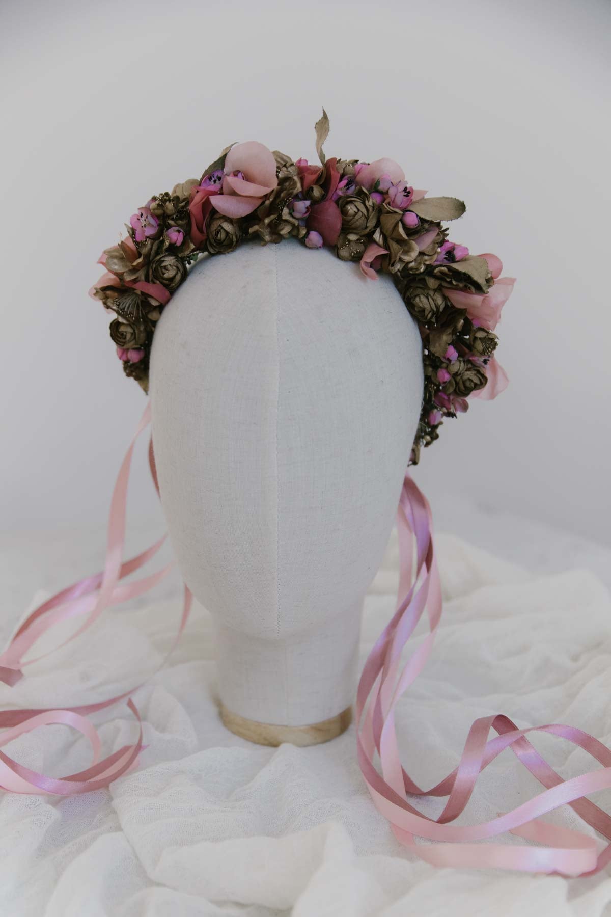 Flowercrown Laoise ist eine romantische Blumenkrone für die Ewigkeit die niemals verblüht. Handgemacht in Wien aus vintage Seidenblumen im Wiener Atelier von We Are Flowergirls. Zum Binden mit Satinbändern aus der Schweiz.