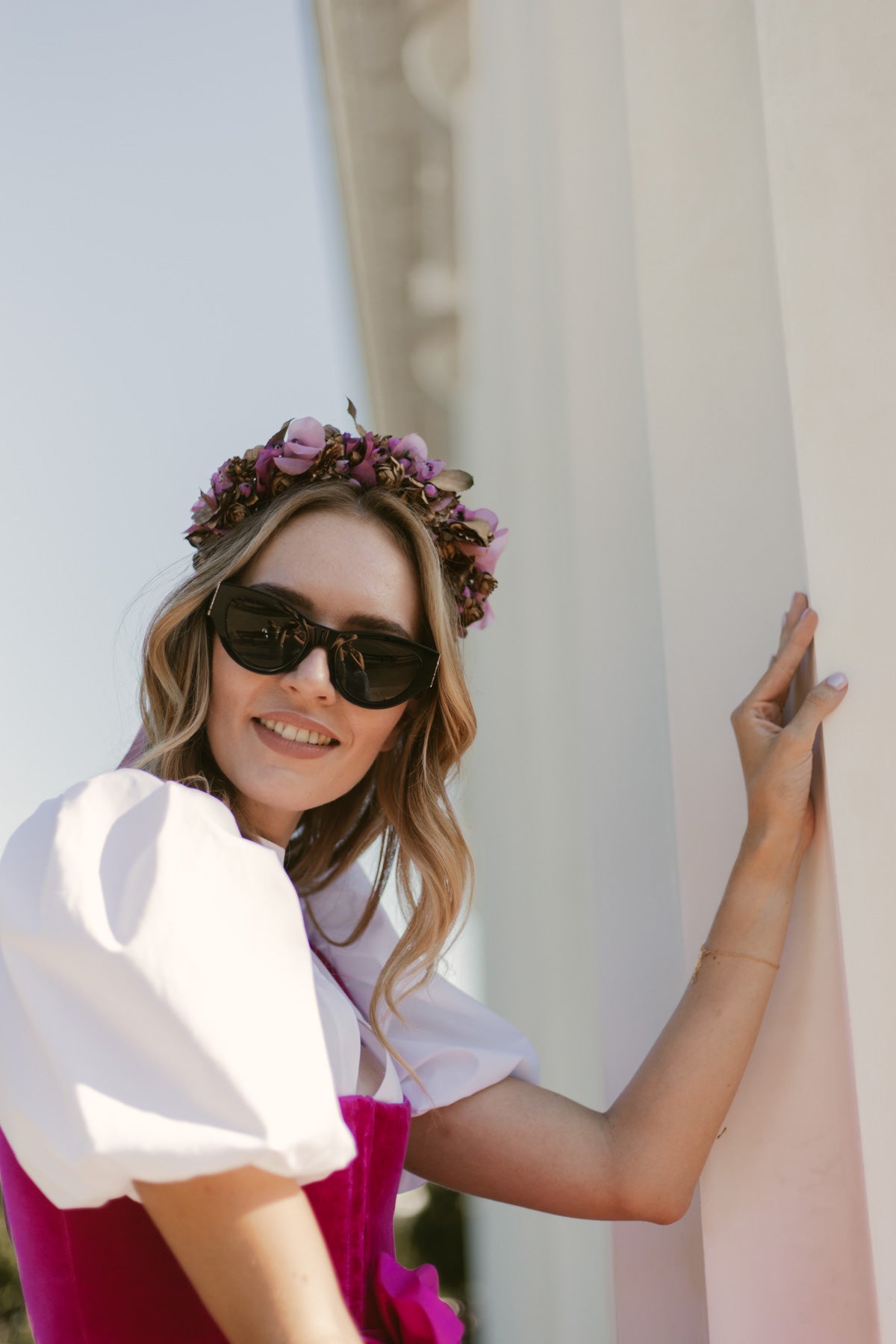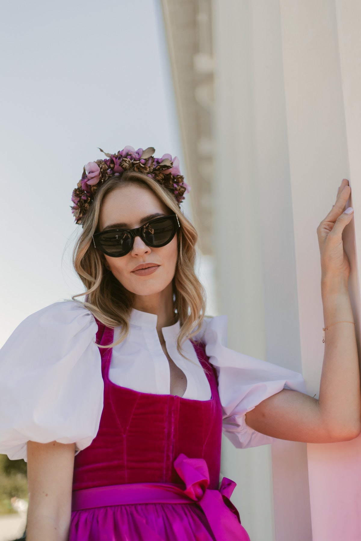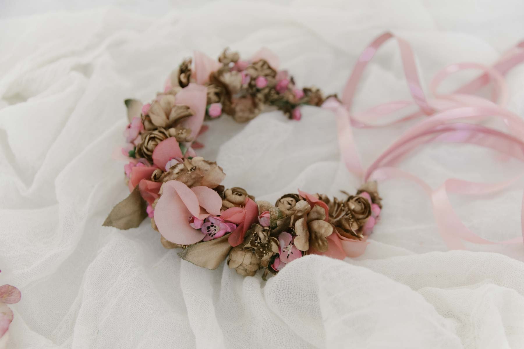 Flowercrown Laoise ist eine romantische Blumenkrone für die Ewigkeit die niemals verblüht. Handgemacht in Wien aus vintage Seidenblumen im Wiener Atelier von We Are Flowergirls. Zum Binden mit Satinbändern aus der Schweiz.