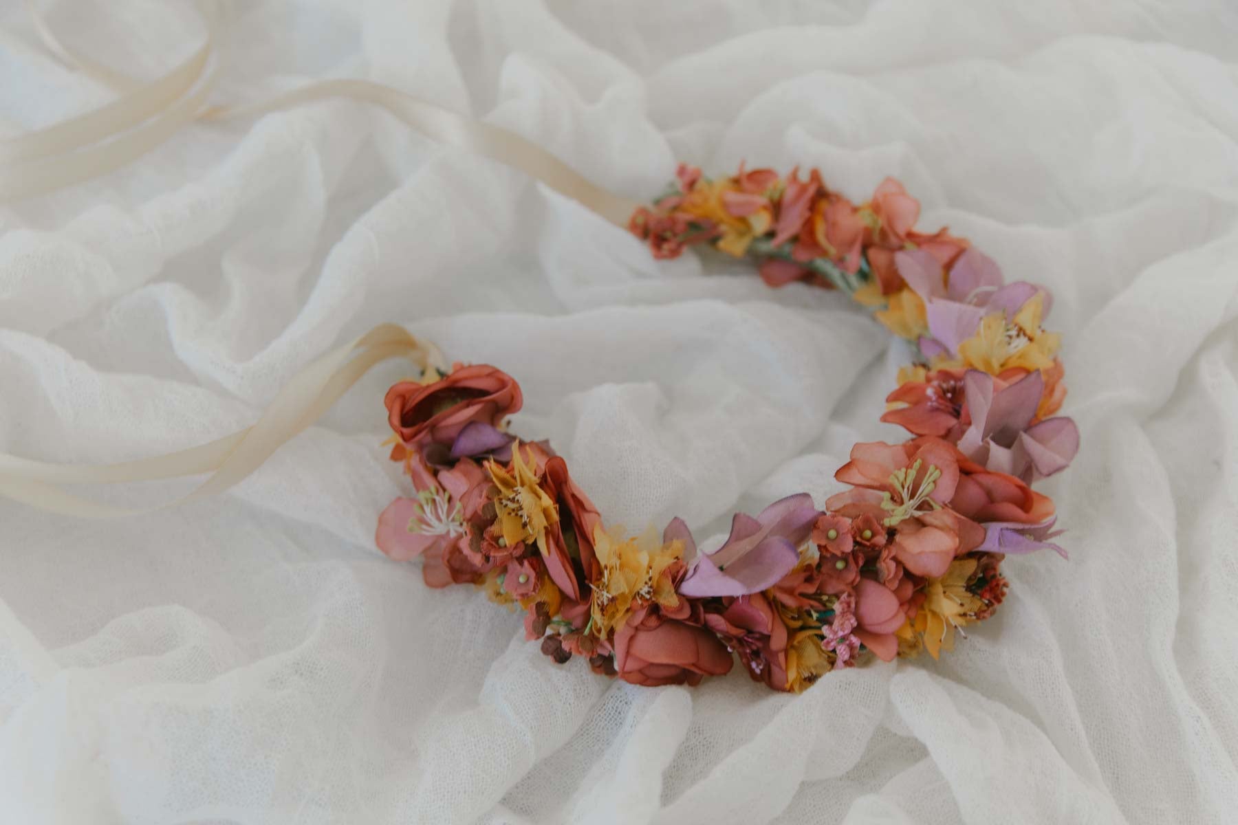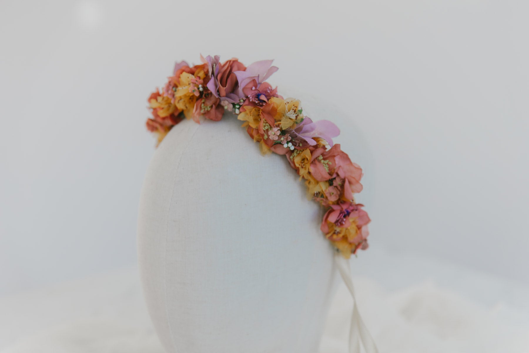 Flowercrown Leija ist eine romantische Blumenkrone für die Ewigkeit die niemals verblüht. Handgemacht in Wien aus vintage Seidenblumen im Wiener Atelier von We Are Flowergirls. Zum Binden mit Satinbändern aus der Schweiz.