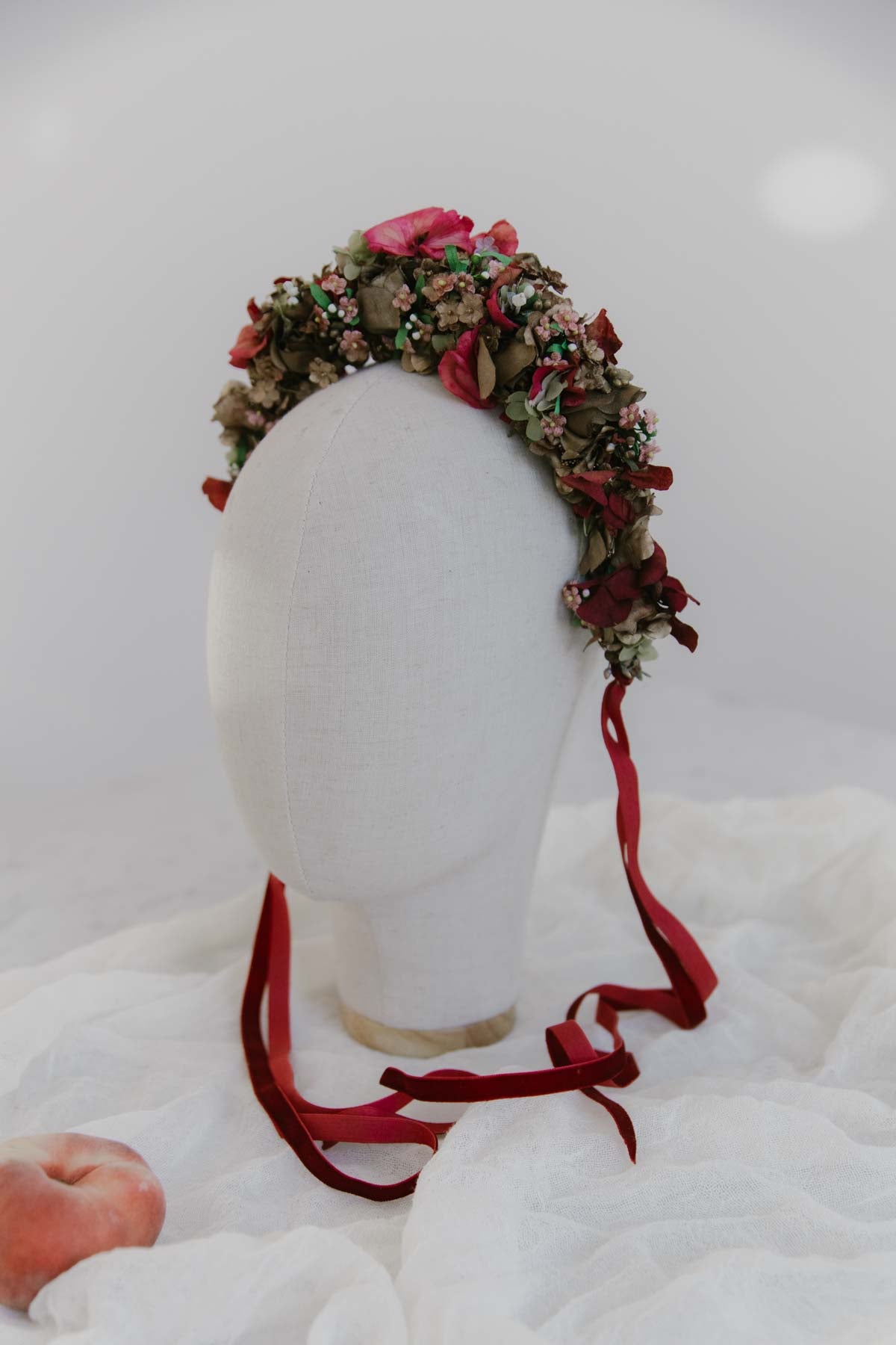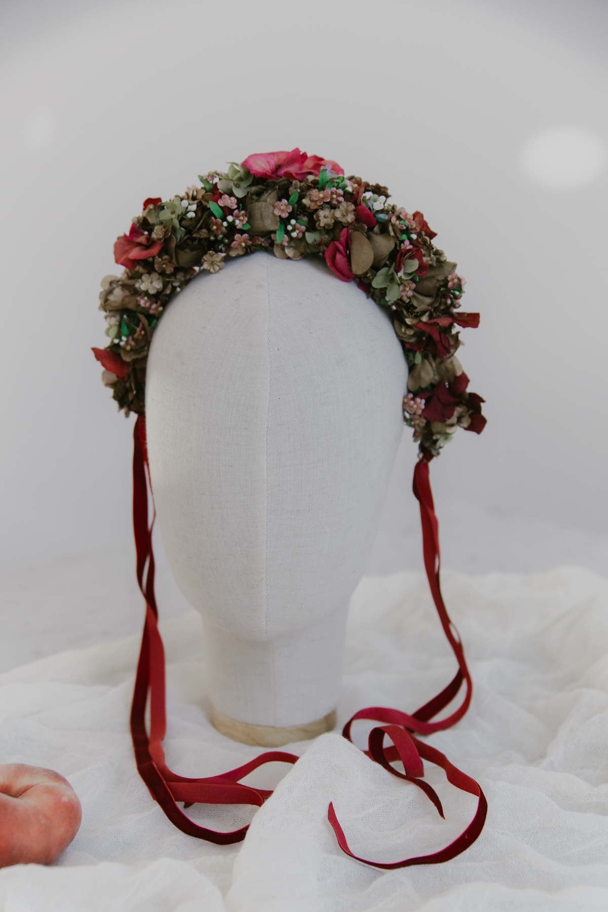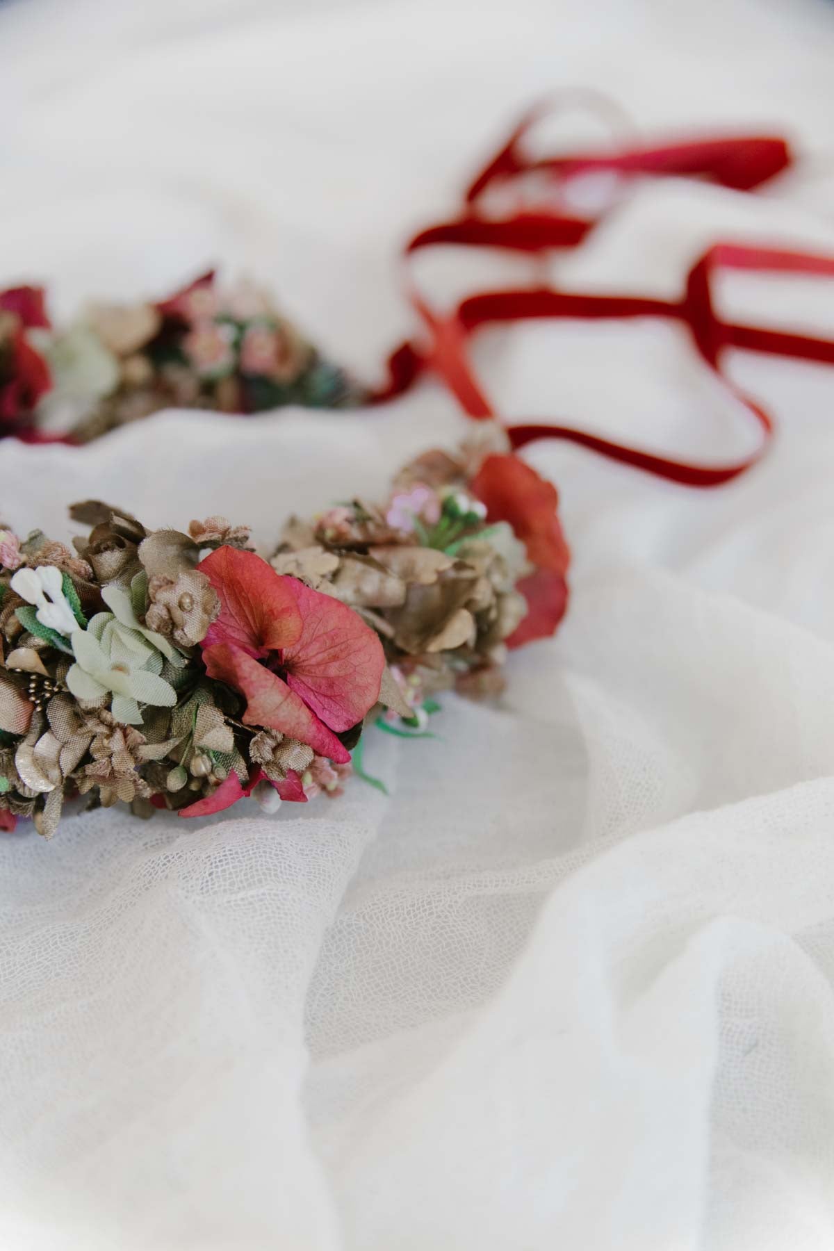 Flowercrown Neala ist eine romantische Blumenkrone für die Ewigkeit die niemals verblüht. Handgemacht in Wien aus vintage Seidenblumen im Wiener Atelier von We Are Flowergirls. Zum Binden mit Satinbändern aus der Schweiz.