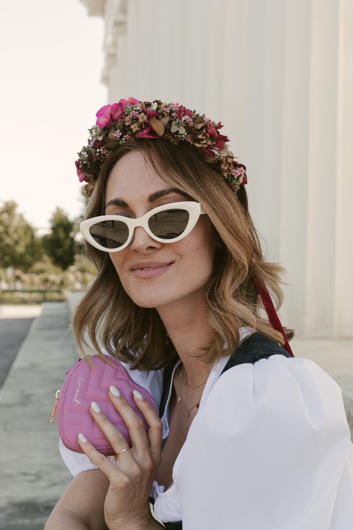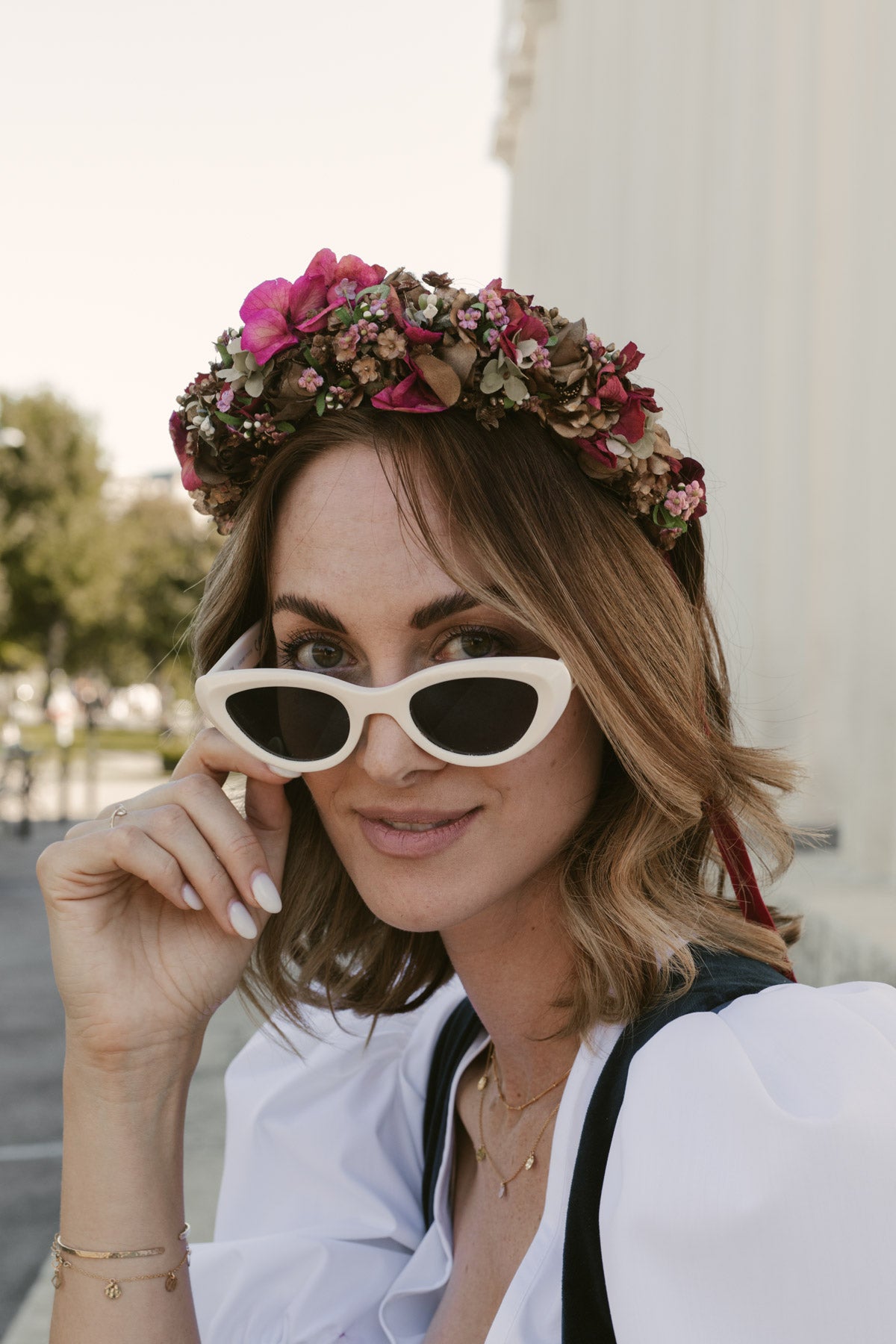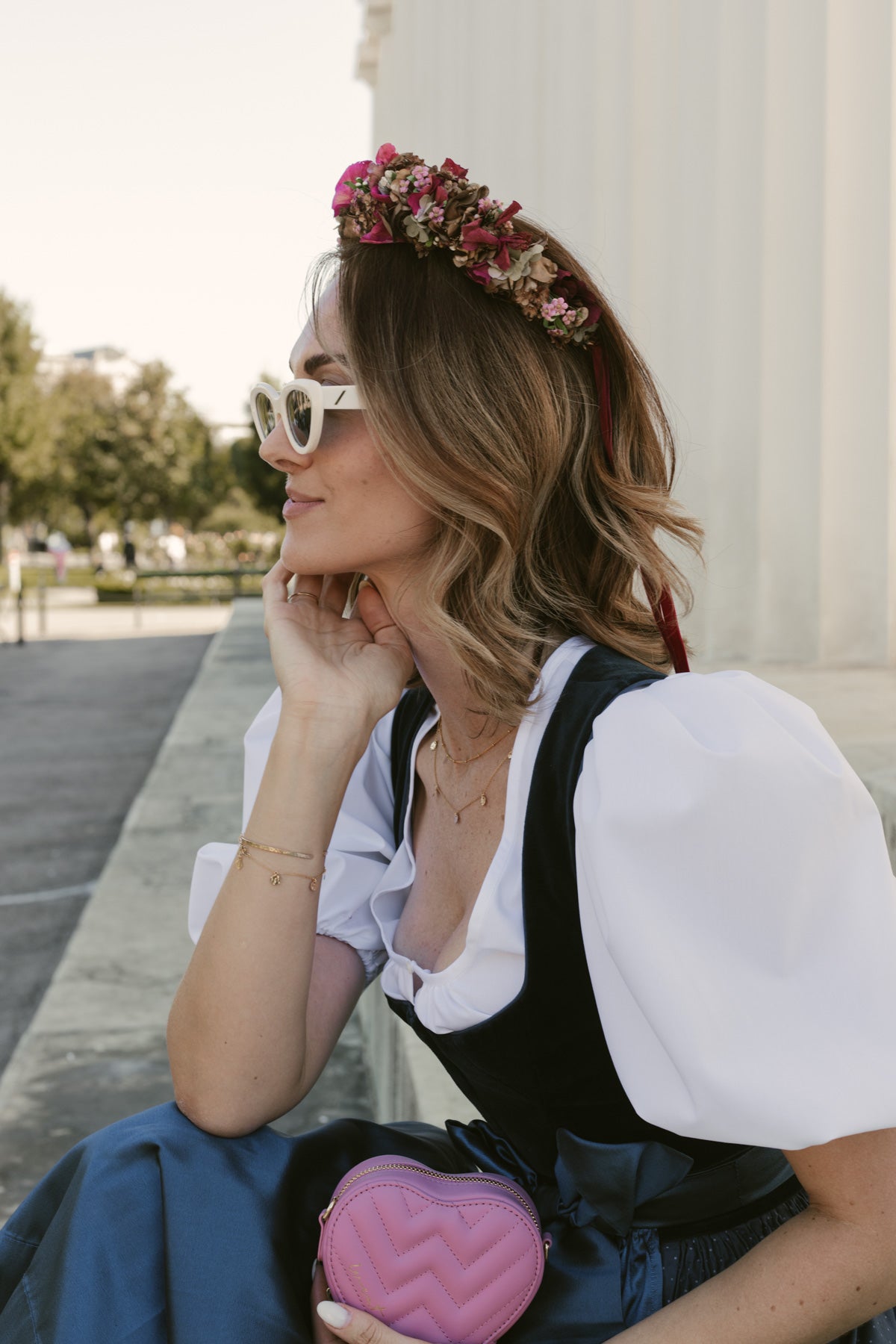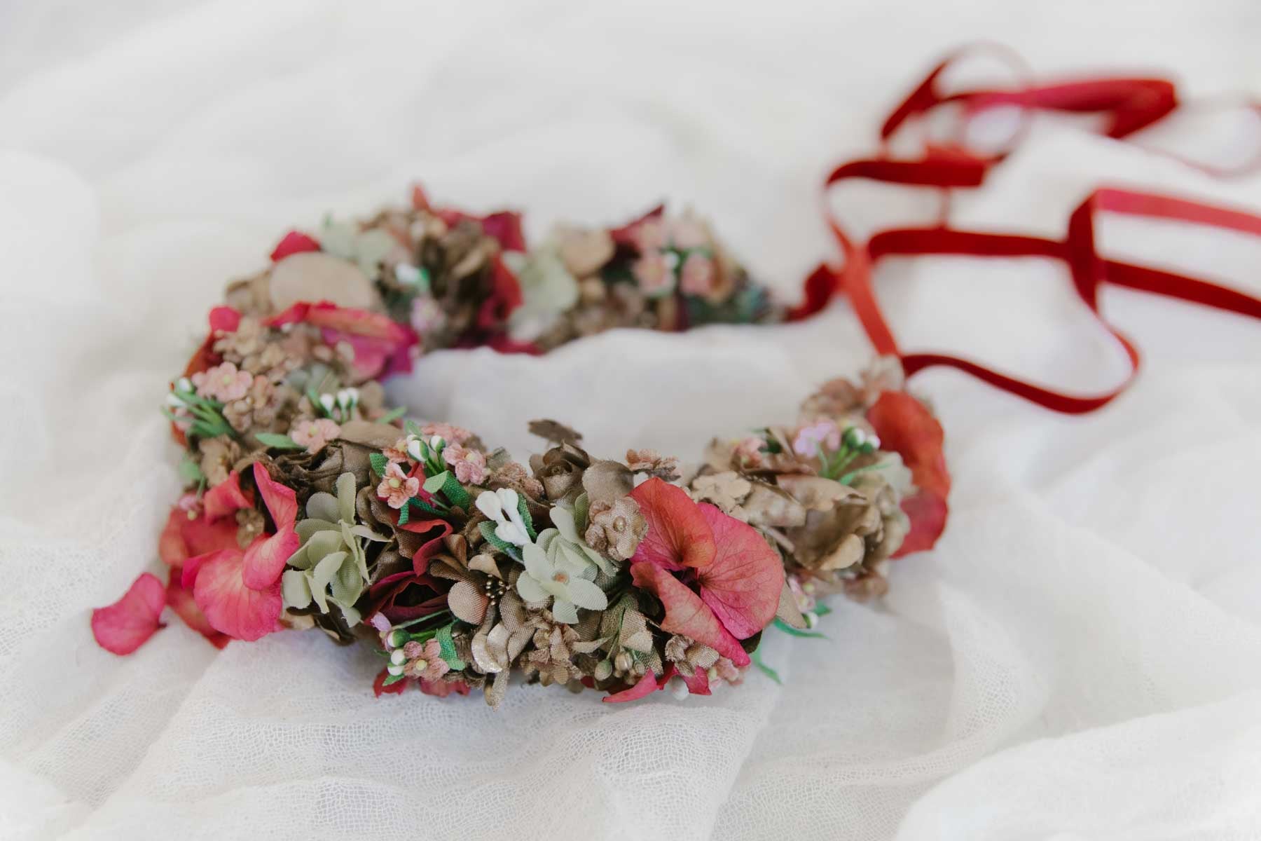 Flowercrown Neala ist eine romantische Blumenkrone für die Ewigkeit die niemals verblüht. Handgemacht in Wien aus vintage Seidenblumen im Wiener Atelier von We Are Flowergirls. Zum Binden mit Satinbändern aus der Schweiz.