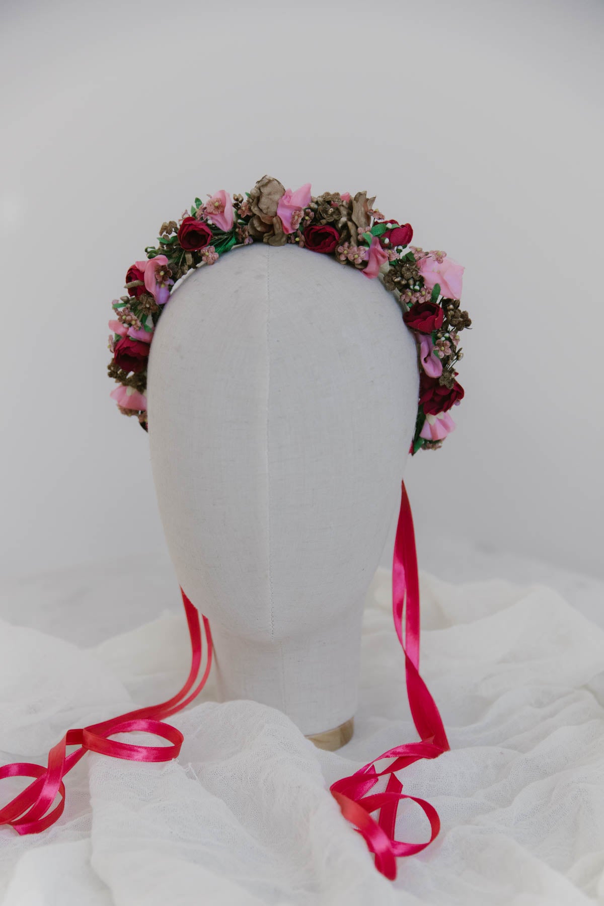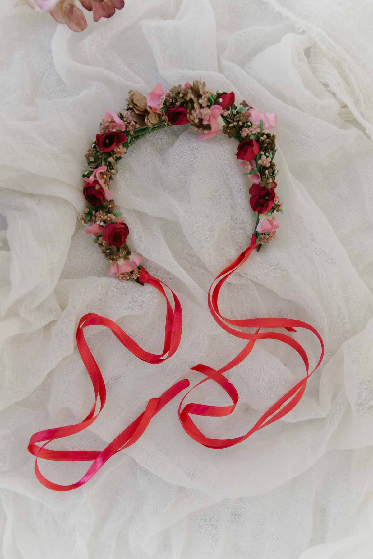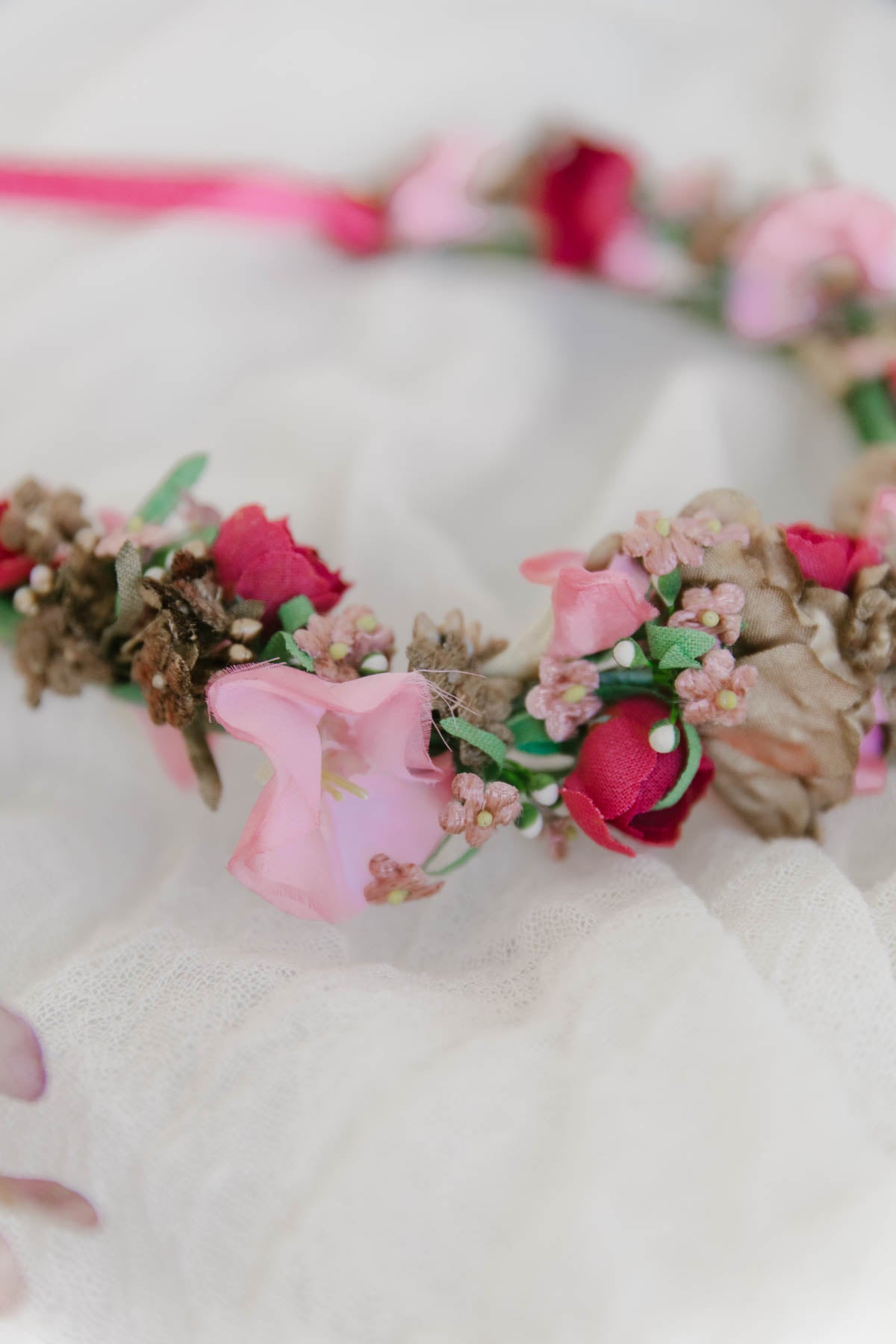 Flowercrown Neala ist eine romantische Blumenkrone für die Ewigkeit die niemals verblüht. Handgemacht in Wien aus vintage Seidenblumen im Wiener Atelier von We Are Flowergirls. Zum Binden mit Satinbändern aus der Schweiz.