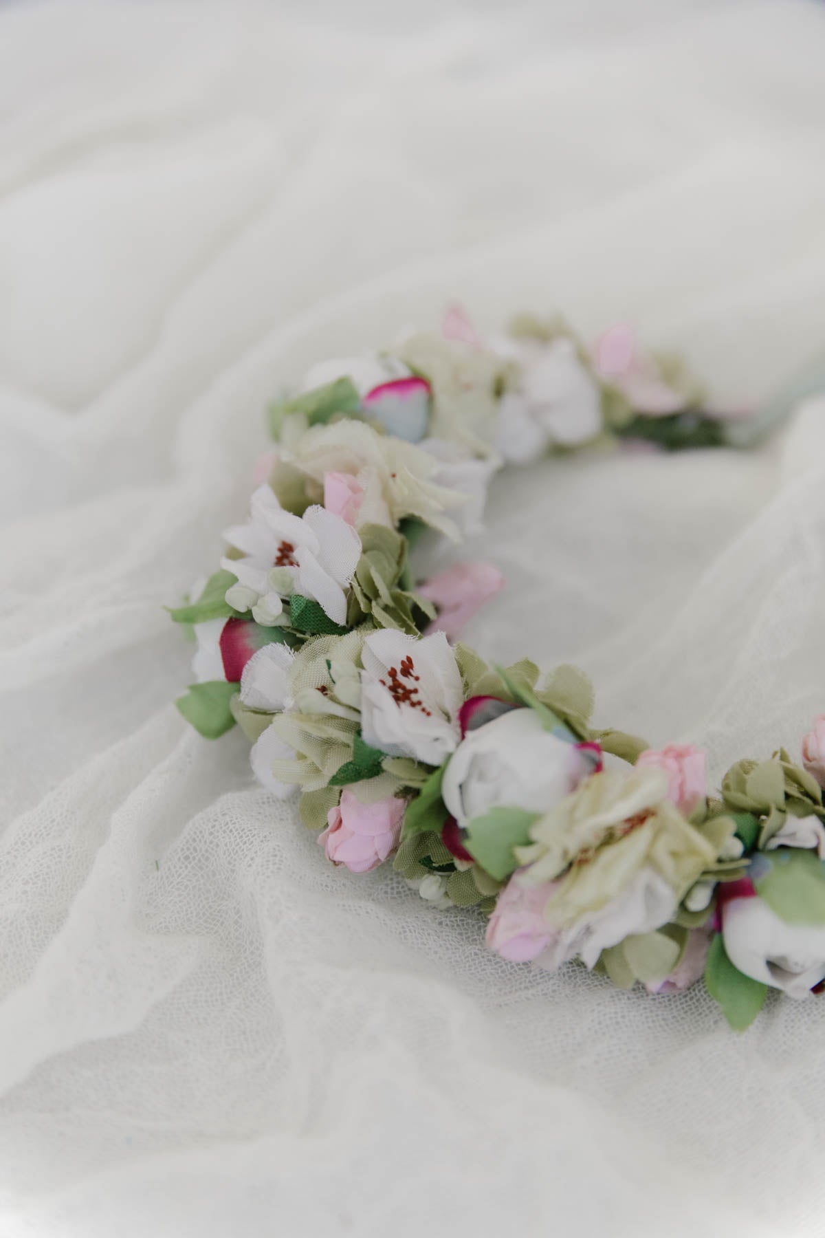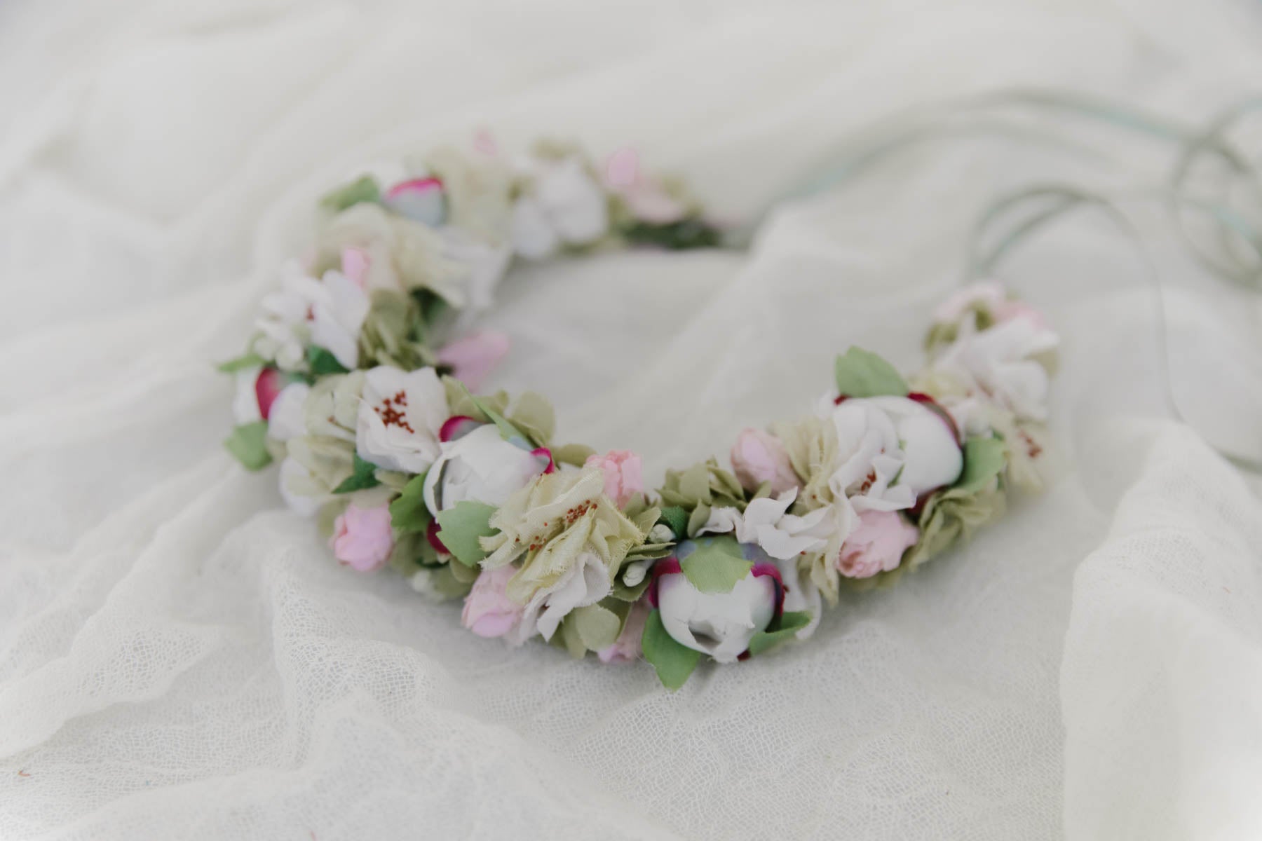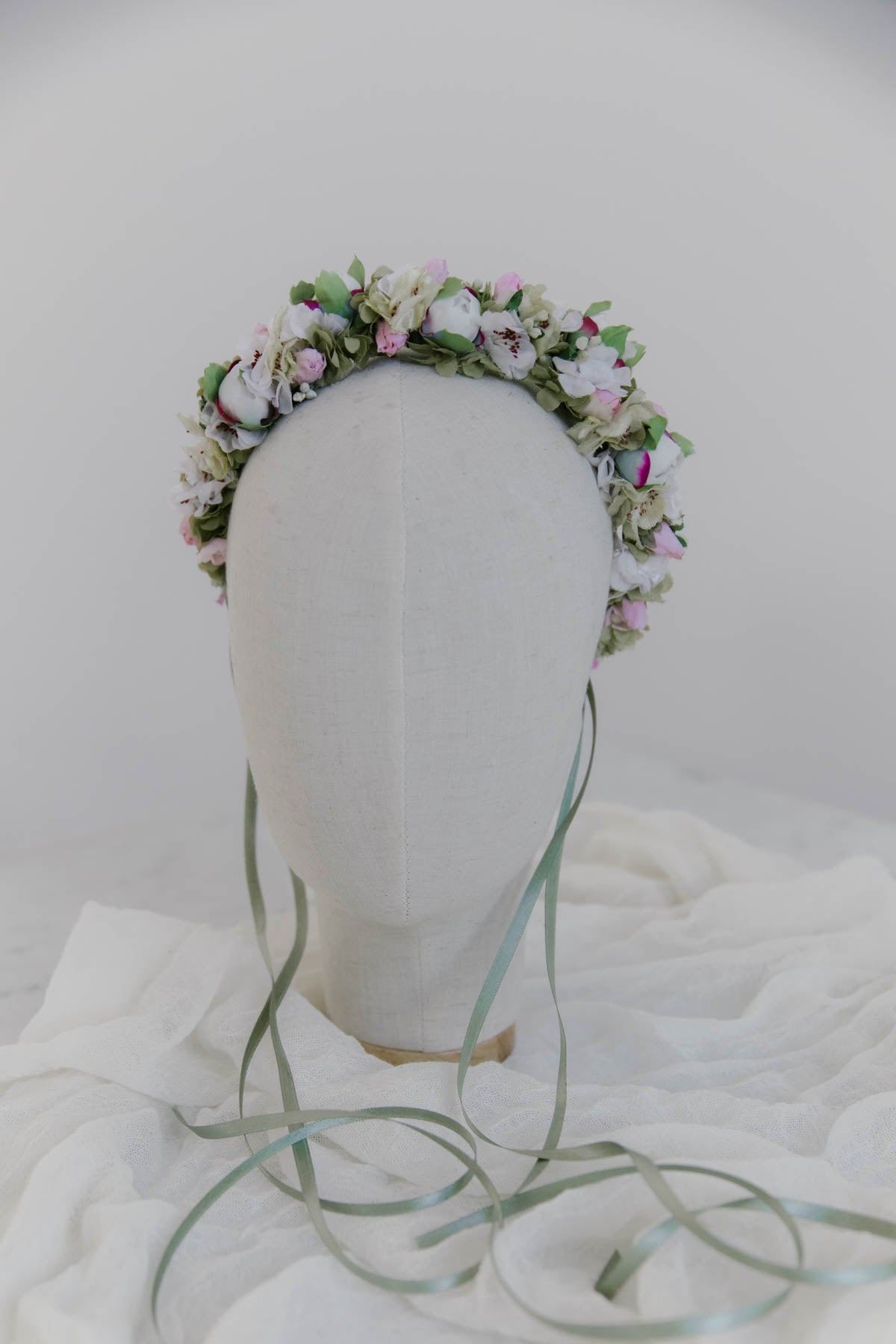 Flowercrown Saoirse ist eine romantische Blumenkrone für die Ewigkeit die niemals verblüht. Handgemacht in Wien aus vintage Seidenblumen im Wiener Atelier von We Are Flowergirls. Zum Binden mit Satinbändern aus der Schweiz.