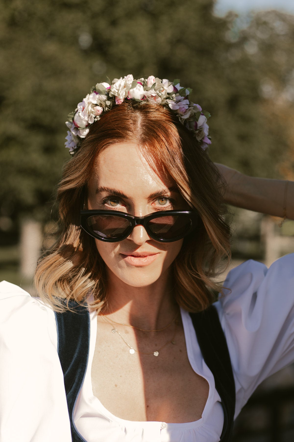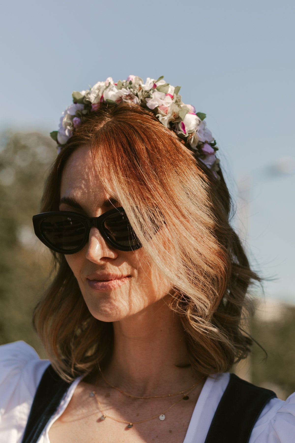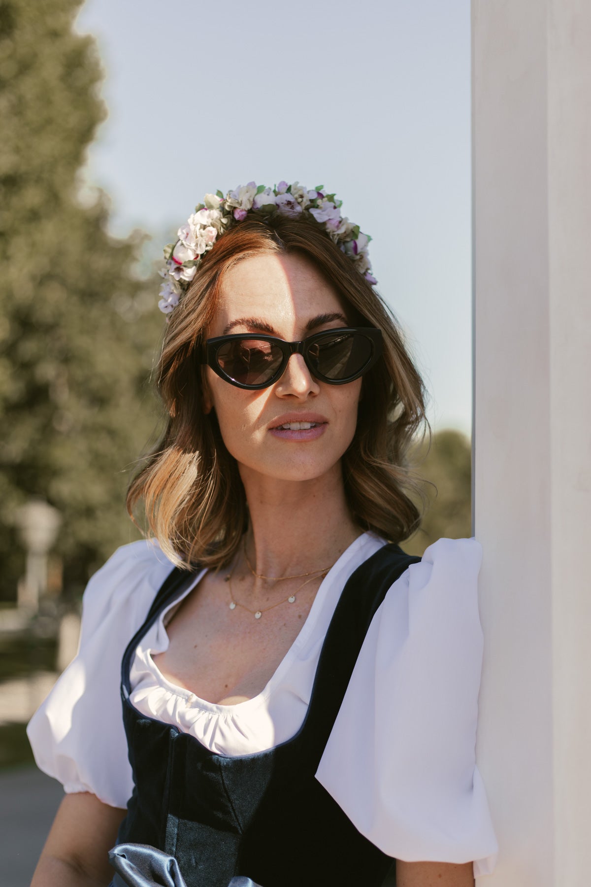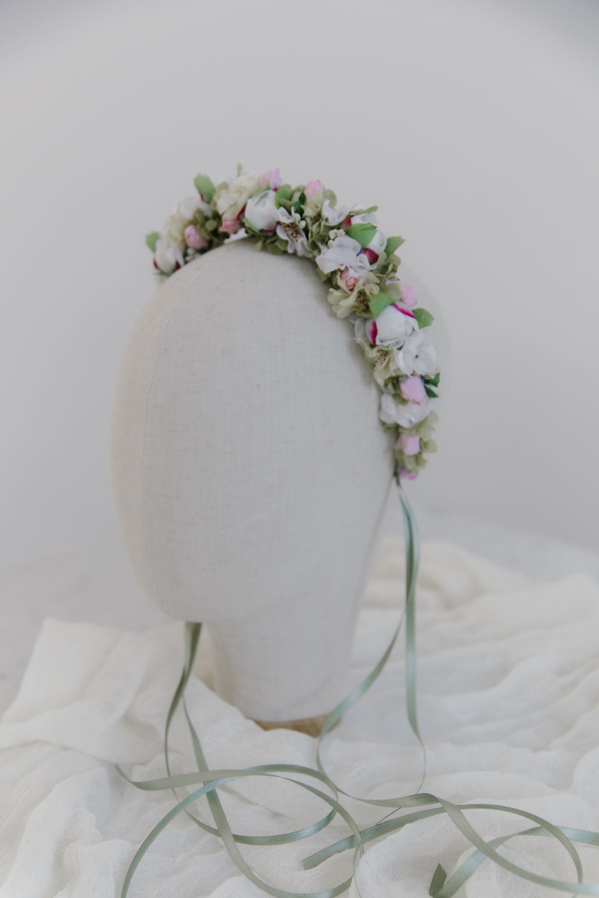 Flowercrown Saoirse ist eine romantische Blumenkrone für die Ewigkeit die niemals verblüht. Handgemacht in Wien aus vintage Seidenblumen im Wiener Atelier von We Are Flowergirls. Zum Binden mit Satinbändern aus der Schweiz.