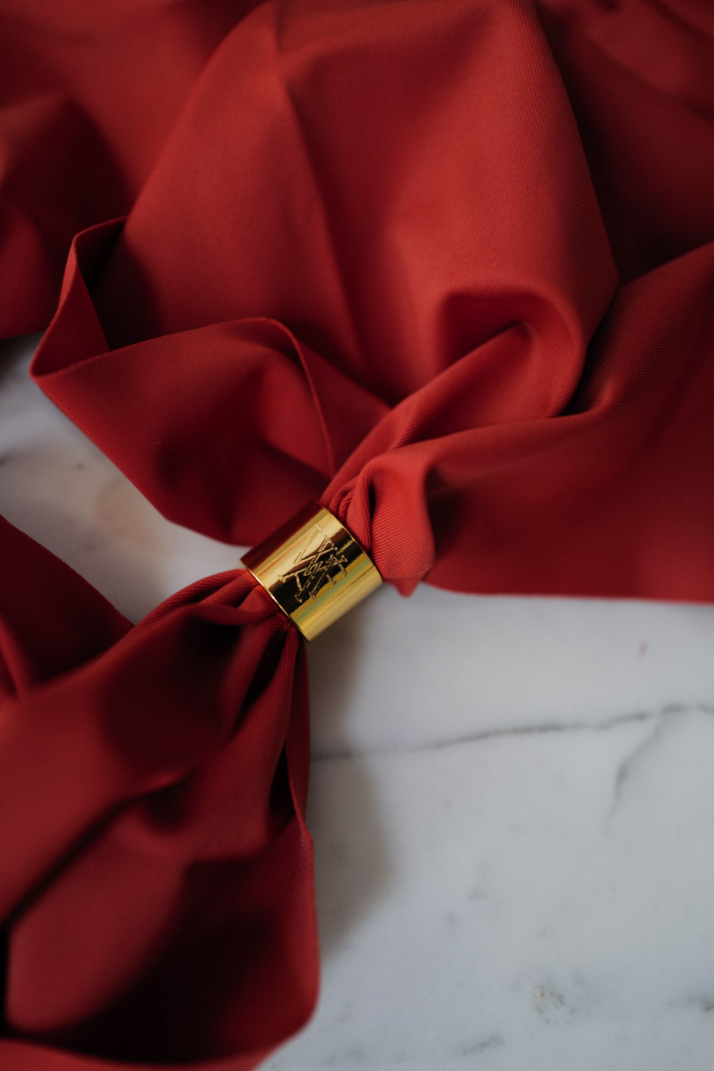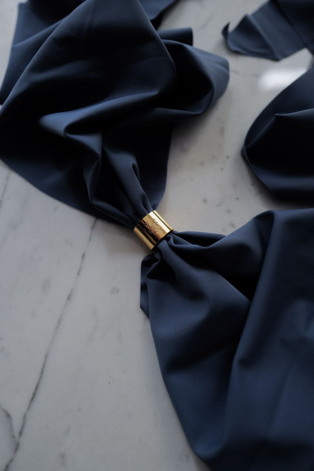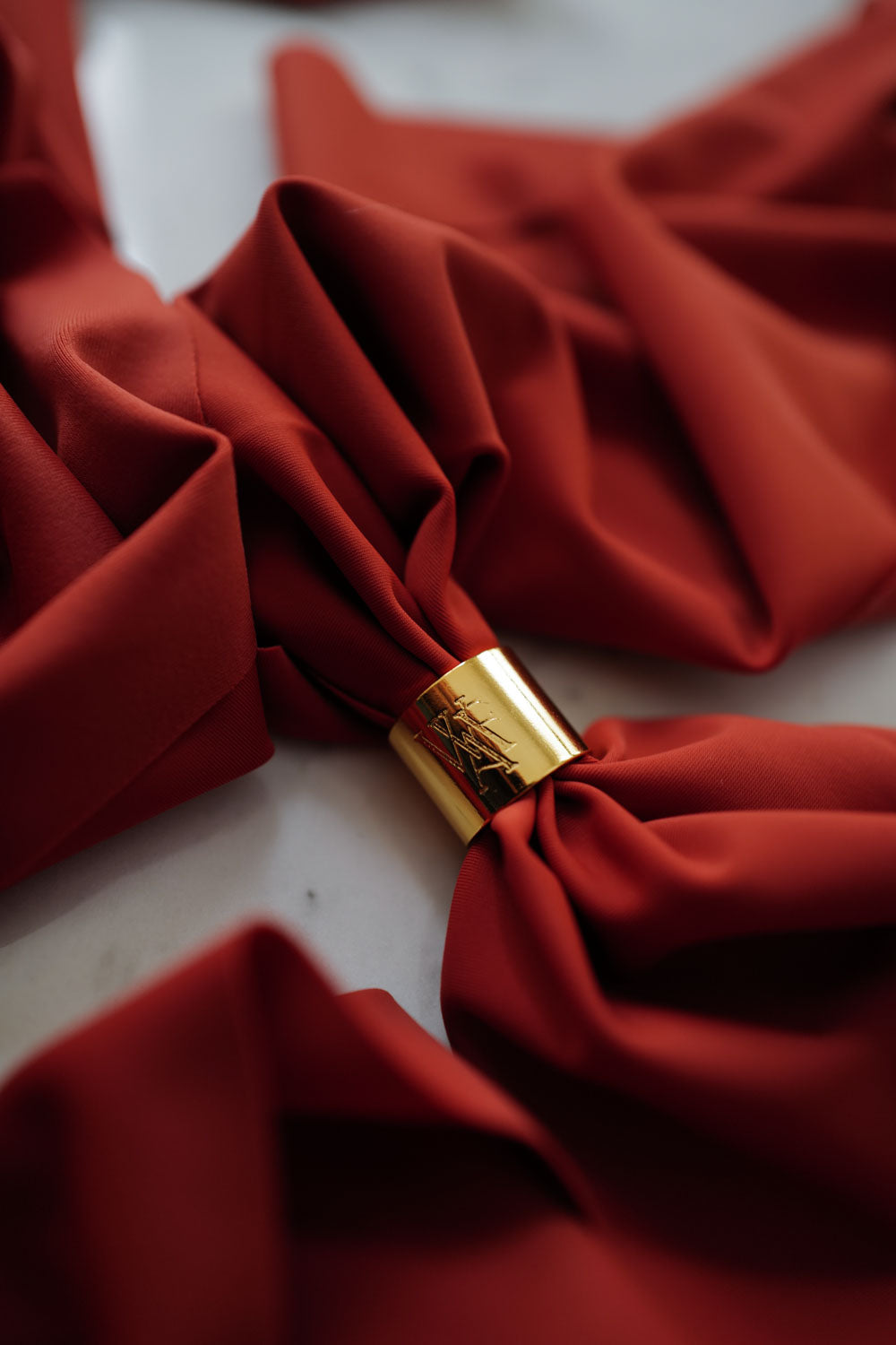 So geht’s: Unsere Golden Tubes kannst du ganz leicht auf deine Oberteil-Bahnen fädeln und so einen besonderen Eye-Catcher Look kreieren.