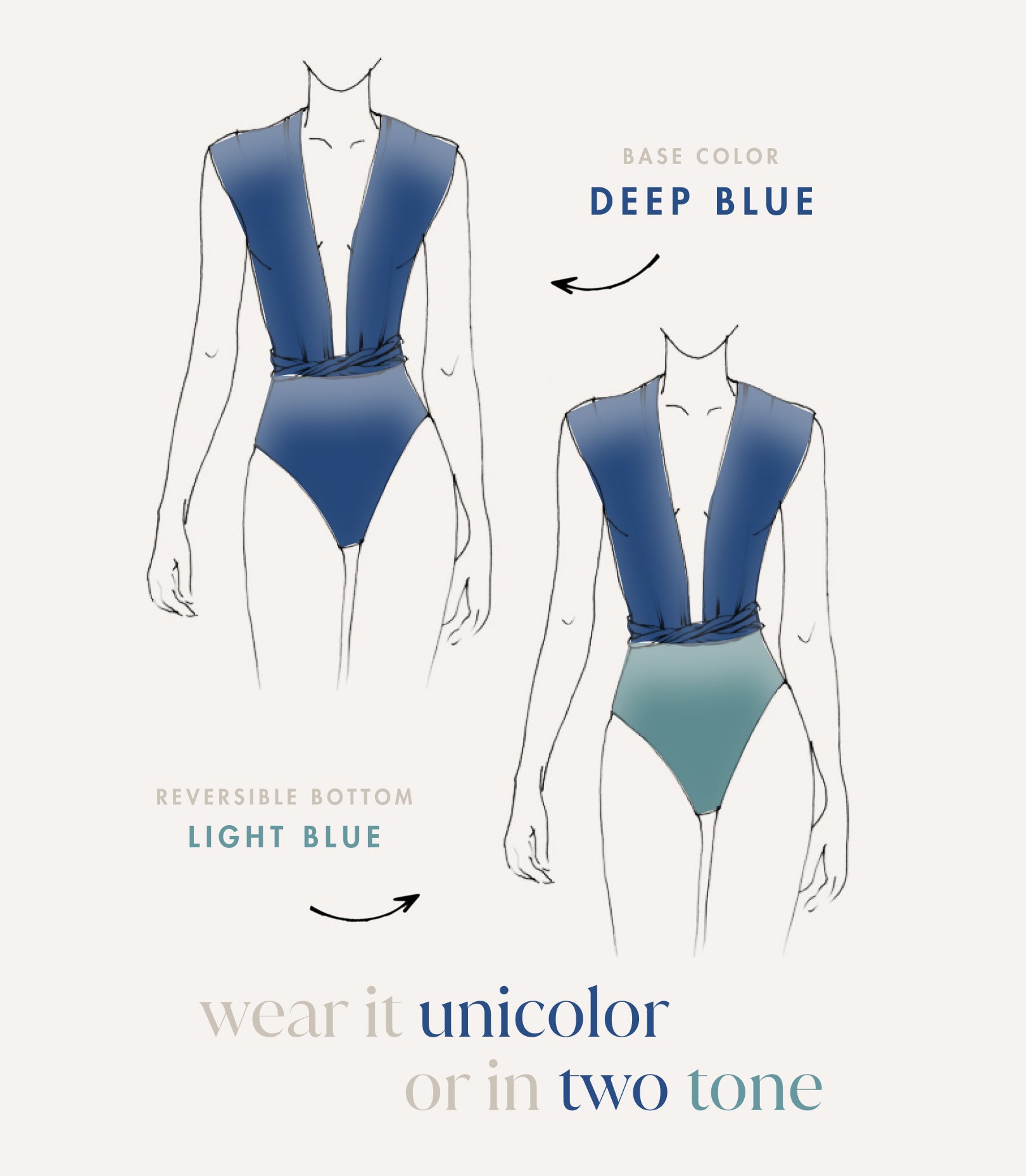Die Außenhose und Oberteilbahnen sind Dunkelblau. Das Innenhöschen Hellblau. So kannst du unseren Swimsuit entweder Unicolour oder two tone tragen.
