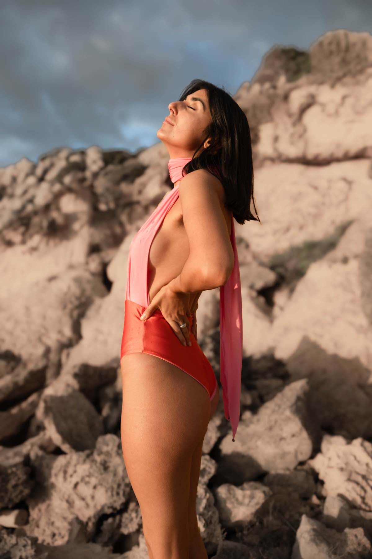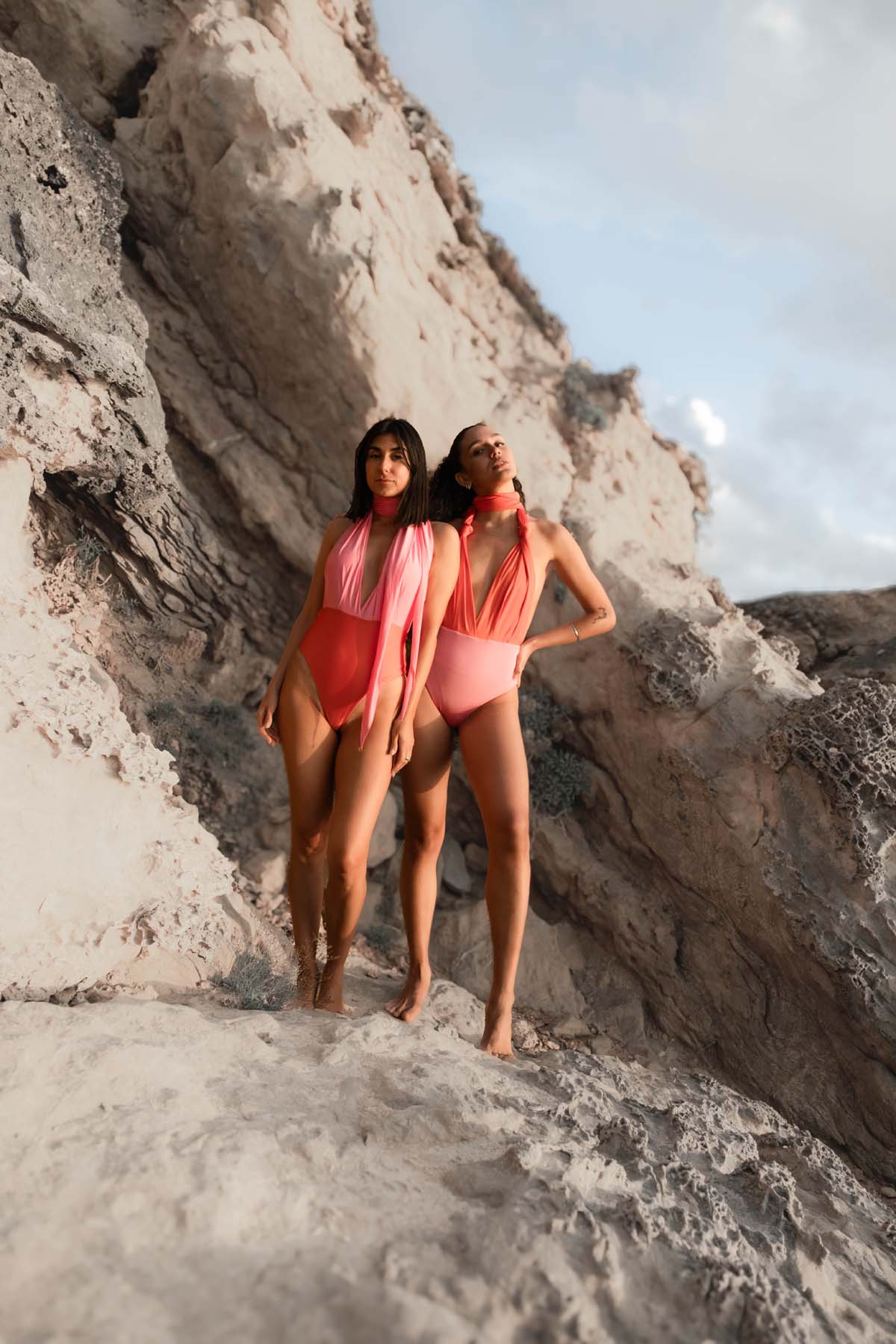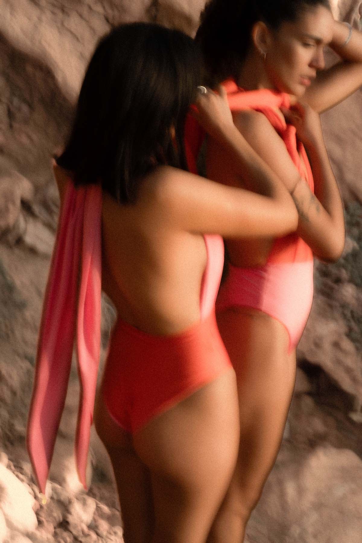 Die Außenhose und Oberteilbahnen sind Soft Pink. Das Innenhöschen Orange. So kannst du unseren Swimsuit entweder Unicolour oder two tone tragen.