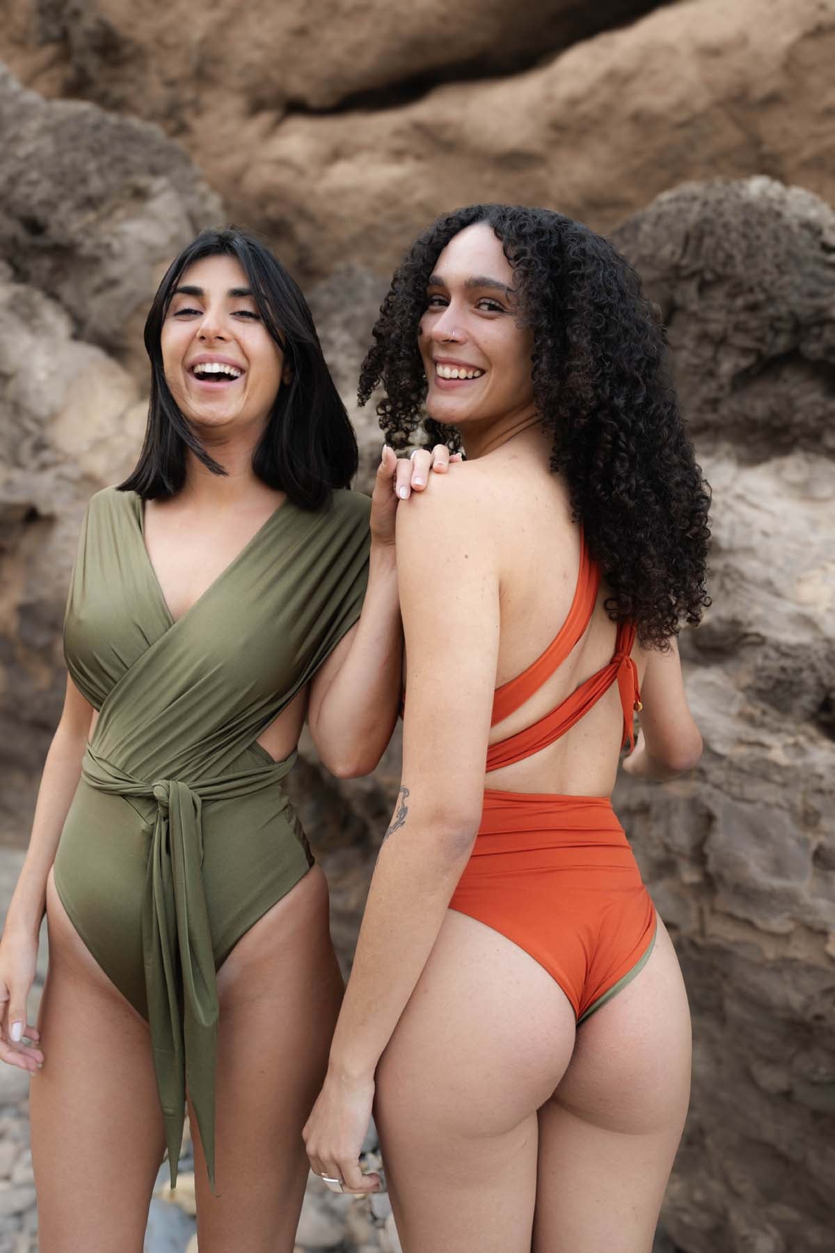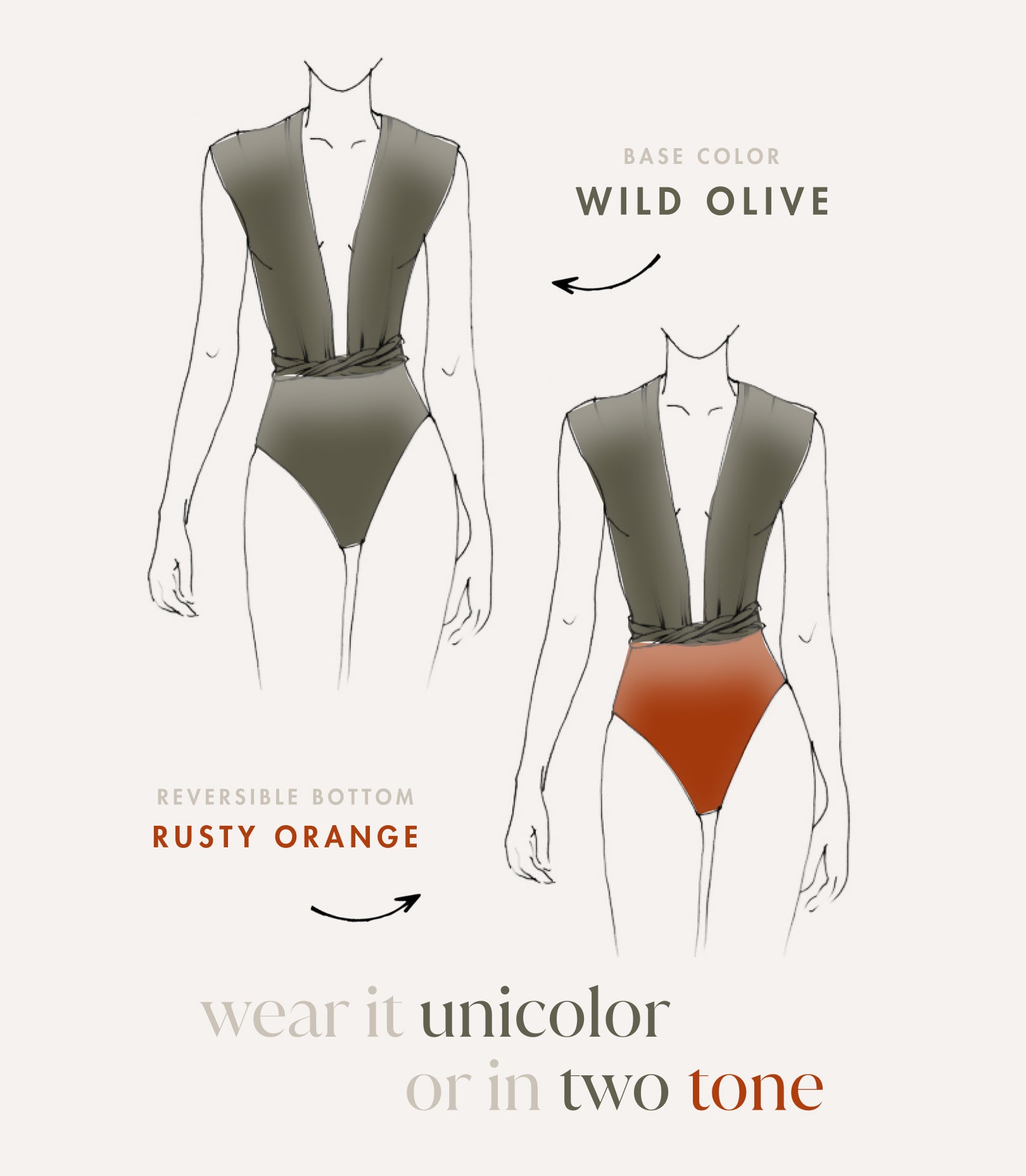 Die Außenhose und Oberteilbahnen sind Olivgrün. Das Innenhöschen Orange. So kannst du unseren Swimsuit entweder Unicolour oder two tone tragen.