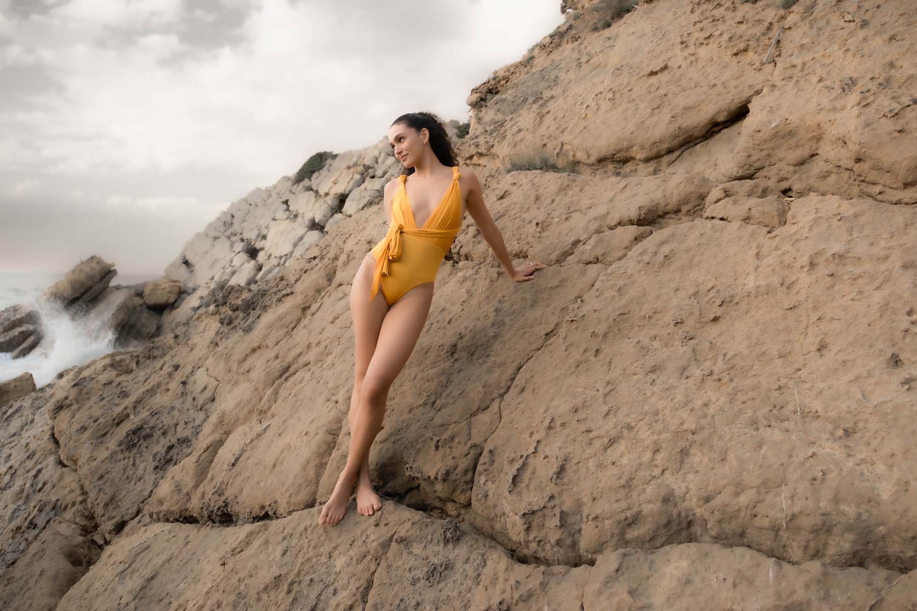 Du kannst unseren Swimsuit klassisch mit 3/5 Po-Bedeckung tragen, oder auch höher gezogen etwas sexier mit “cheeky shape”.