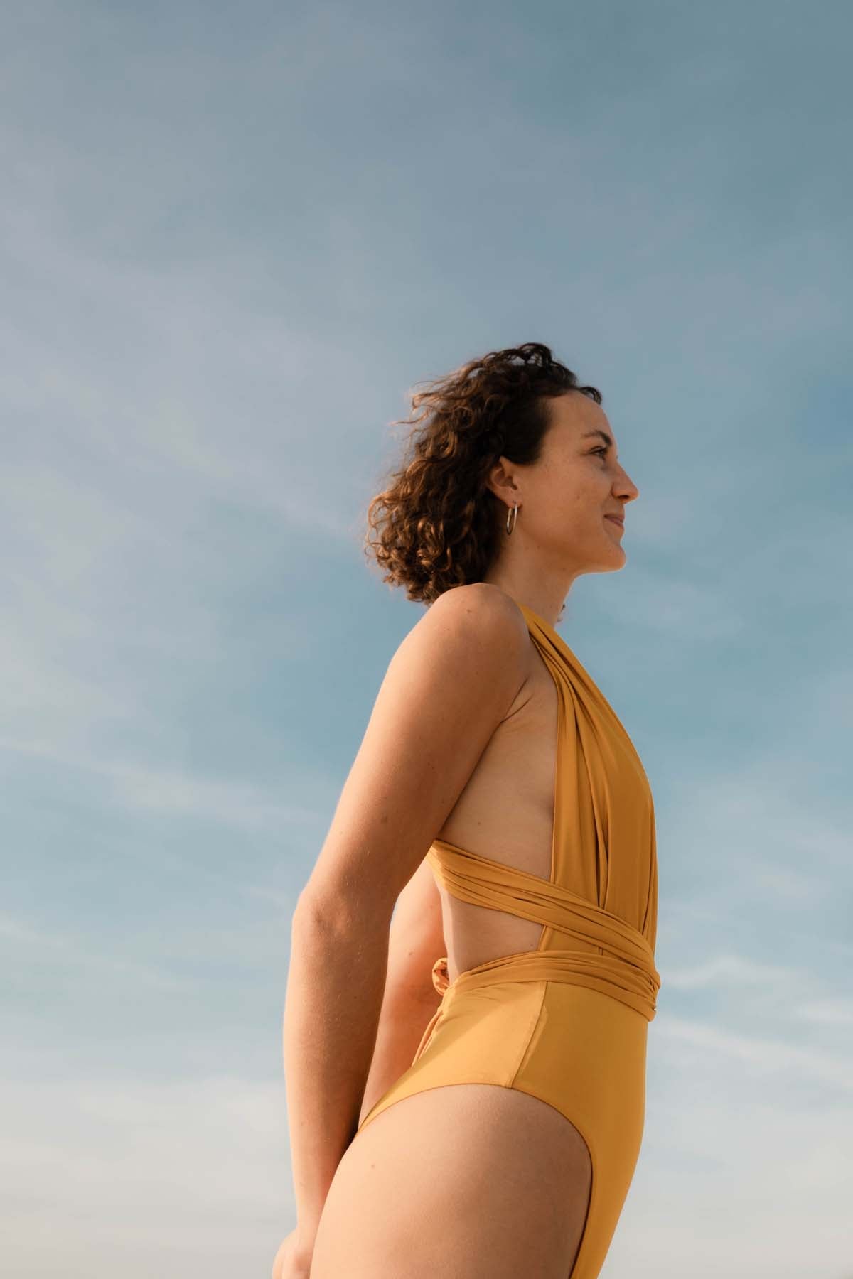 Du kannst unseren Swimsuit auch umgekehrt tragen - also das Vorderteil mit den Bindebahnen am Rücken. So ist der Po-Teil vorne und die Bahnen starten hinten. So ist der Po-Teil etwas cheekier zu tragen. Bedeckt aber noch immer schön den Po.