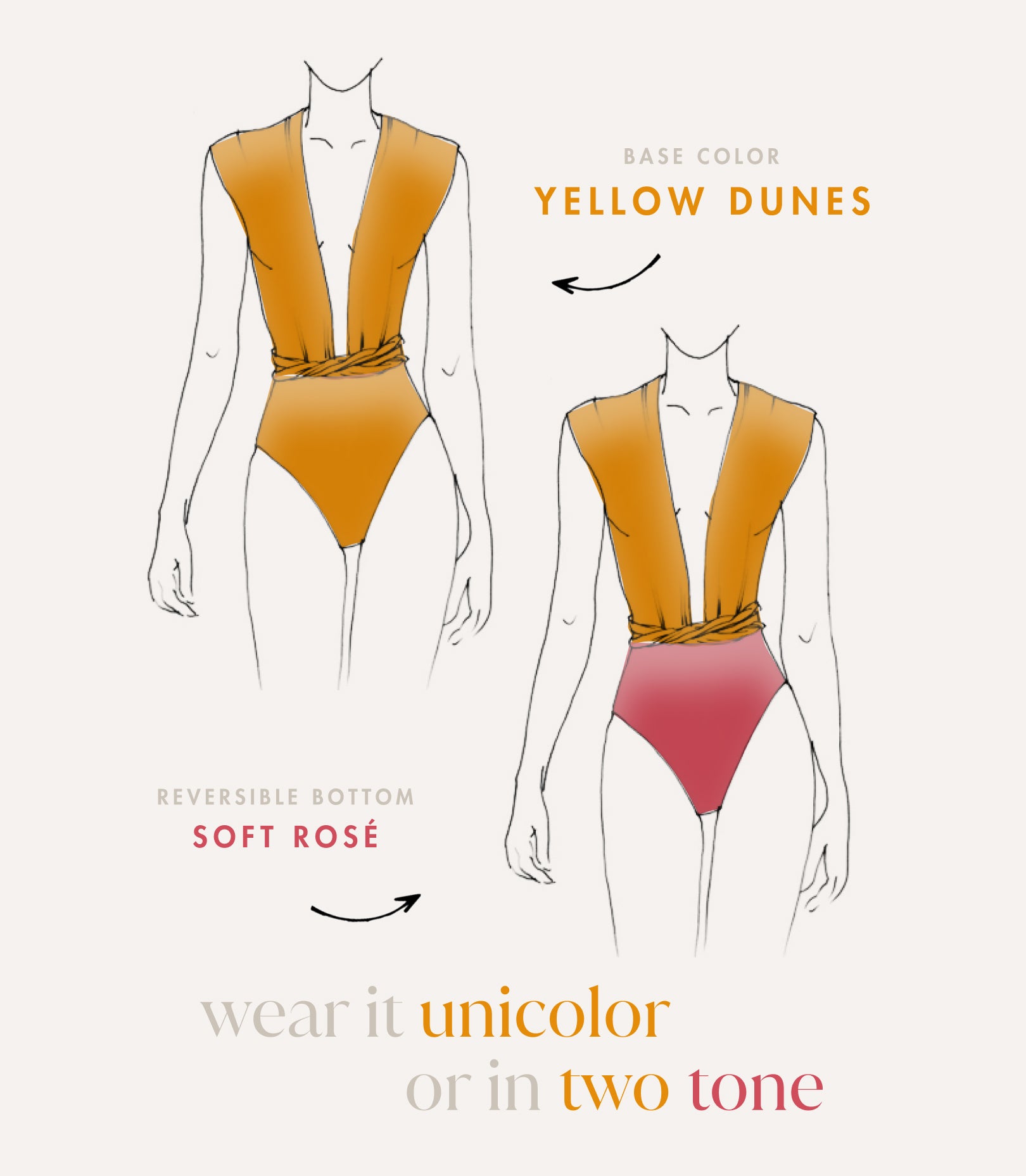 Die Außenhose und Oberteilbahnen sind Gelb. Das Innenhöschen Altrosa. So kannst du unseren Swimsuit entweder Unicolour oder two tone tragen.