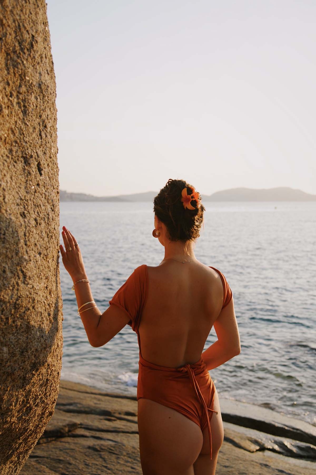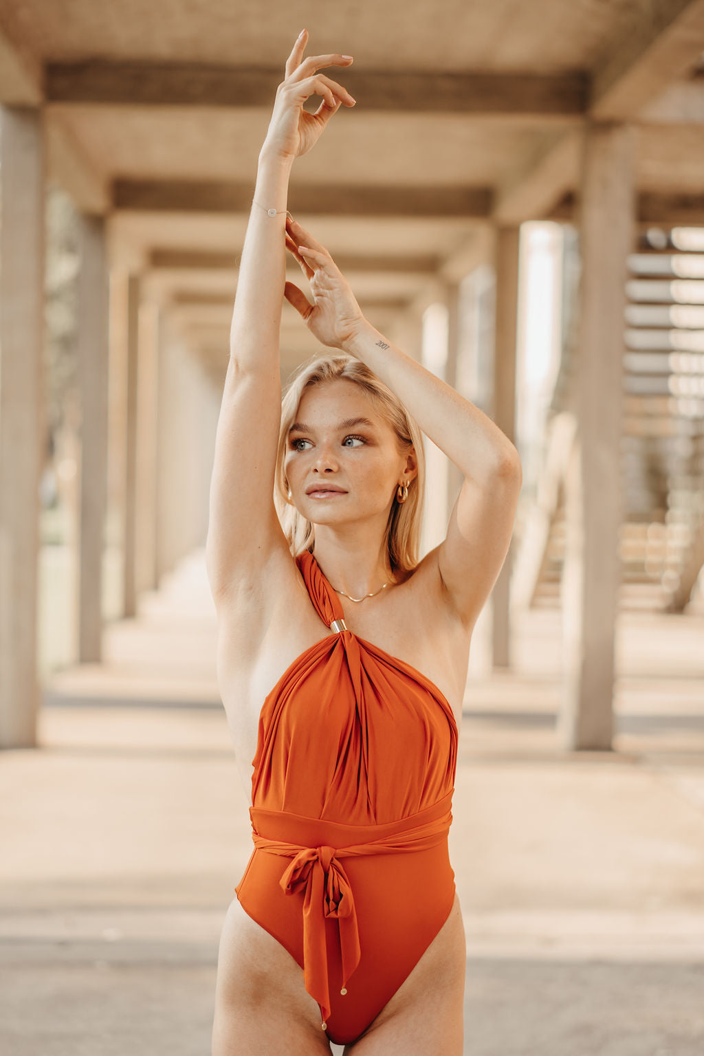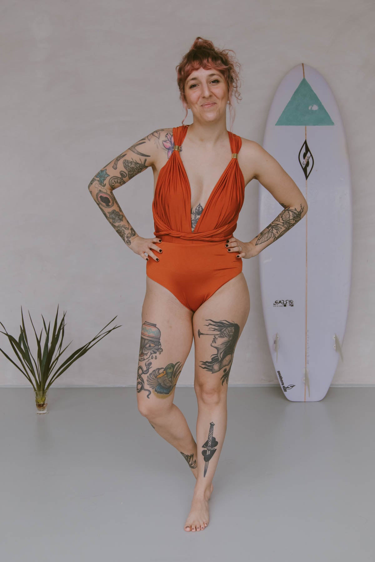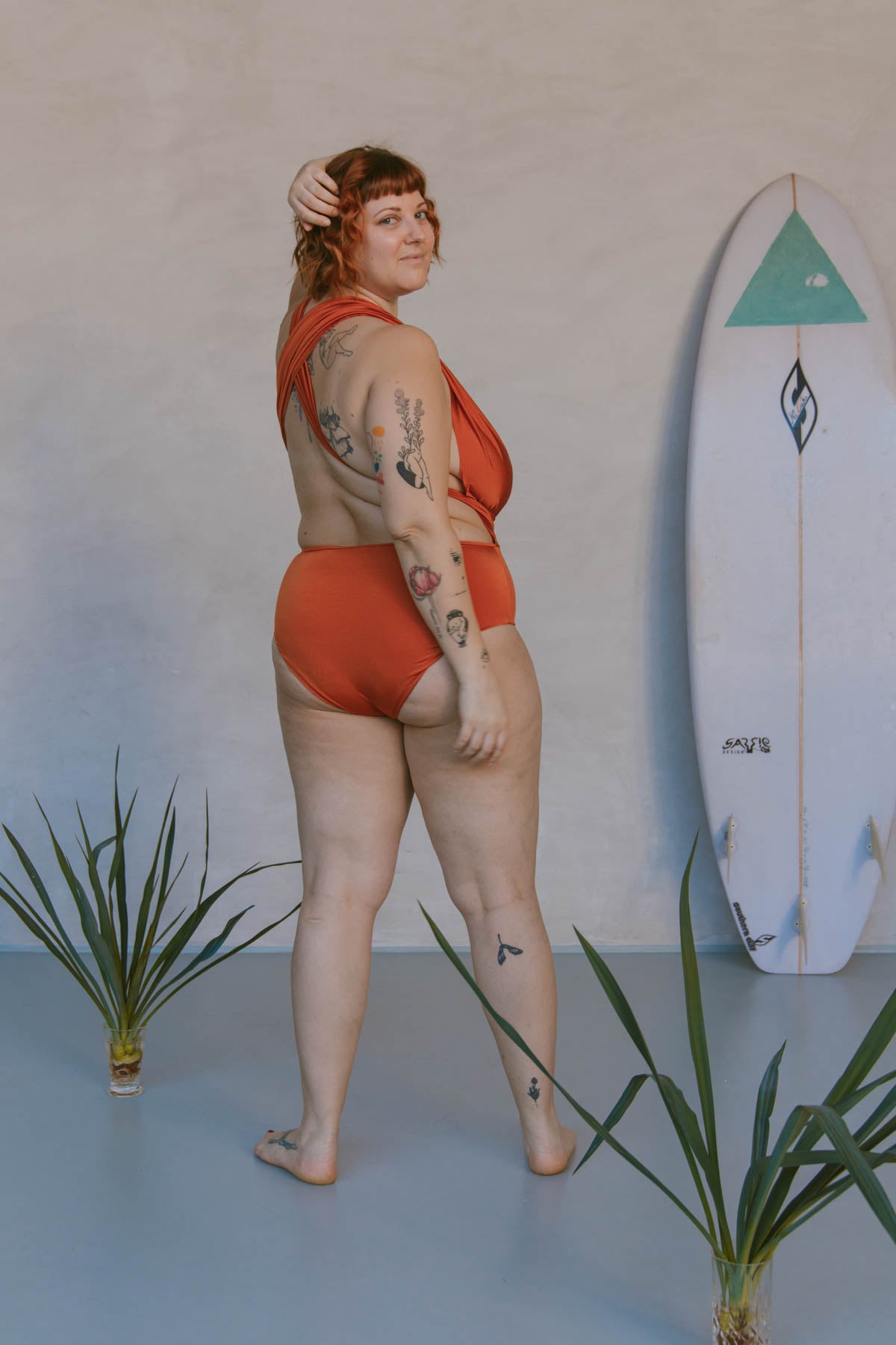 Du kannst unseren Swimsuit klassisch mit 3/5 Po-Bedeckung tragen, oder auch höher gezogen etwas sexier mit “cheeky shape”.