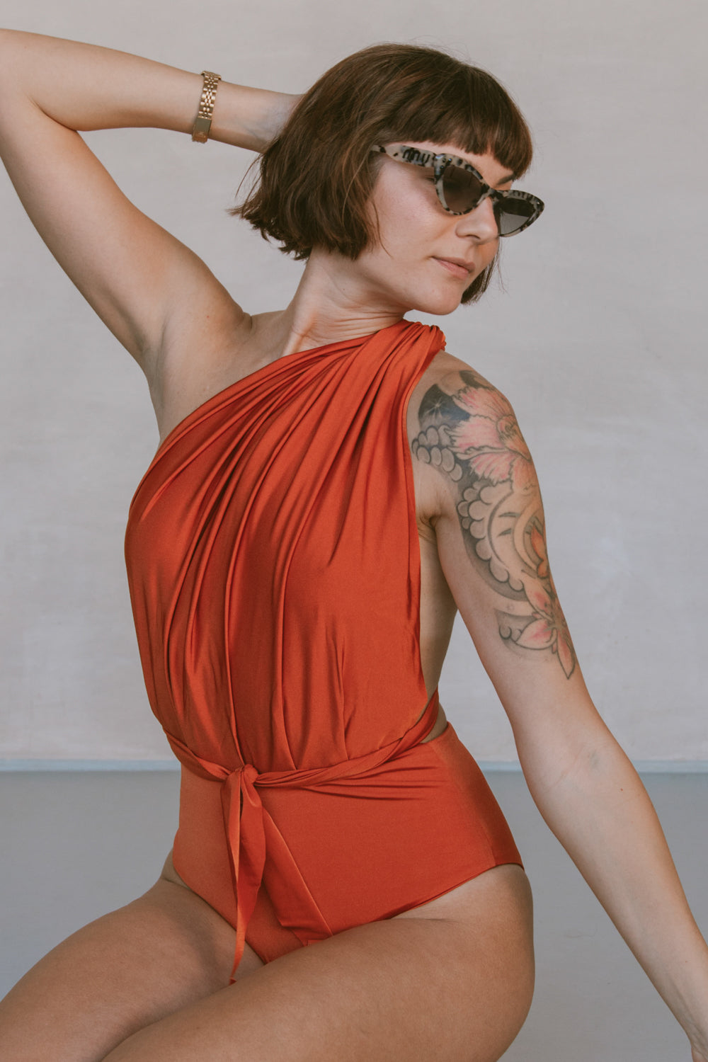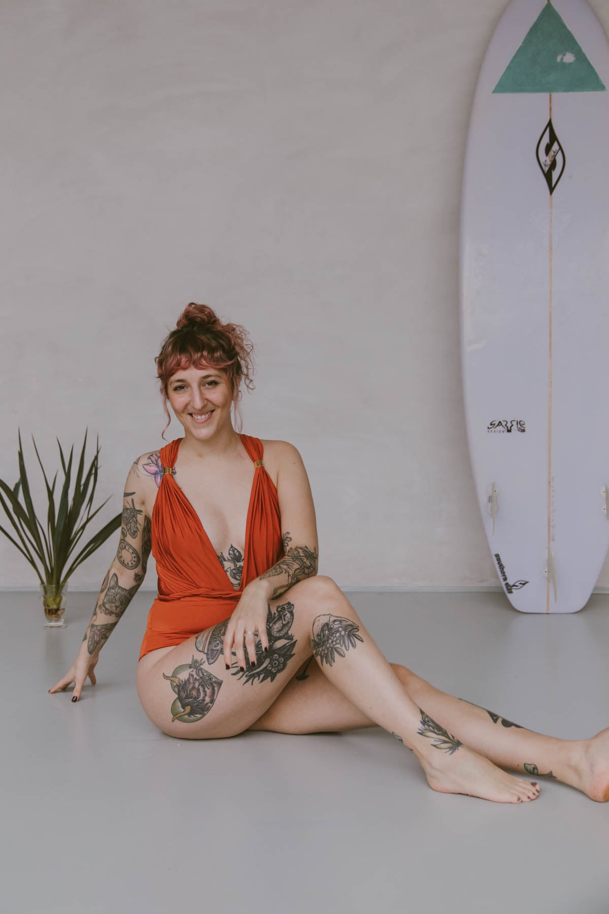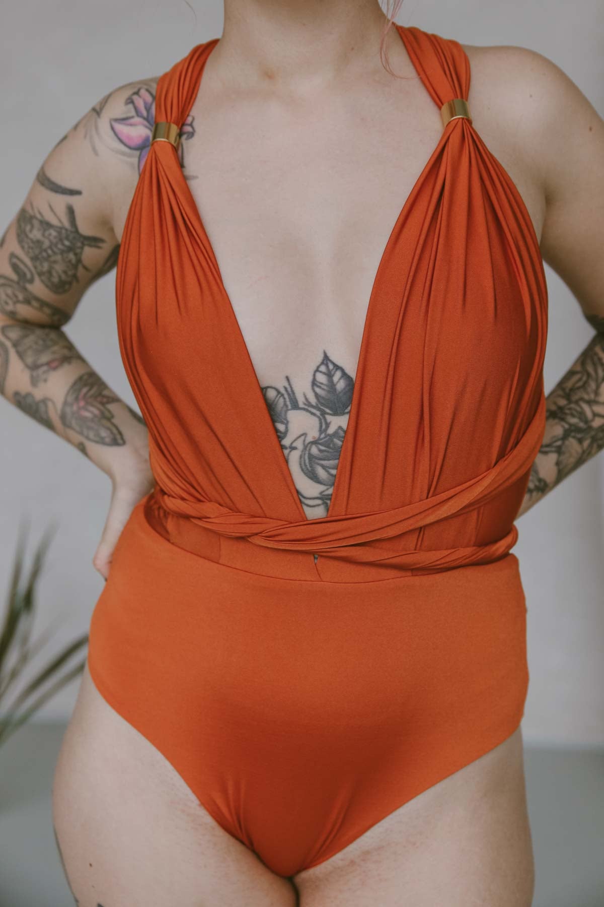 Du kannst unseren Swimsuit klassisch mit 3/5 Po-Bedeckung tragen, oder auch höher gezogen etwas sexier mit “cheeky shape”.