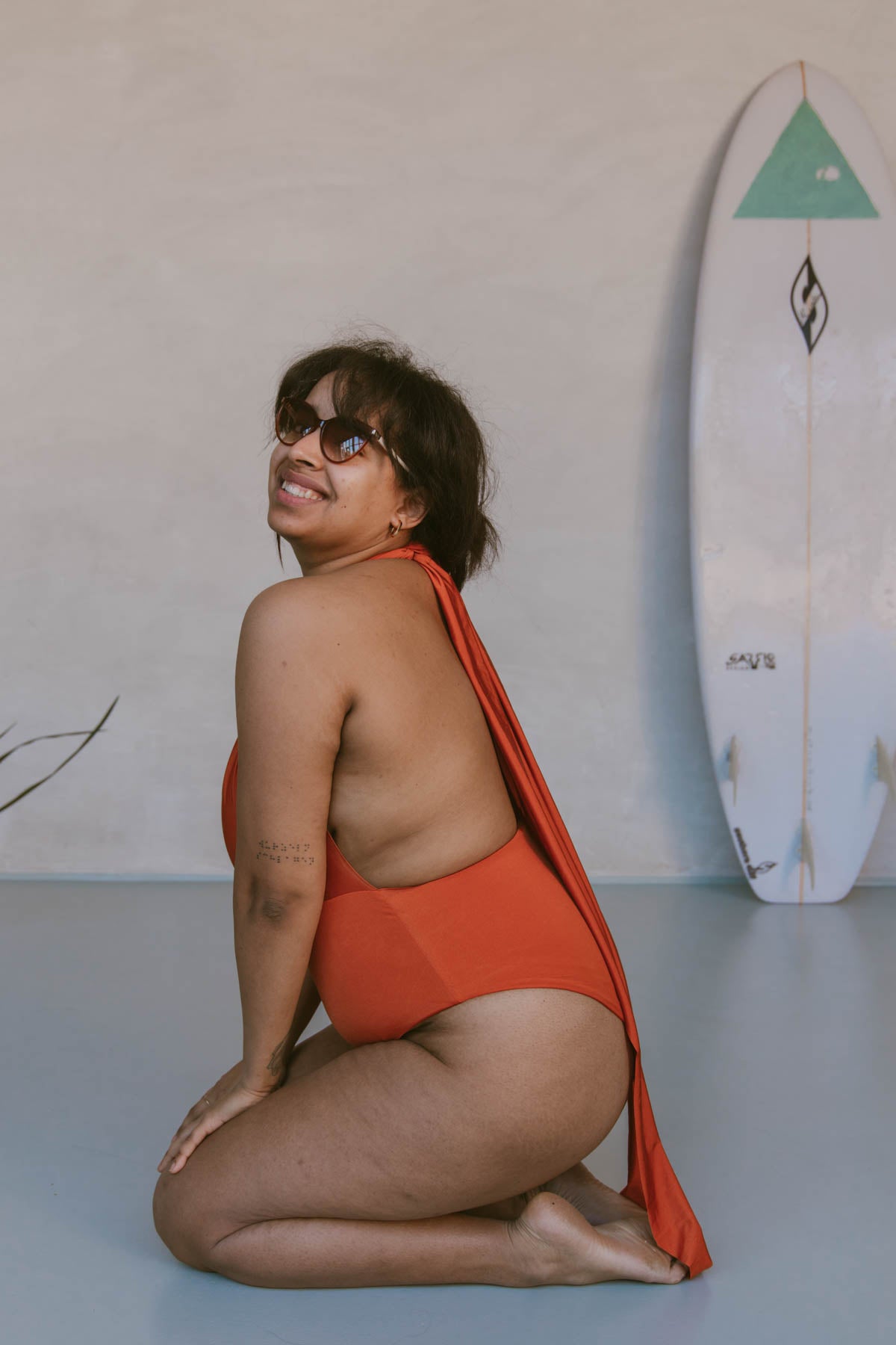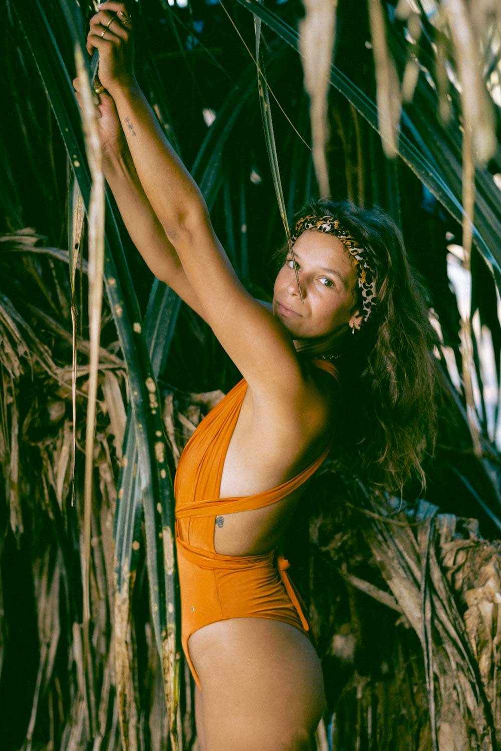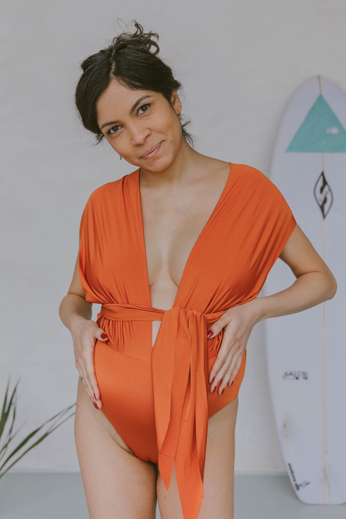 Du kannst unseren Swimsuit auch umgekehrt tragen - also das Vorderteil mit den Bindebahnen am Rücken. So ist der Po-Teil vorne und die Bahnen starten hinten. So ist der Po-Teil etwas cheekier zu tragen. Bedeckt aber noch immer schön den Po.