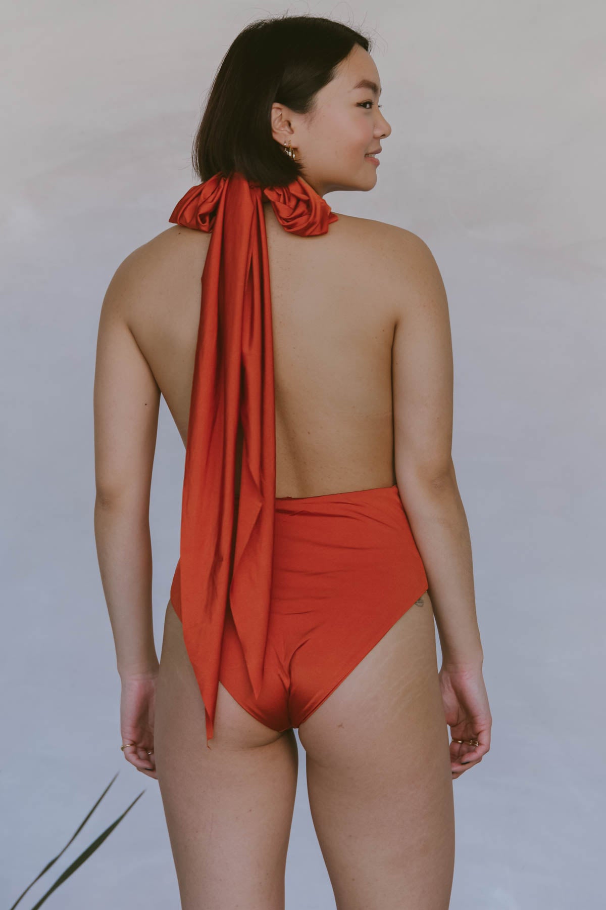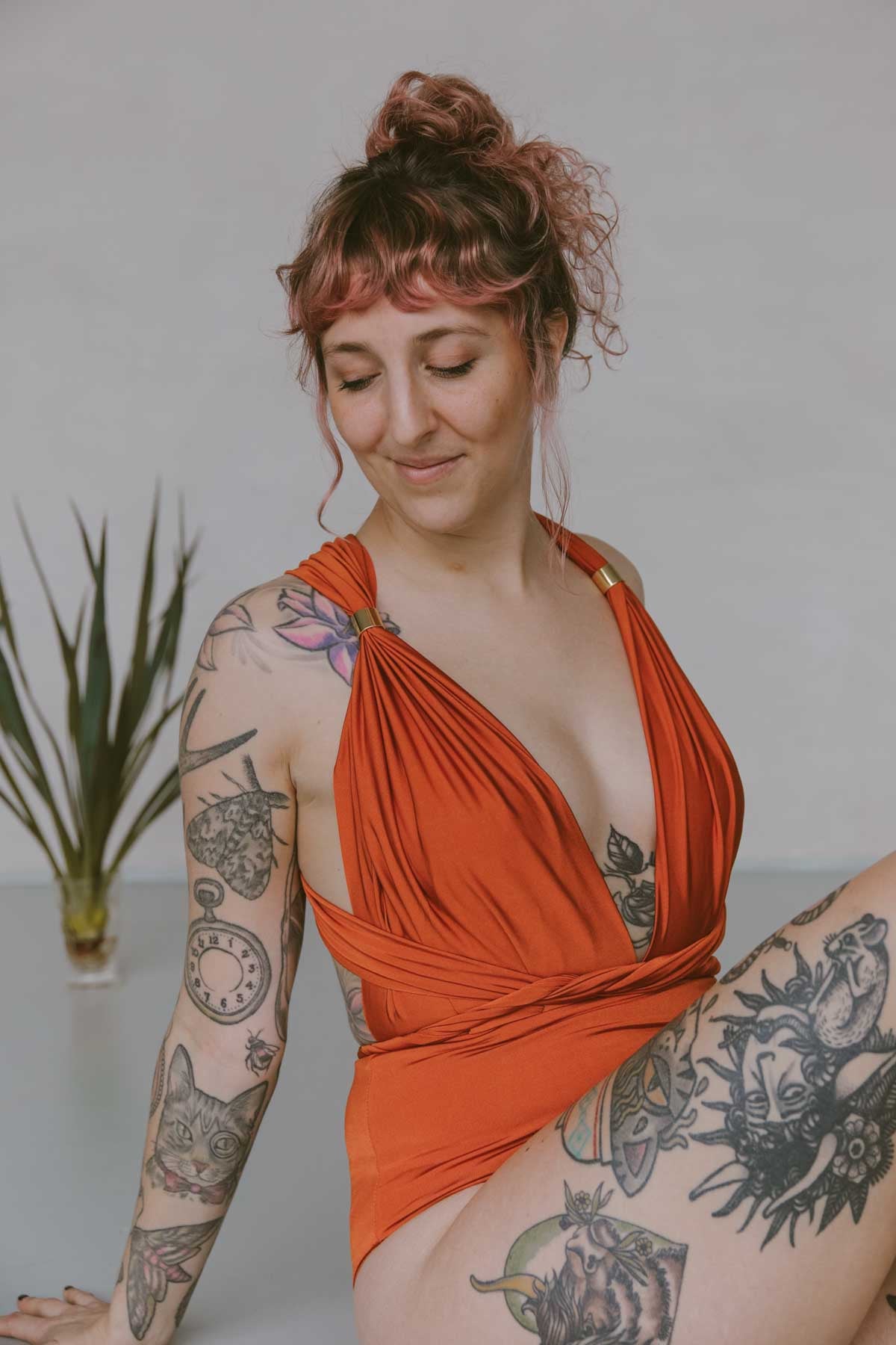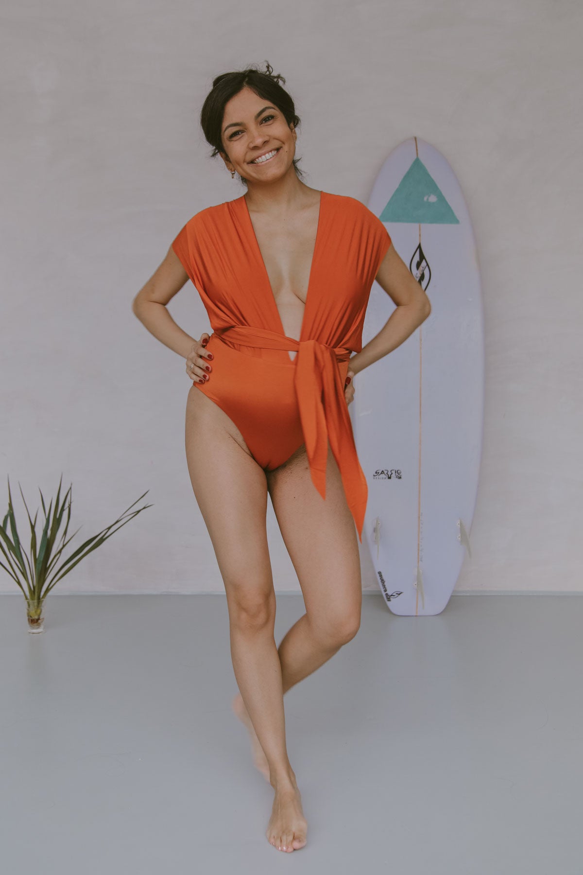 Du kannst unseren Swimsuit auch umgekehrt tragen - also das Vorderteil mit den Bindebahnen am Rücken. So ist der Po-Teil vorne und die Bahnen starten hinten. So ist der Po-Teil etwas cheekier zu tragen. Bedeckt aber noch immer schön den Po.