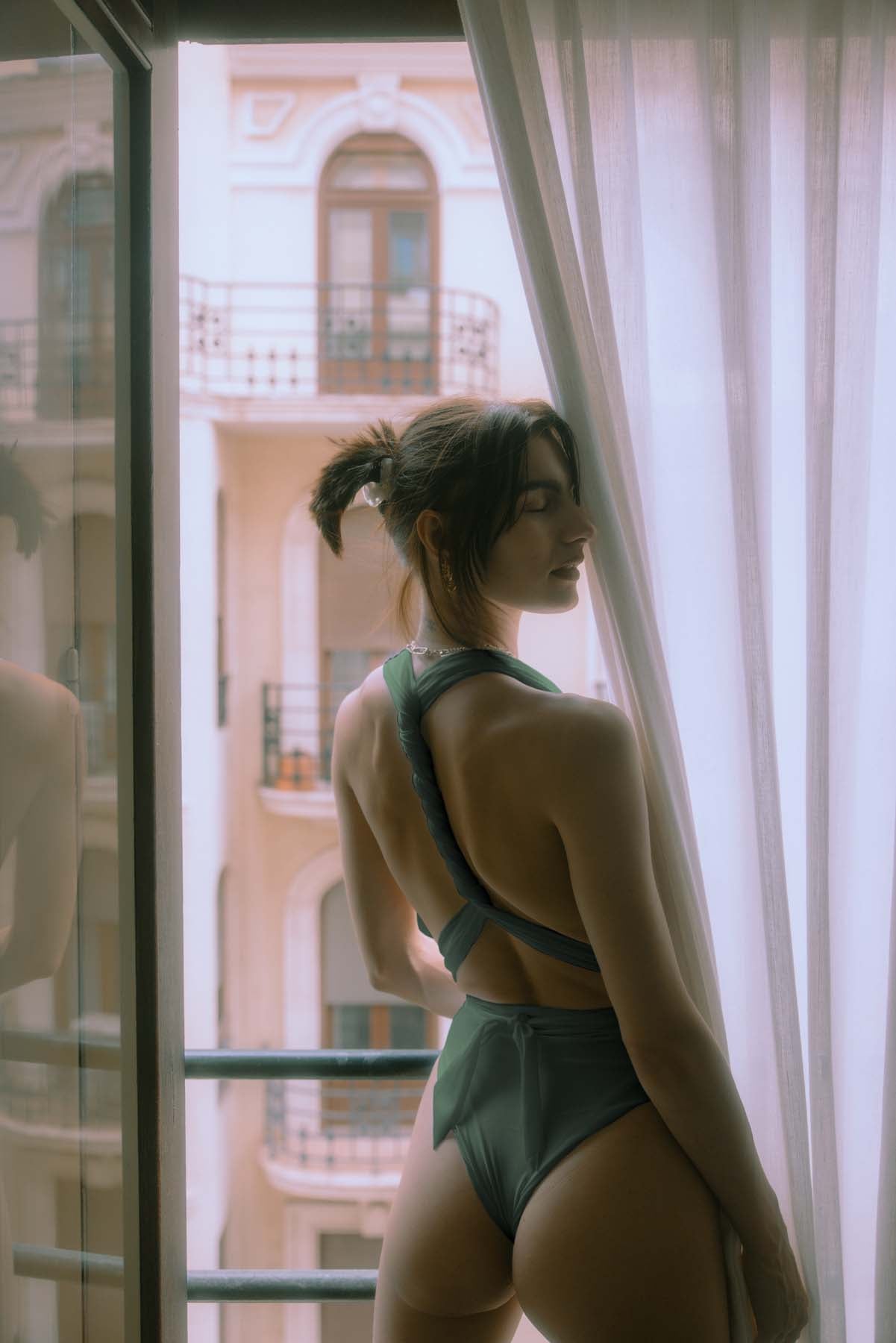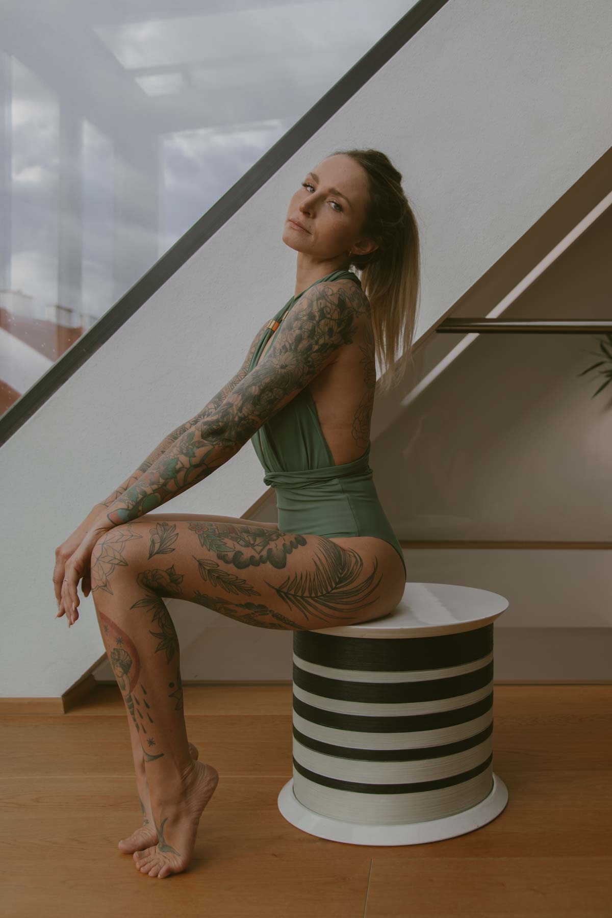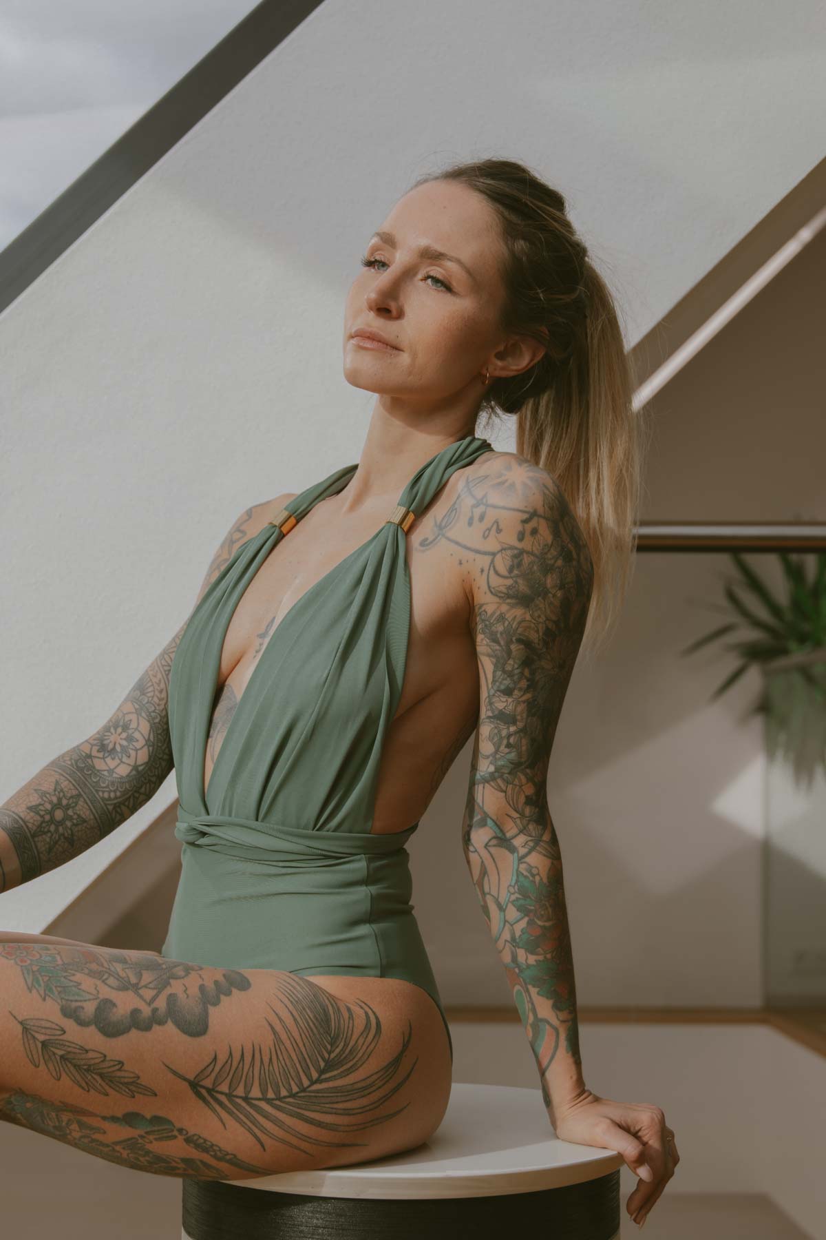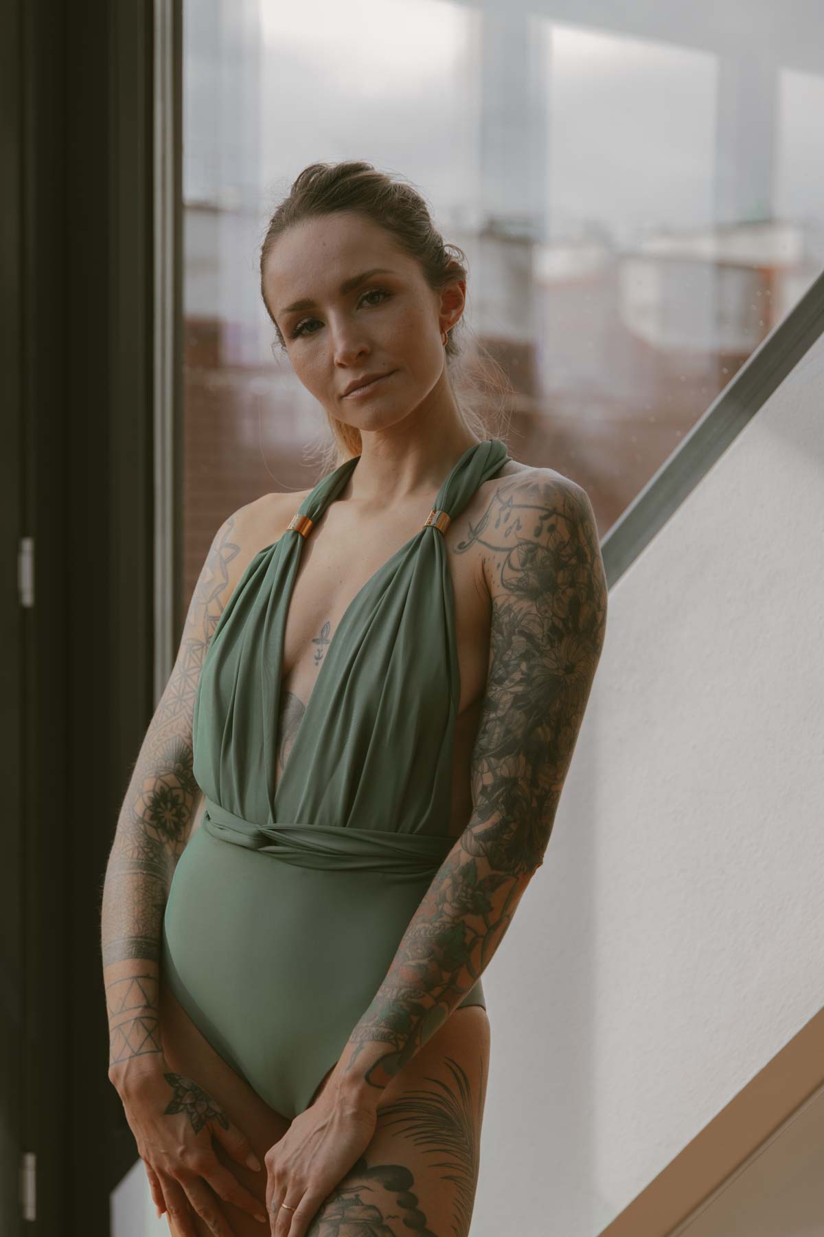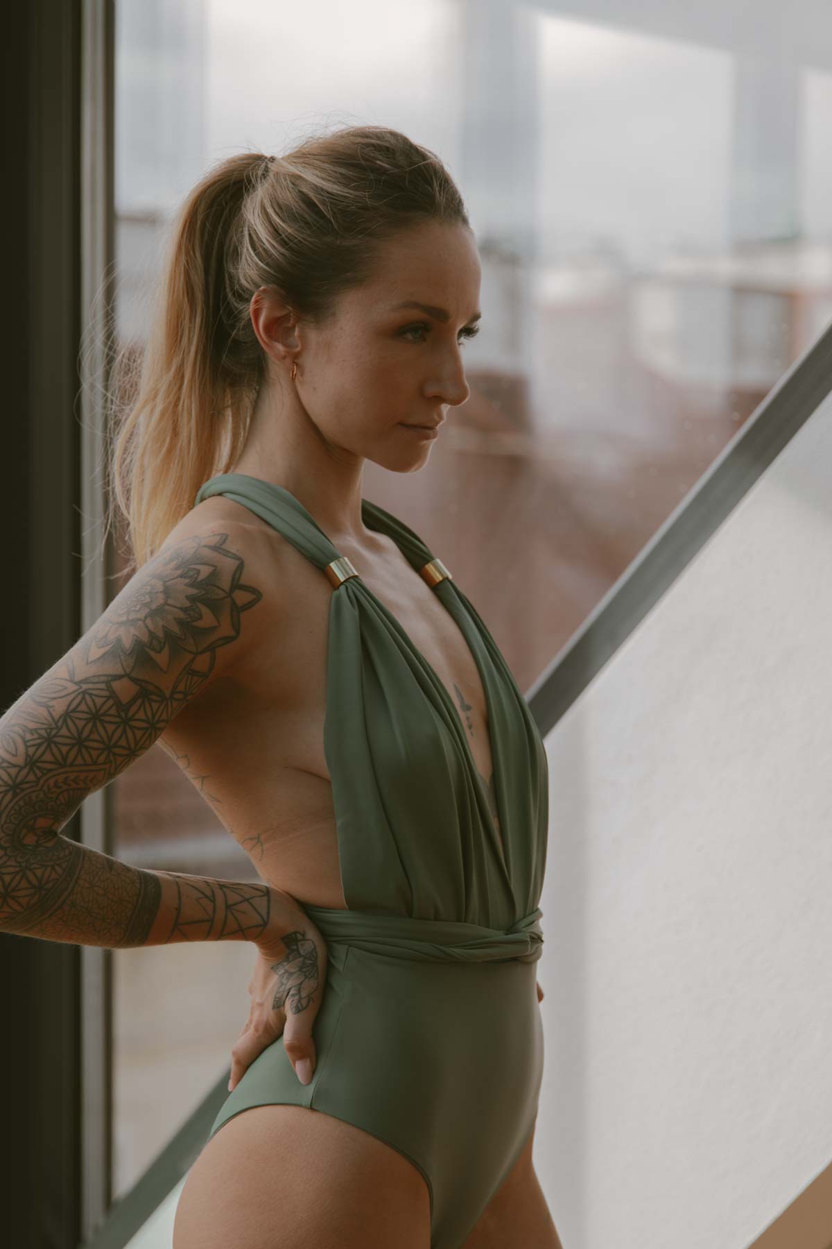 Du kannst unseren Swimsuit klassisch mit 3/5 Po-Bedeckung tragen, oder auch höher gezogen etwas sexier mit “cheeky shape”.