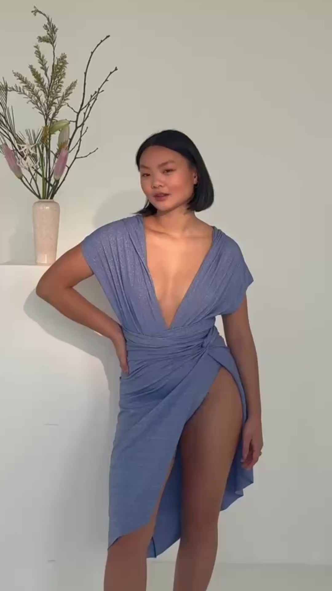 Unser Sparkle-Rock ist mit einer seitlichen Drehung vernäht und öffnet sich unter dem Knoten mit einem langen Seitenschlitz. Du kannst den Rock entweder High Waist um die Taille oder Low Waist um die Hüfte tragen.