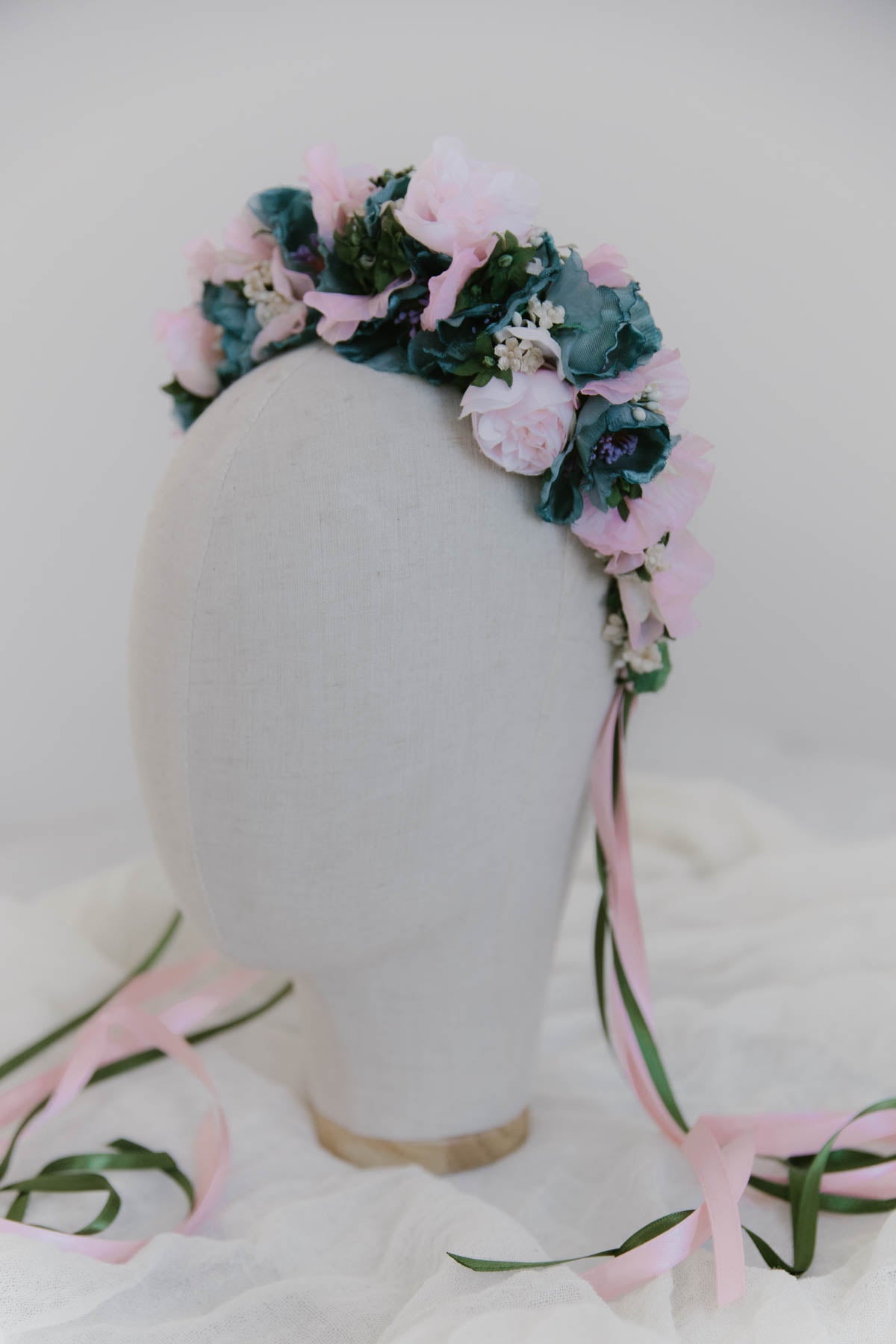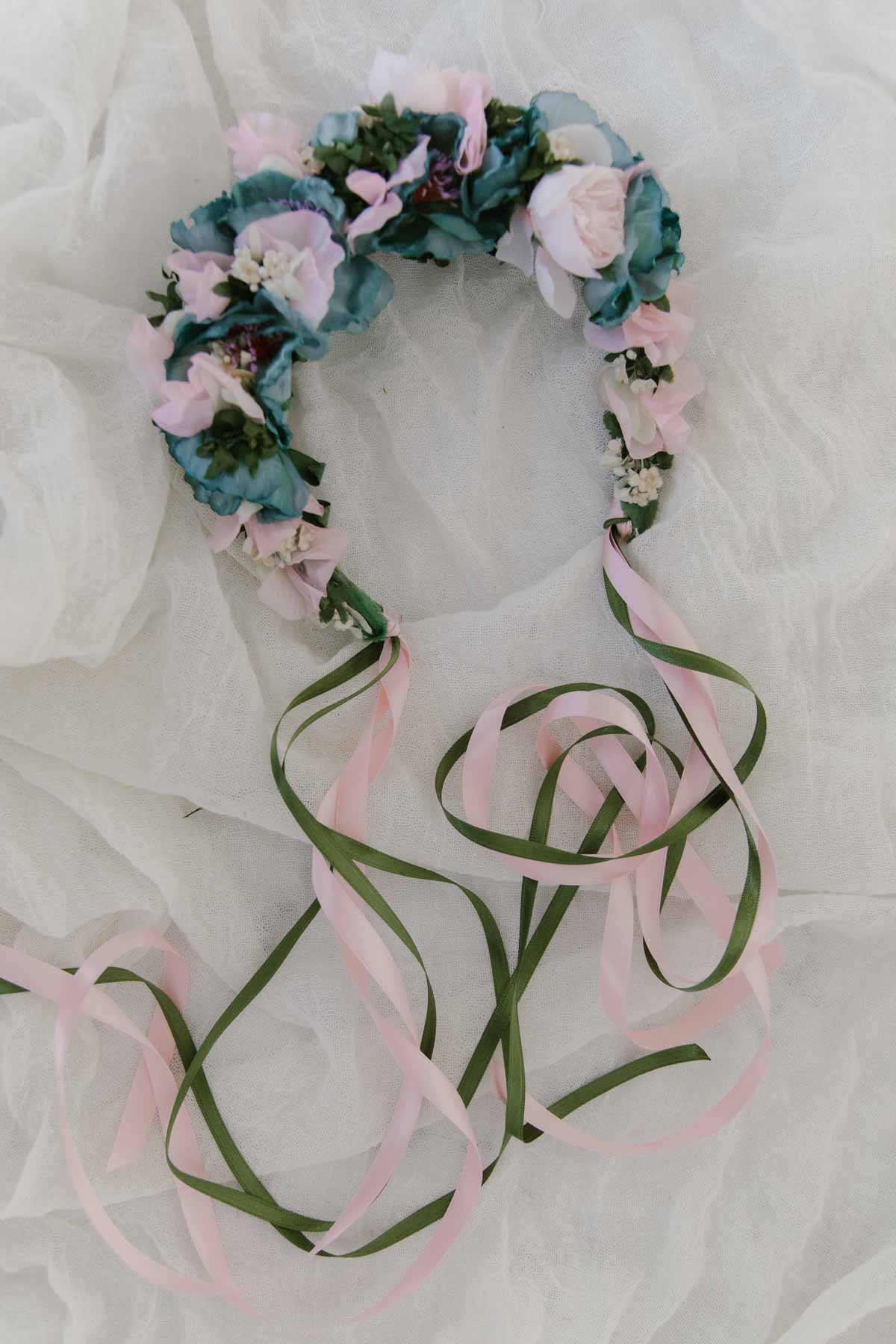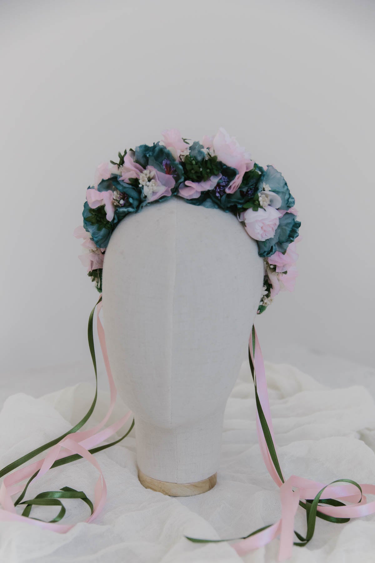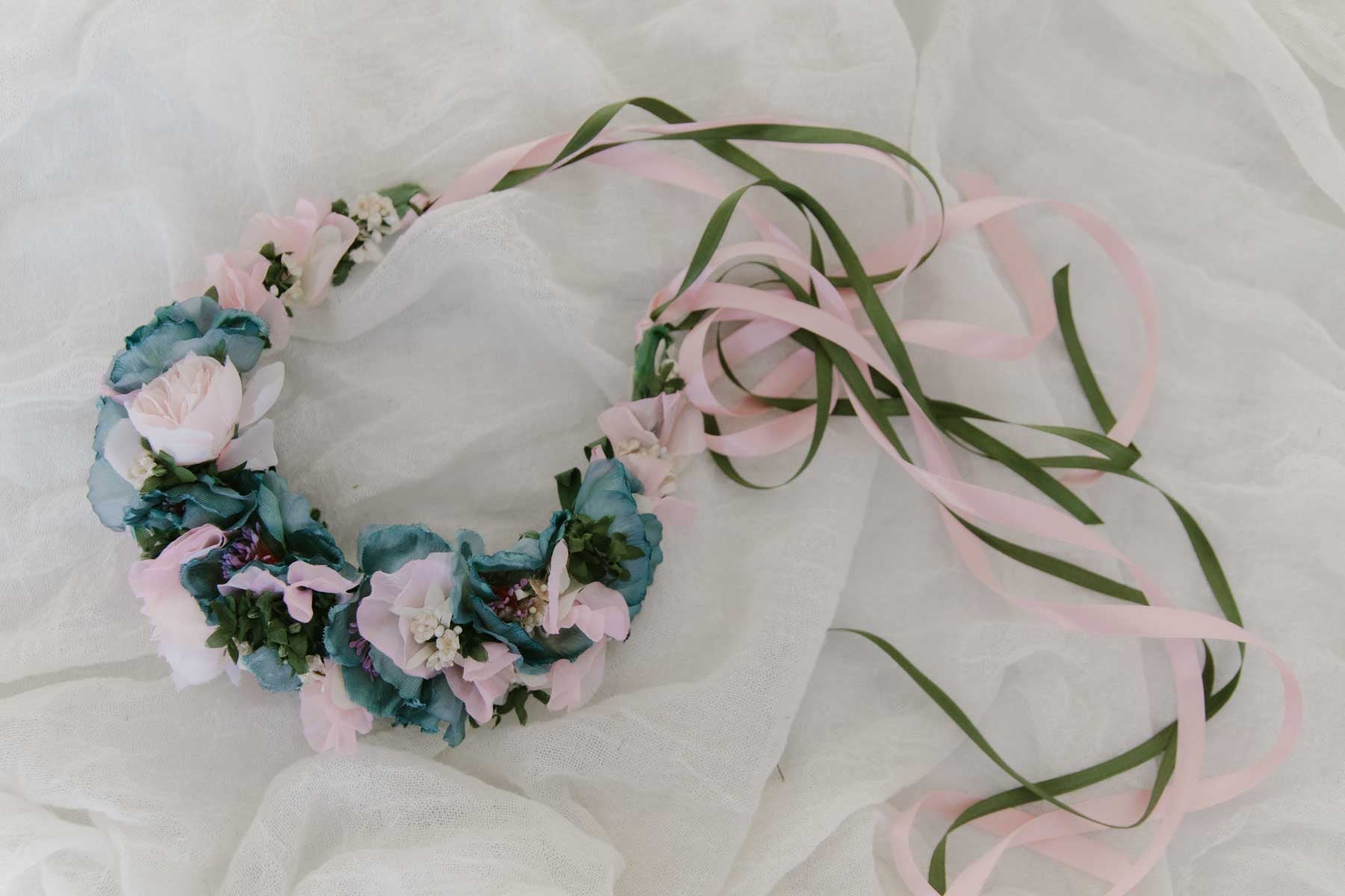 Flowercrown Alesia ist eine romantische Blumenkrone für die Ewigkeit die niemals verblüht. Handgemacht in Wien aus vintage Seidenblumen im Wiener Atelier von We Are Flowergirls. Zum Binden mit Satinbändern aus der Schweiz.