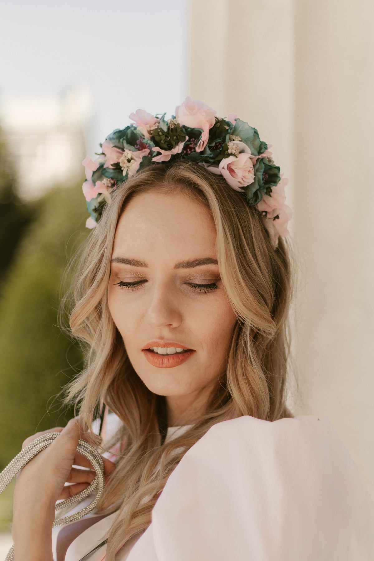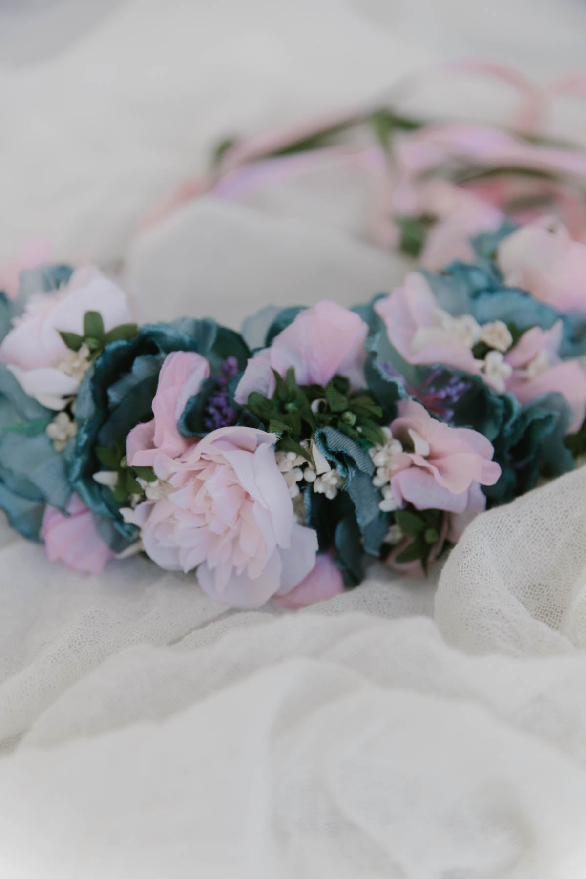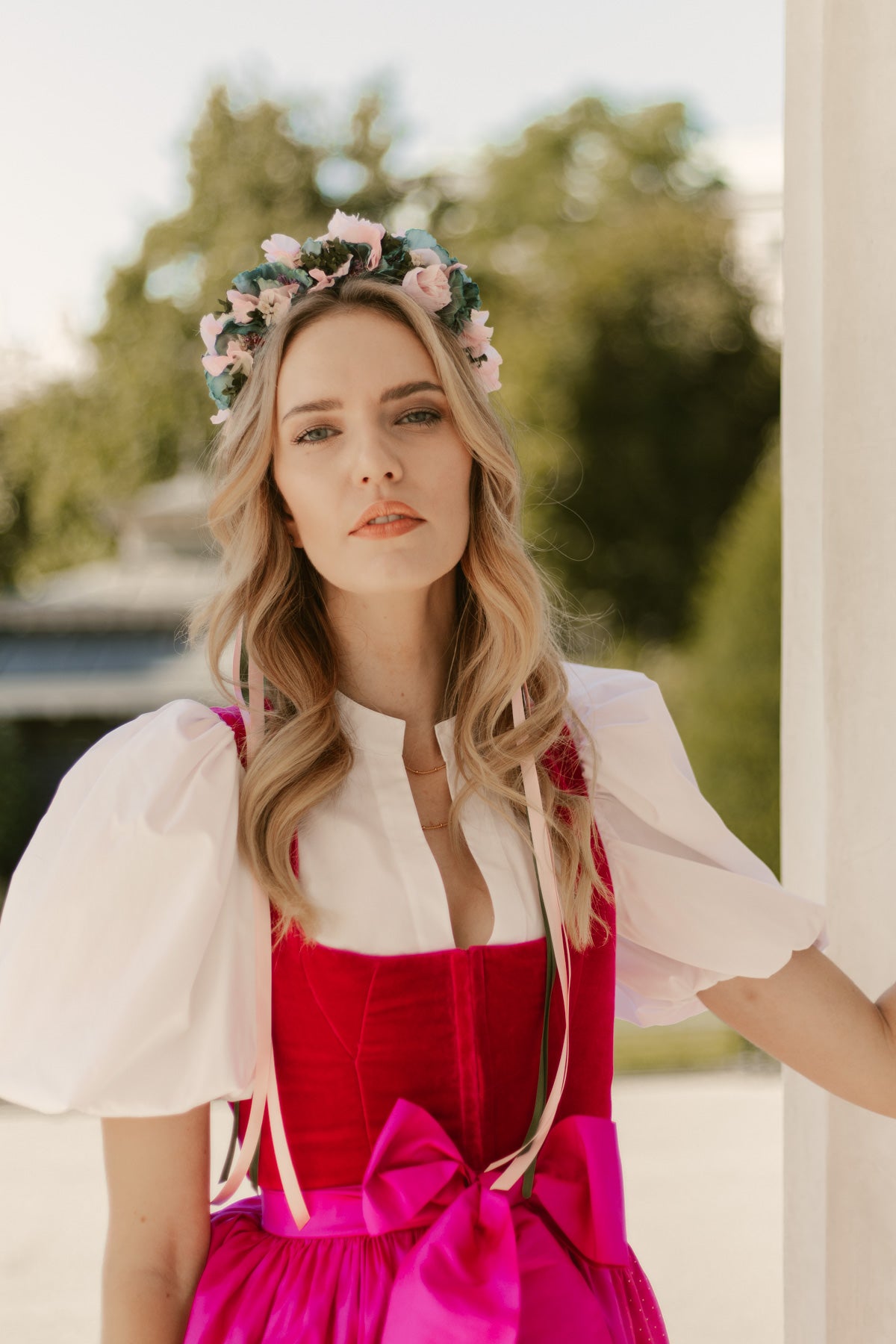 Flowercrown Alesia ist eine romantische Blumenkrone für die Ewigkeit die niemals verblüht. Handgemacht in Wien aus vintage Seidenblumen im Wiener Atelier von We Are Flowergirls. Zum Binden mit Satinbändern aus der Schweiz.