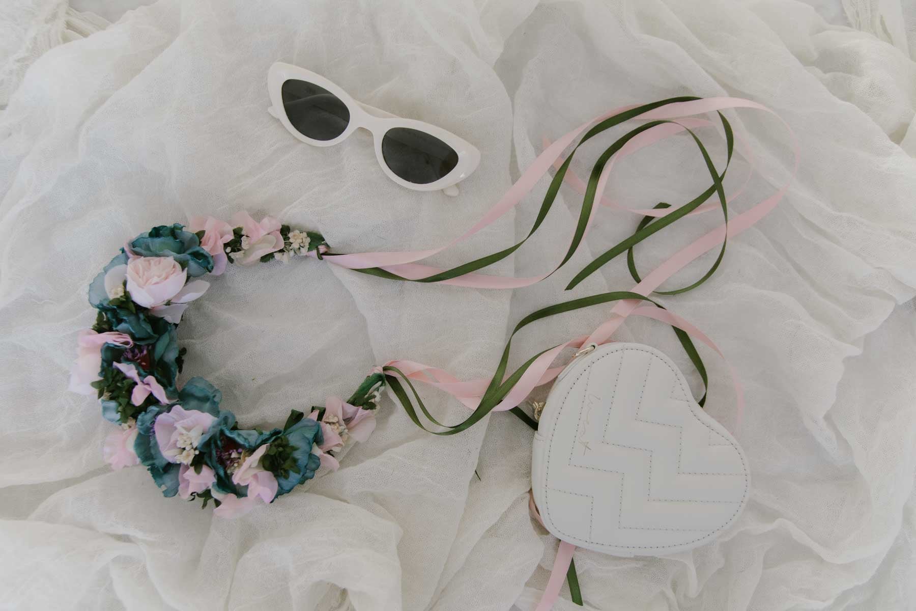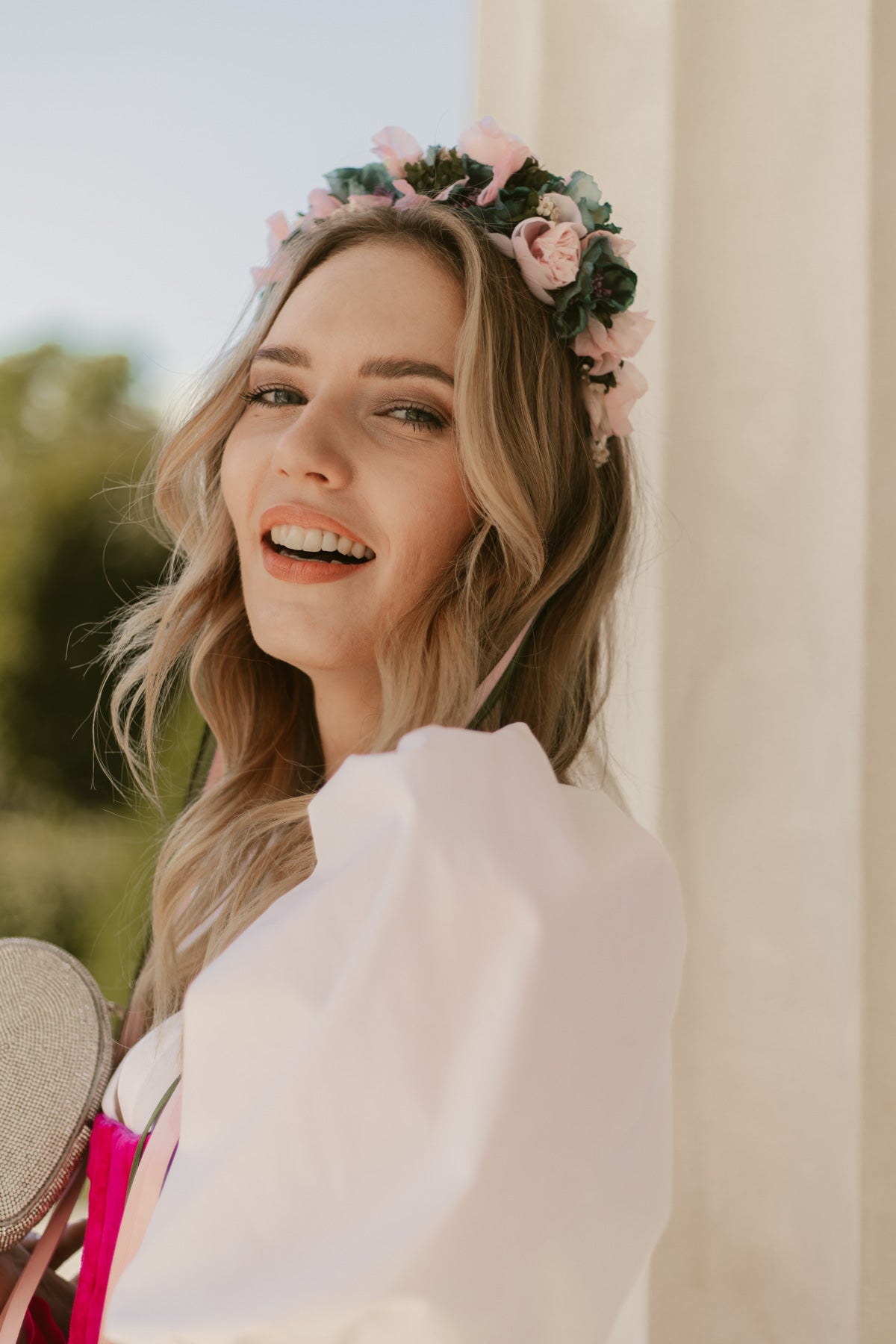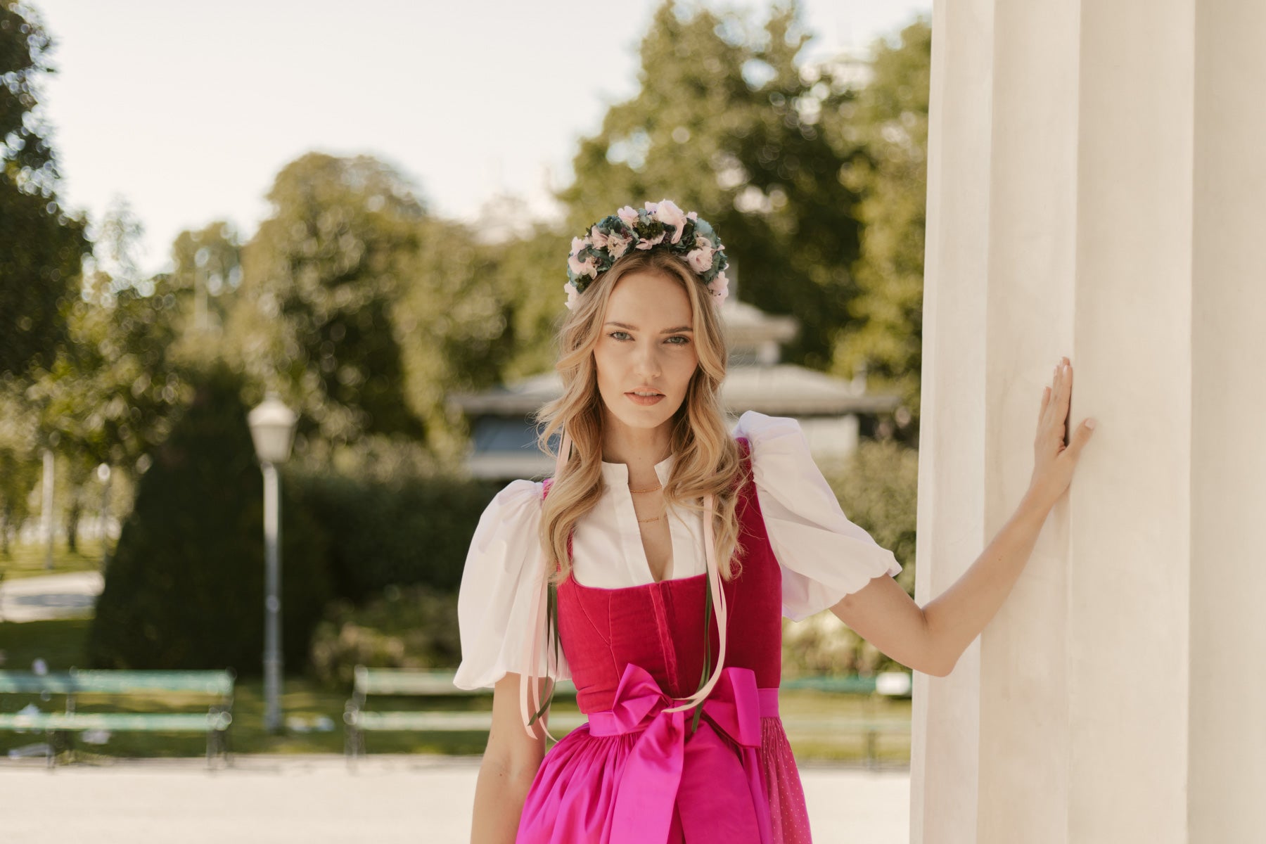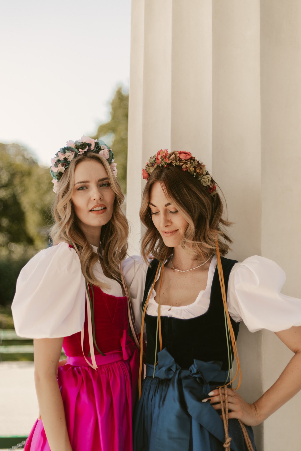 Flowercrown Alesia ist eine romantische Blumenkrone für die Ewigkeit die niemals verblüht. Handgemacht in Wien aus vintage Seidenblumen im Wiener Atelier von We Are Flowergirls. Zum Binden mit Satinbändern aus der Schweiz.