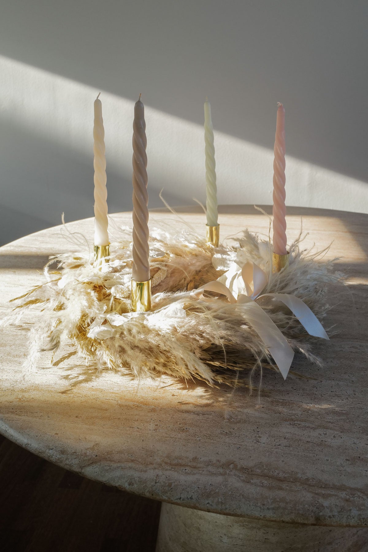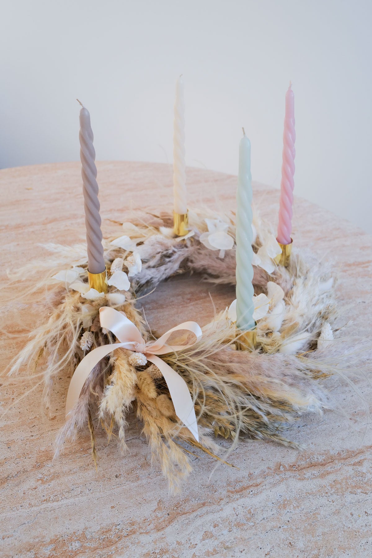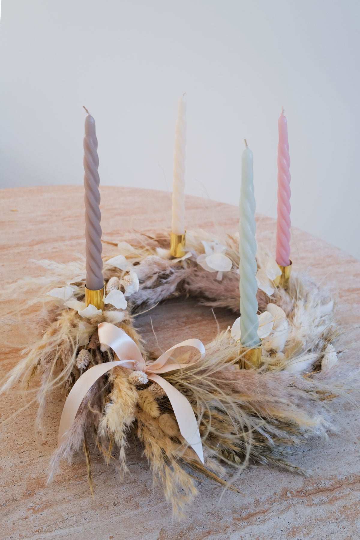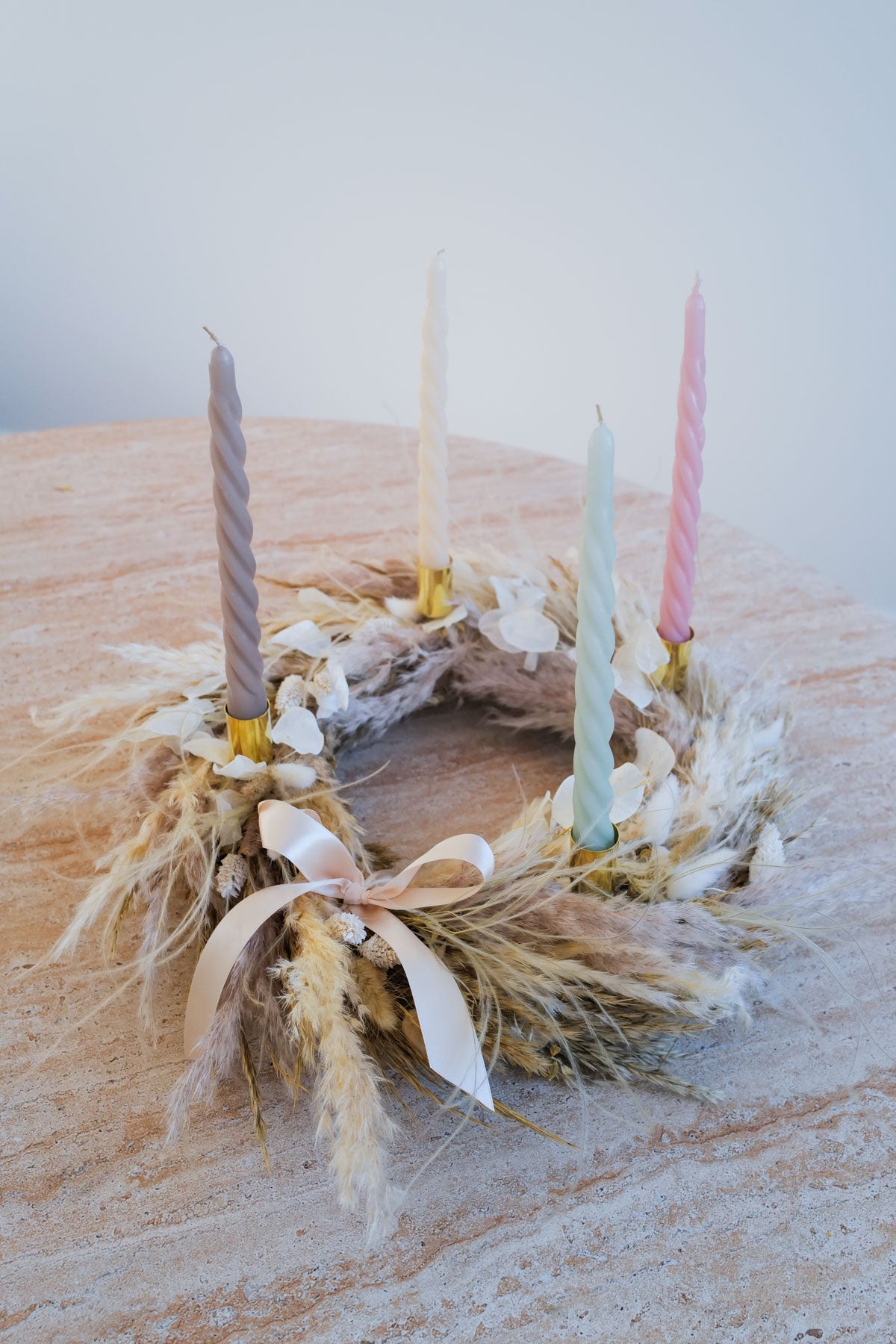 Mit unsere Kerzentellern und Kerzen kannst deinen Dried Flower Kranz ganz einfach vom Türkranz in einen Adventskranz umbauen. Kerzen & Teller kannst du beim Check Out dazu bestellen.