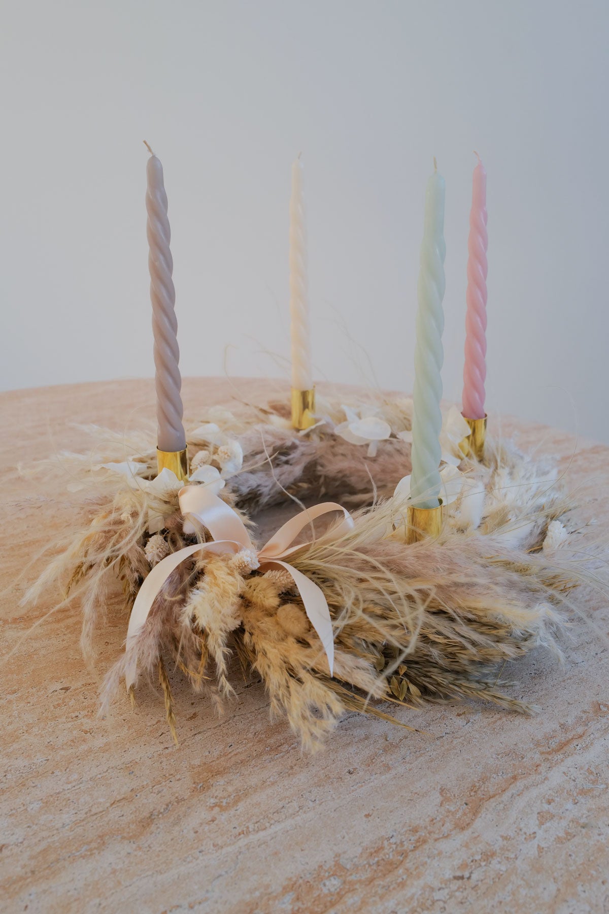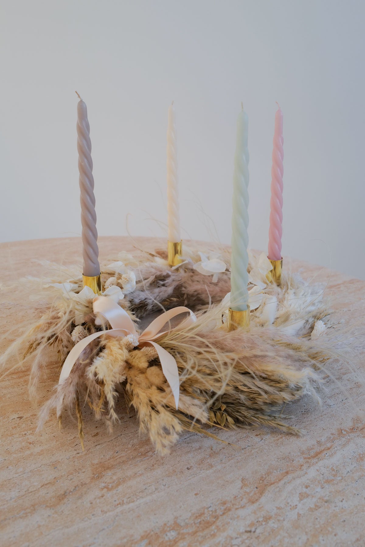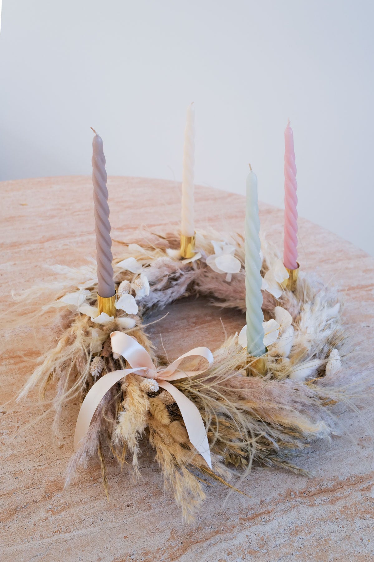 Mit unsere Kerzentellern und Kerzen kannst deinen Dried Flower Kranz ganz einfach vom Türkranz in einen Adventskranz umbauen. Kerzen & Teller kannst du beim Check Out dazu bestellen.