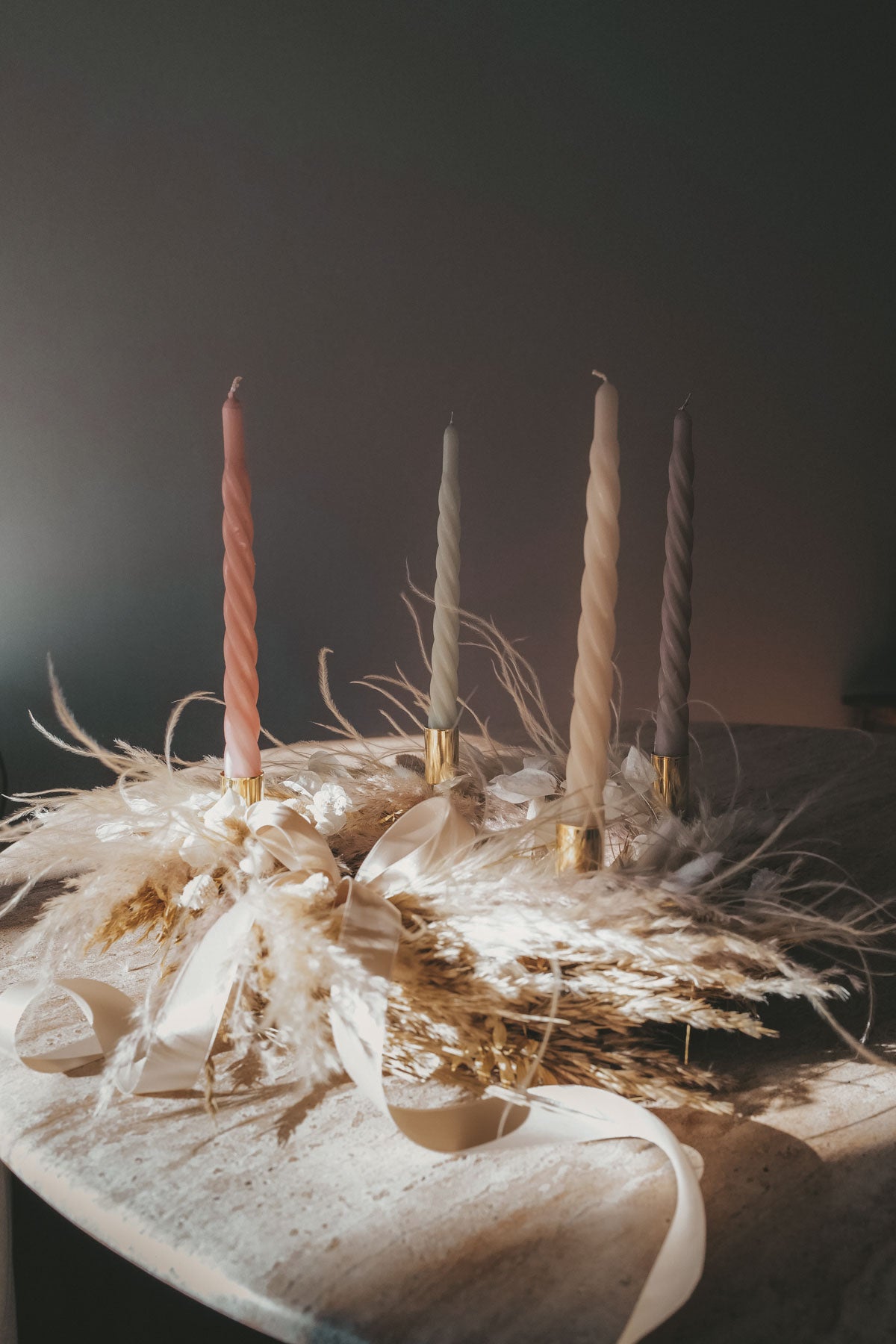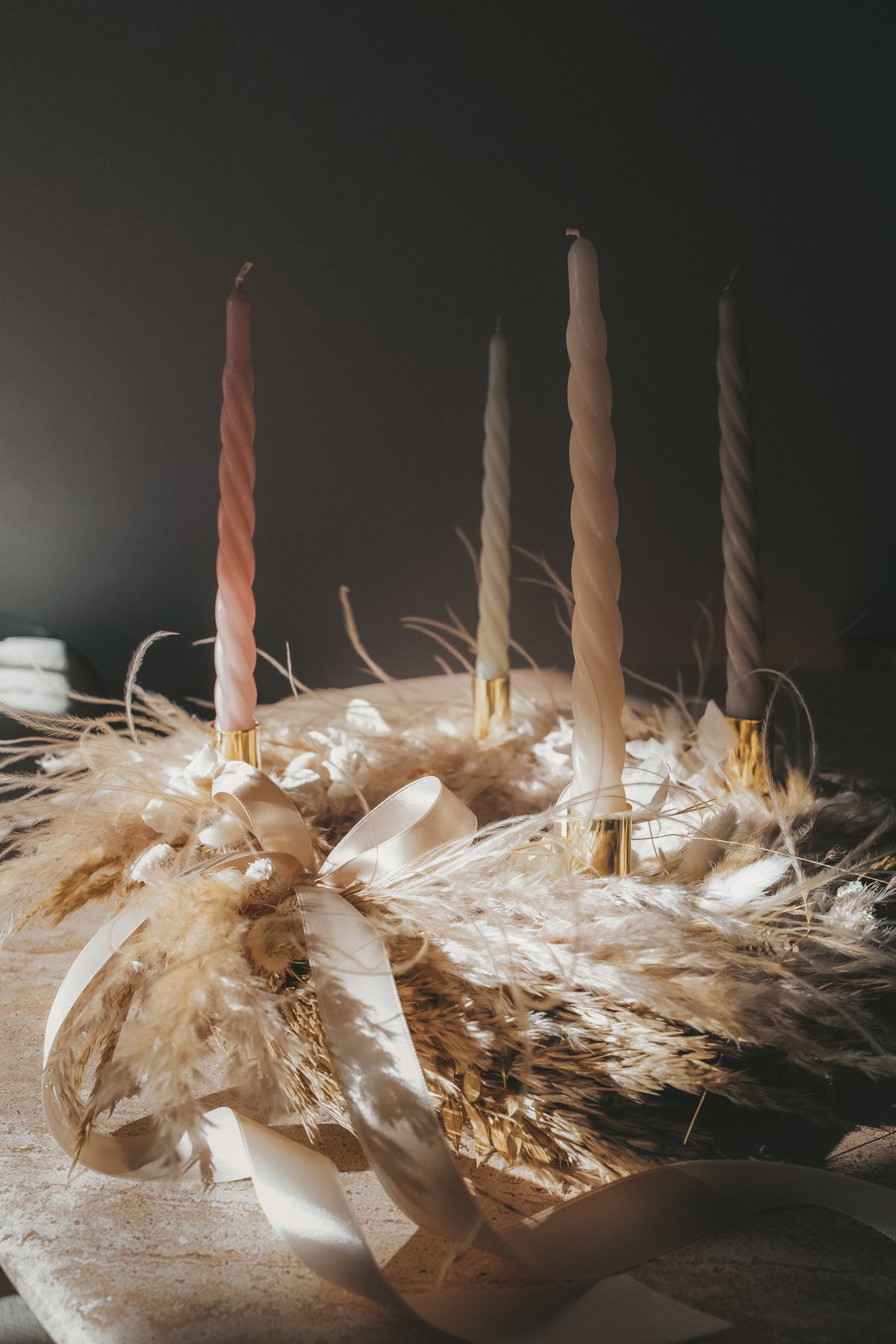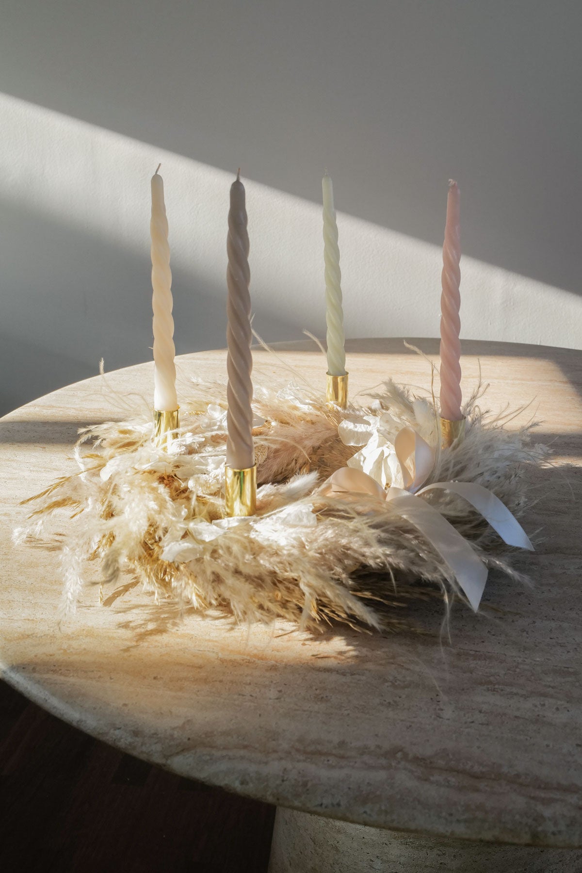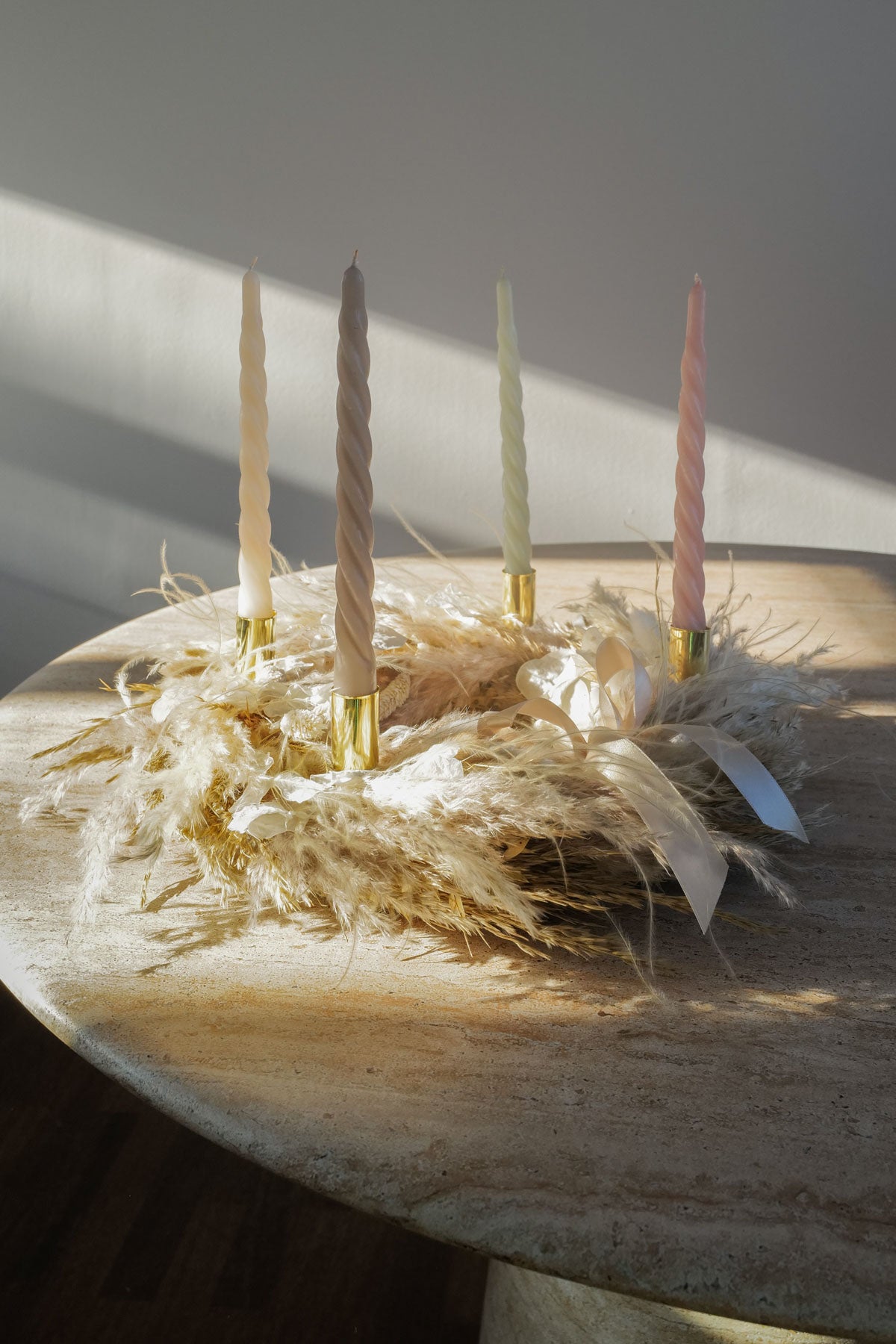 Mit unsere Kerzentellern und Kerzen kannst deinen Dried Flower Kranz ganz einfach vom Türkranz in einen Adventskranz umbauen. Kerzen & Teller kannst du beim Check Out dazu bestellen.