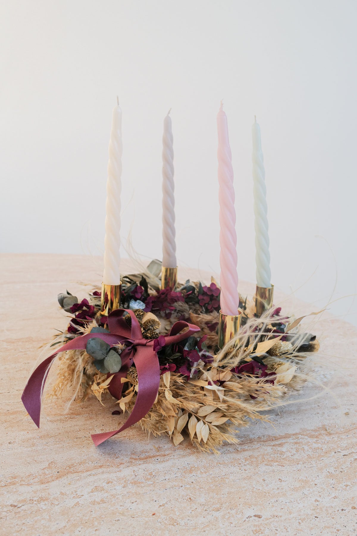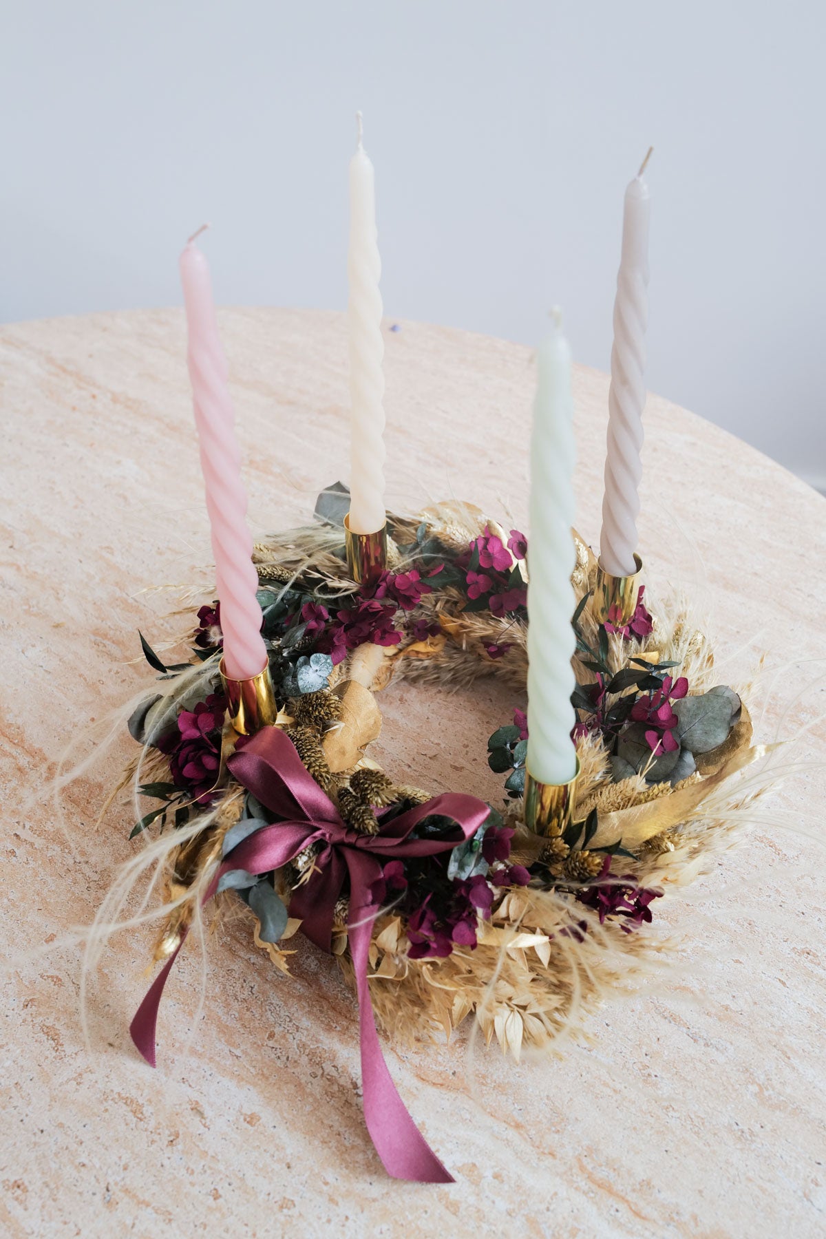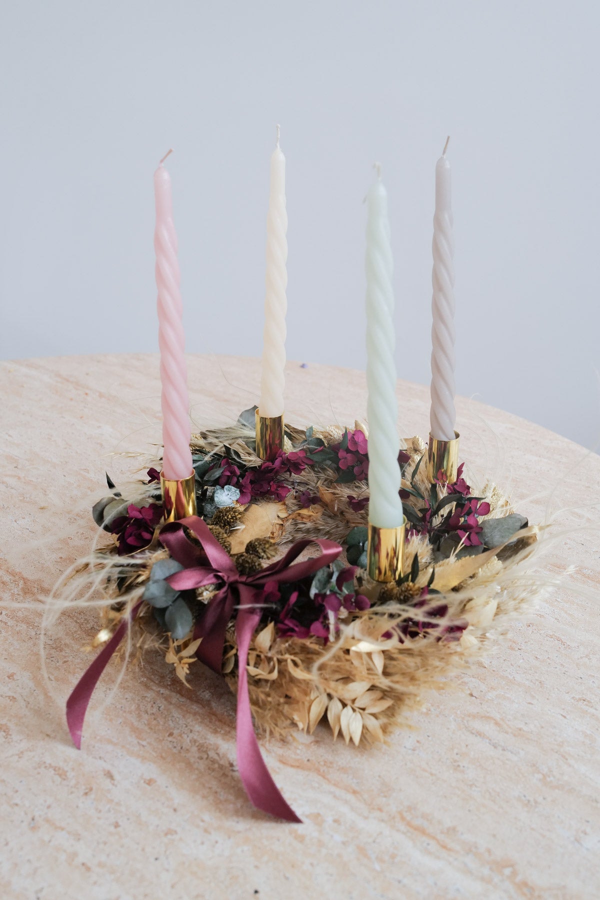Mit unsere Kerzentellern und Kerzen kannst deinen Dried Flower Kranz ganz einfach vom Türkranz in einen Adventskranz umbauen. Kerzen & Teller kannst du beim Check Out dazu bestellen.