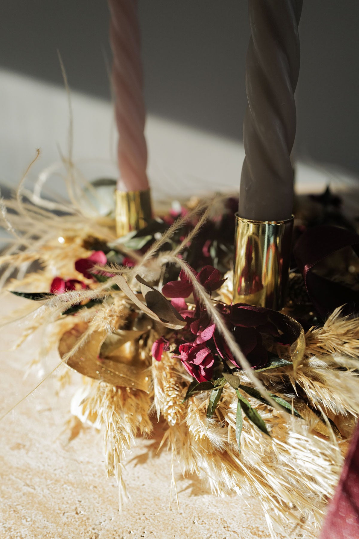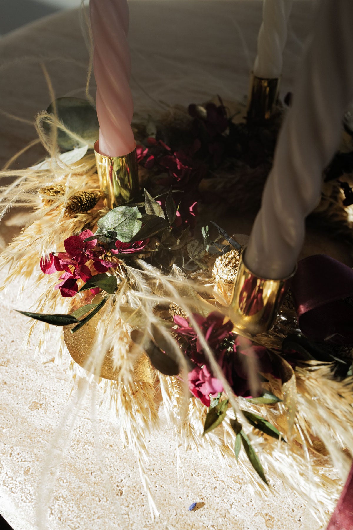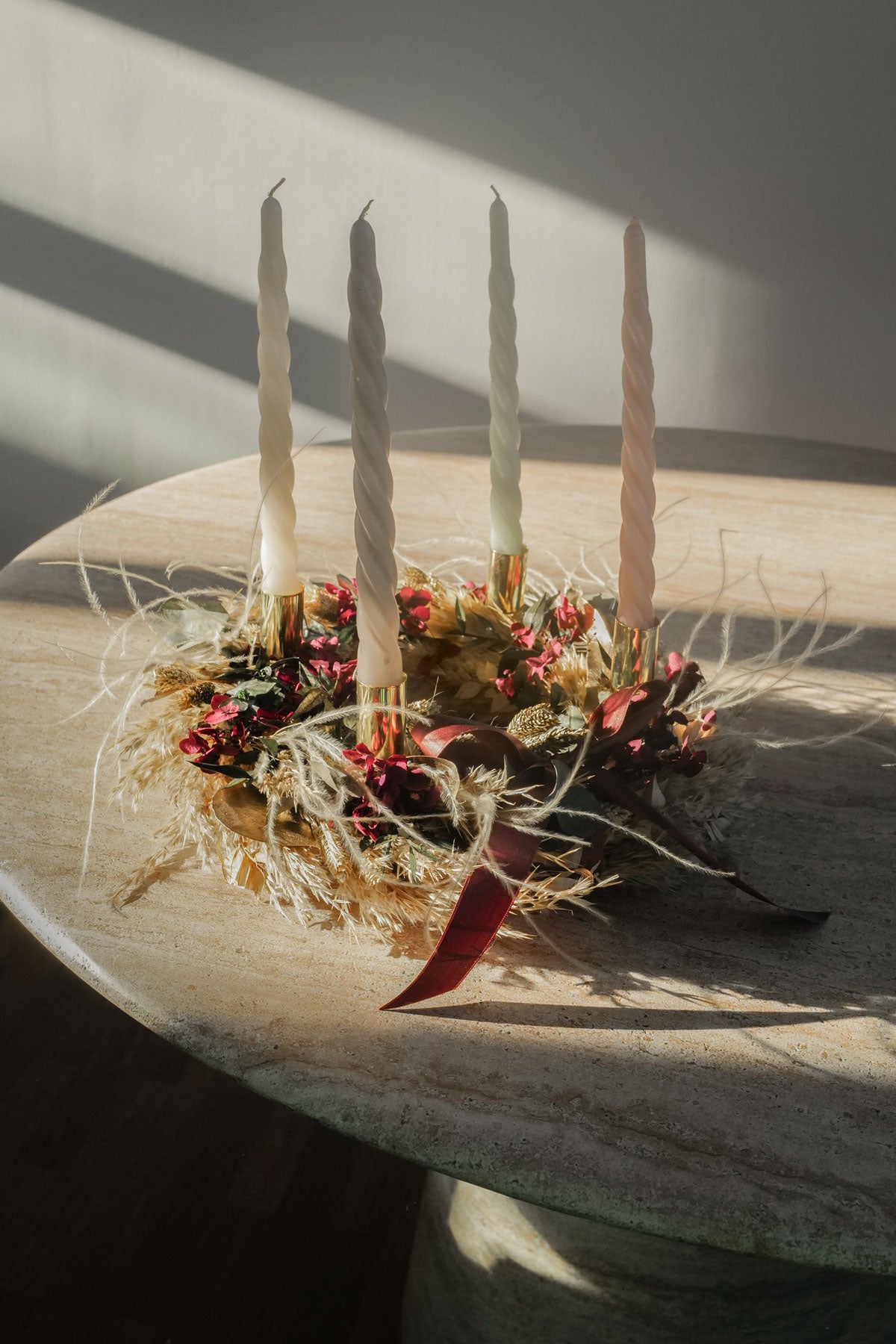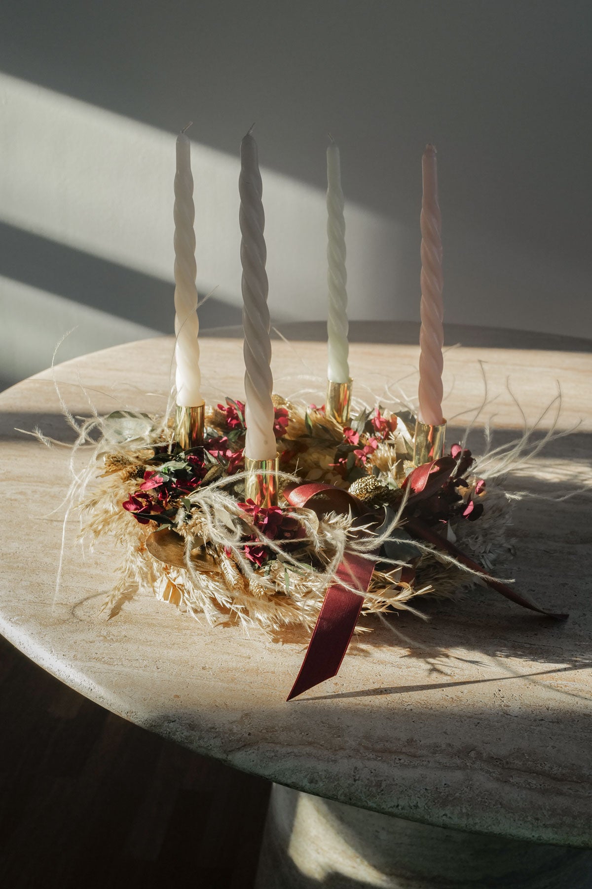 Mit unsere Kerzentellern und Kerzen kannst deinen Dried Flower Kranz ganz einfach vom Türkranz in einen Adventskranz umbauen. Kerzen & Teller kannst du beim Check Out dazu bestellen.