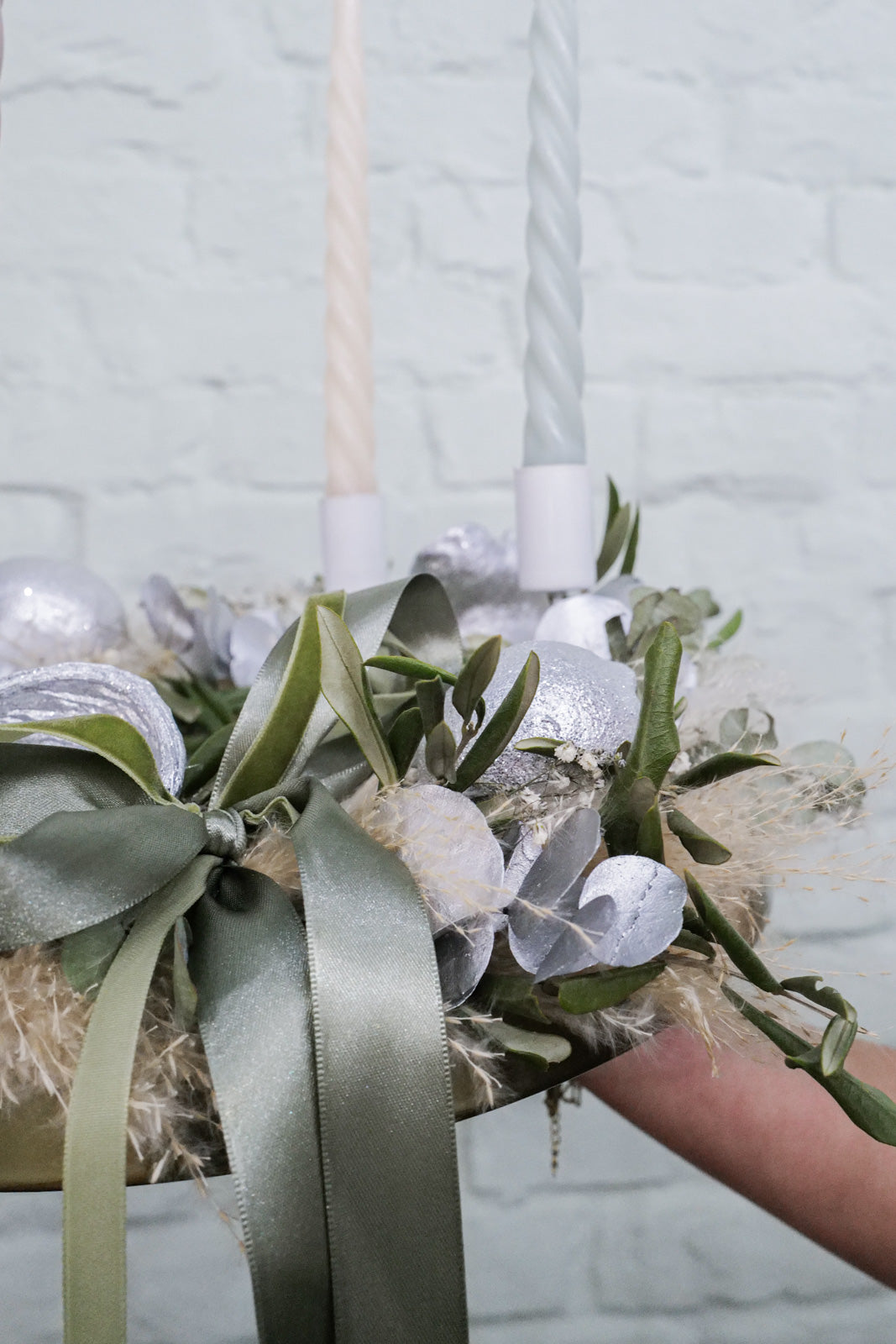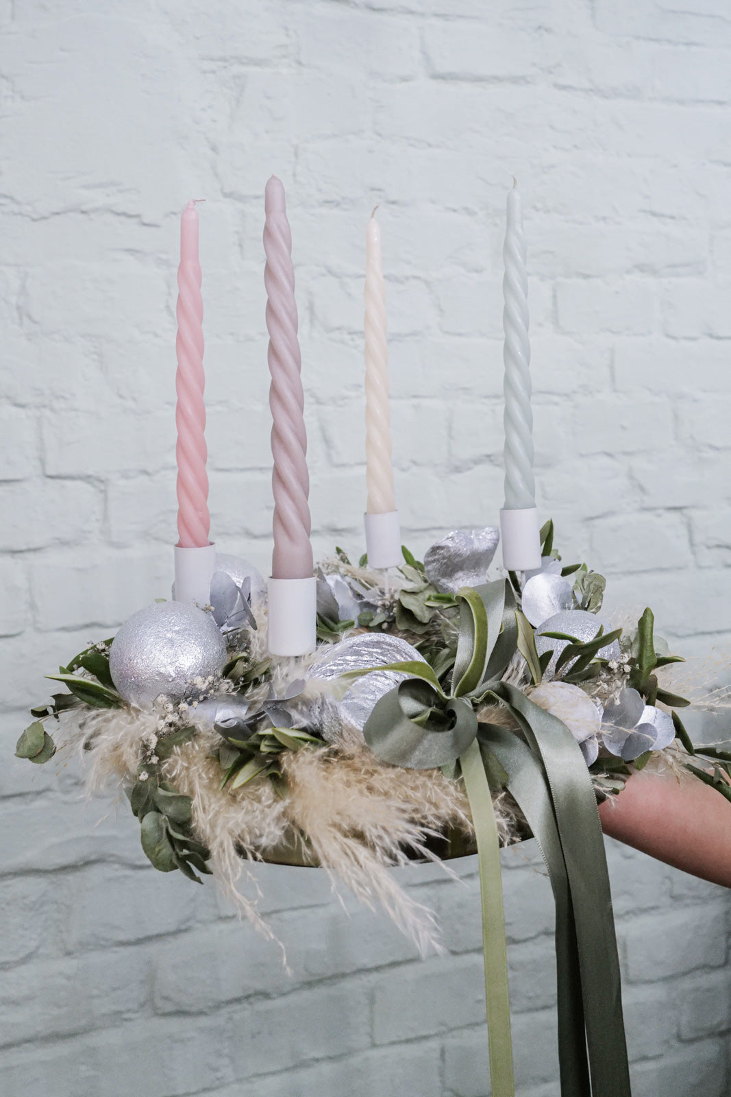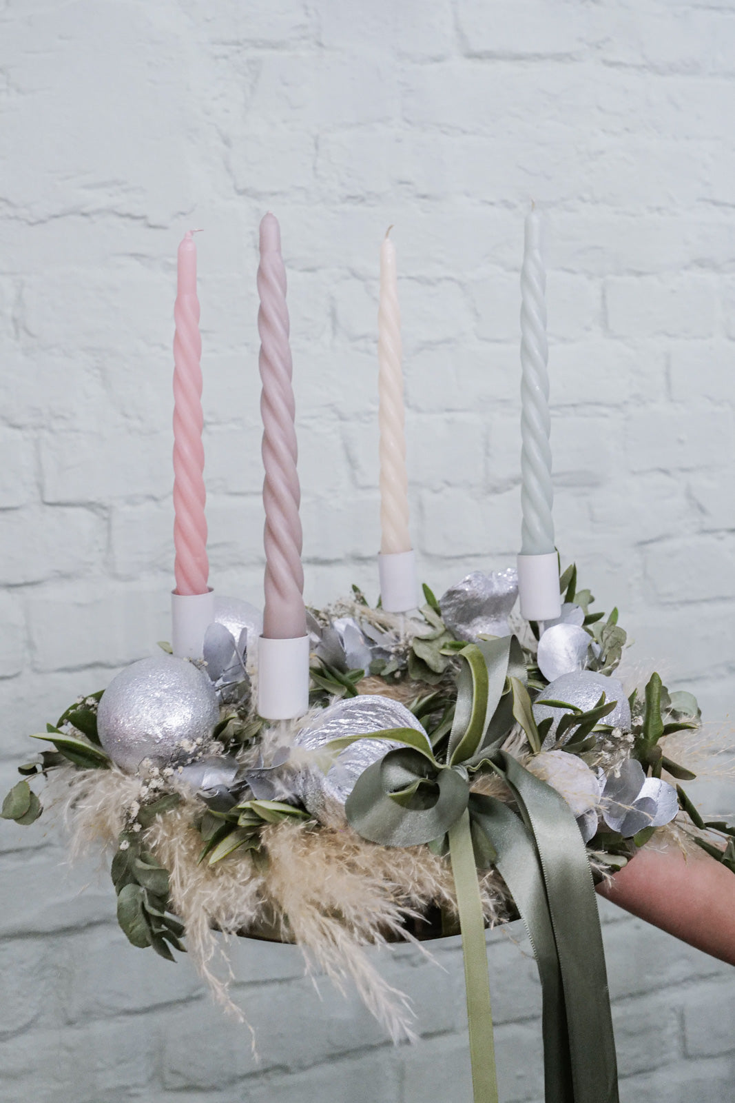 Mit unsere Kerzentellern und Kerzen kannst deinen Dried Flower Kranz ganz einfach vom Türkranz in einen Adventskranz umbauen. Kerzen & Teller kannst du beim Check Out dazu bestellen.