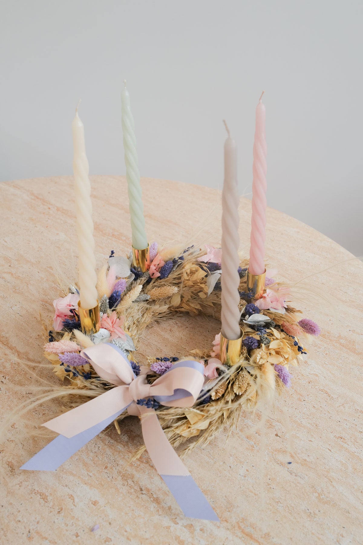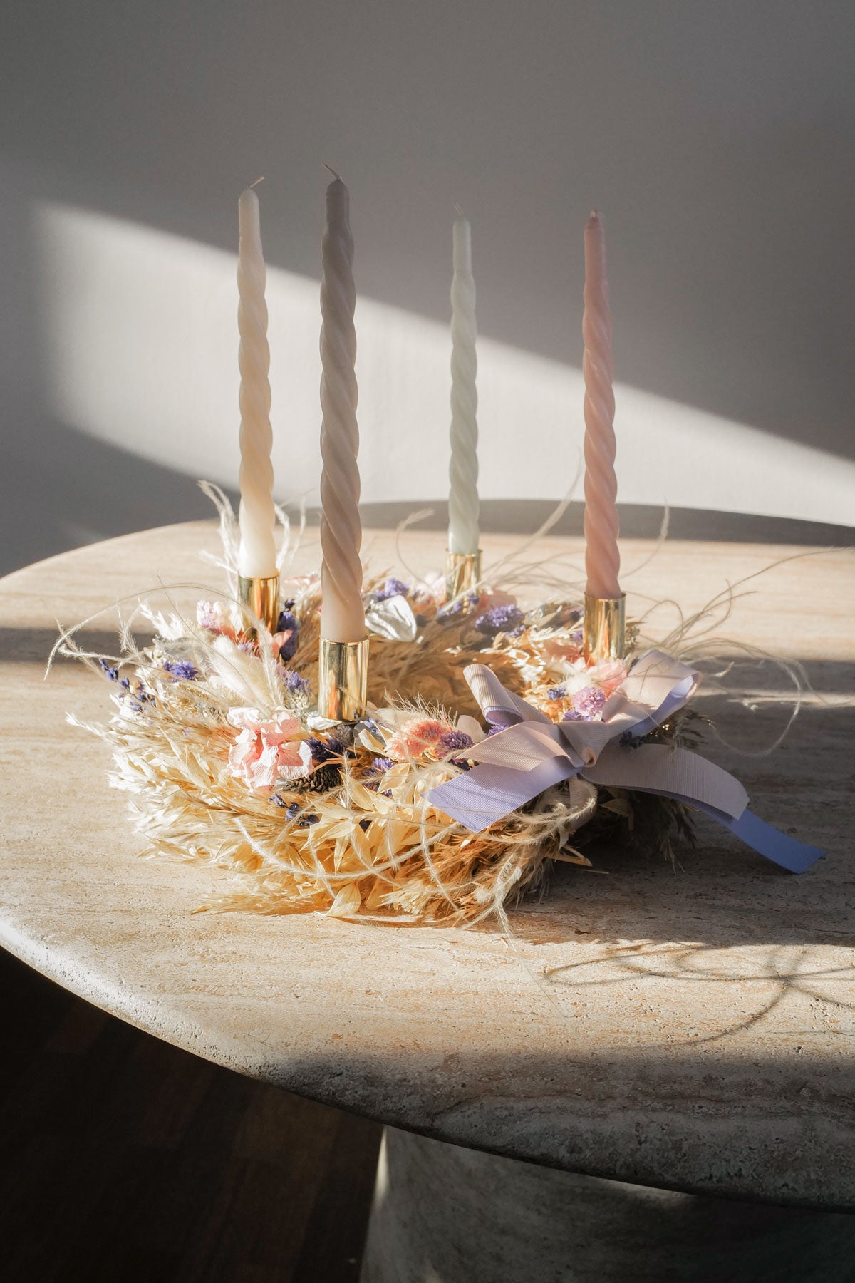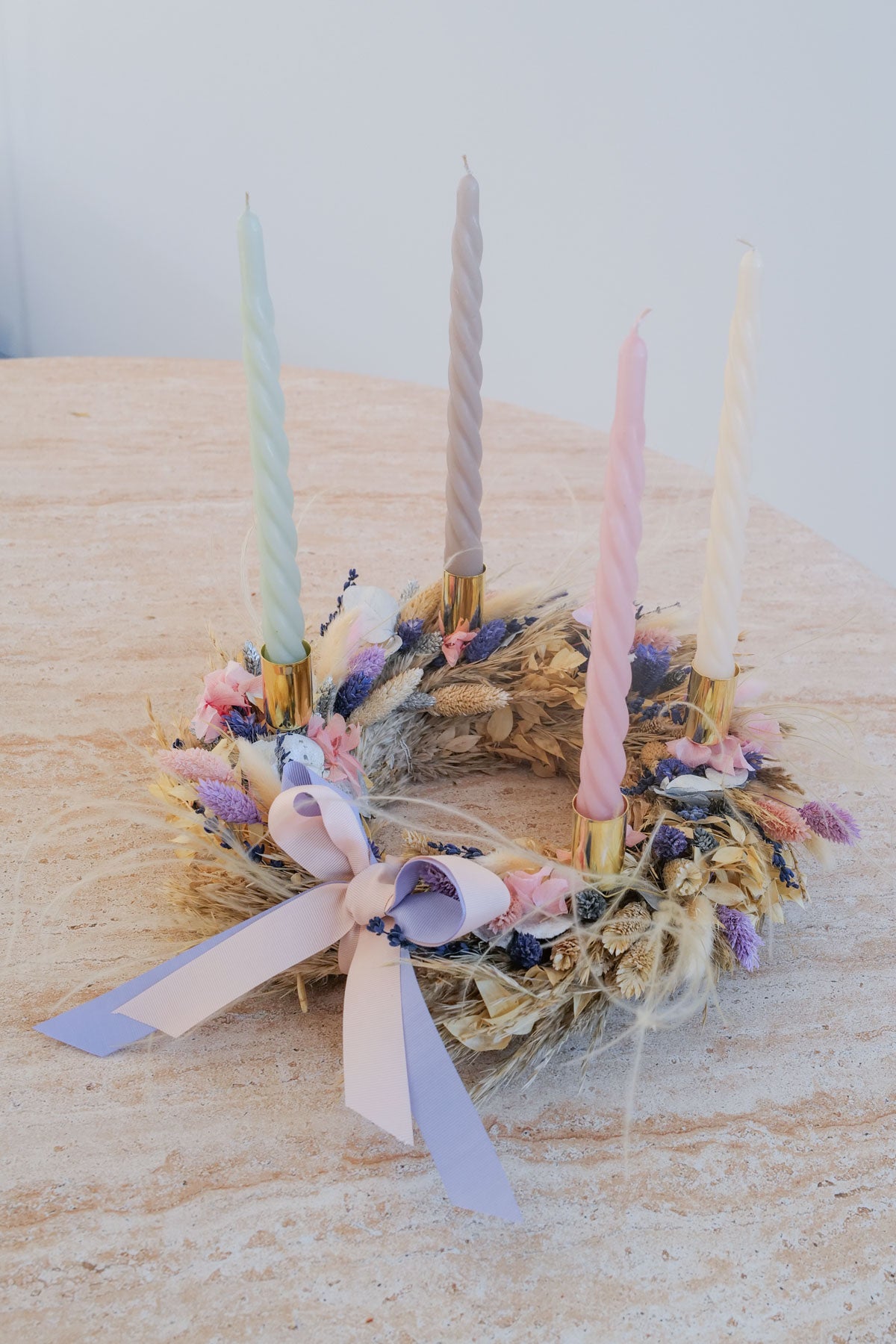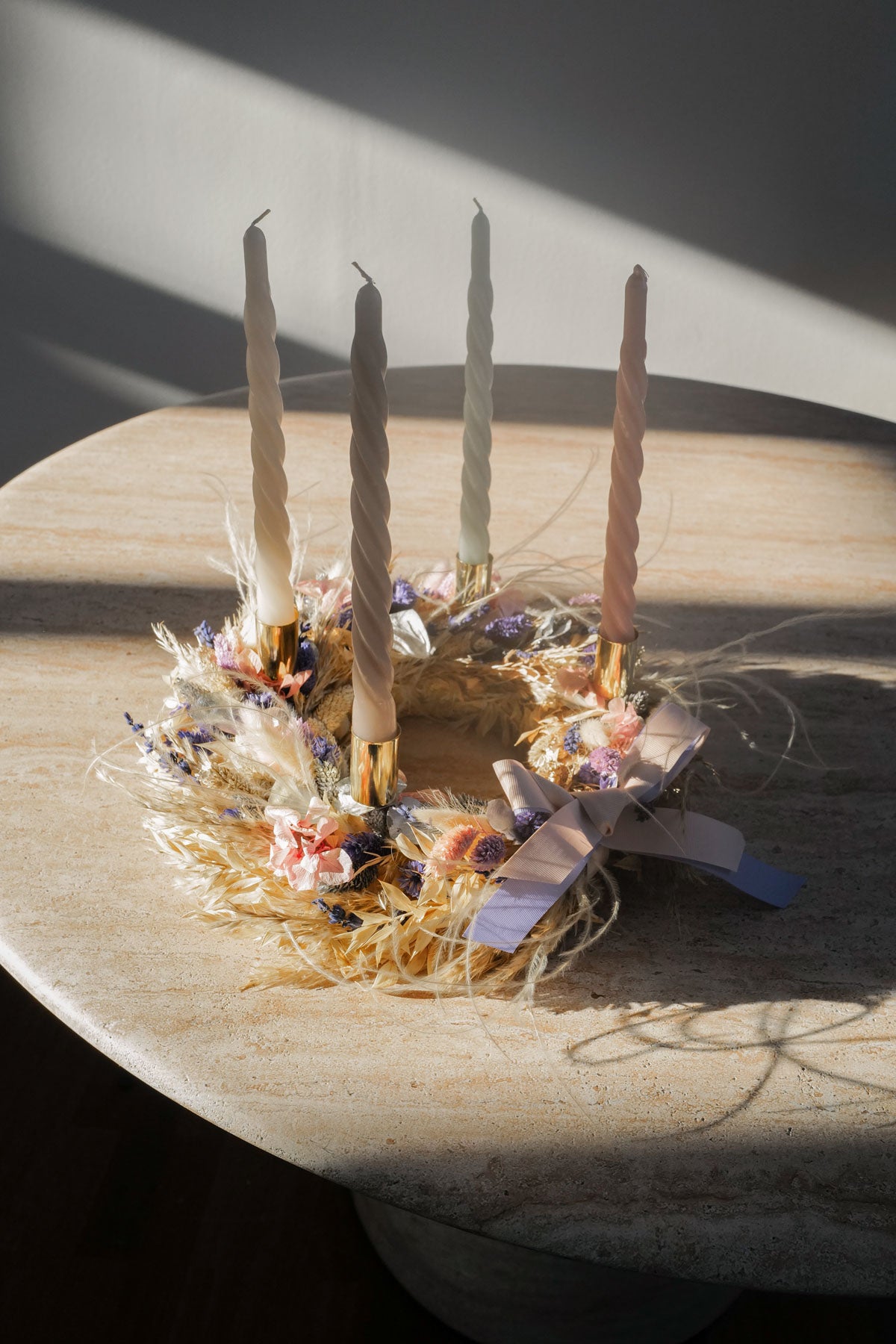 Mit unsere Kerzentellern und Kerzen kannst deinen Dried Flower Kranz ganz einfach vom Türkranz in einen Adventskranz umbauen. Kerzen & Teller kannst du beim Check Out dazu bestellen.