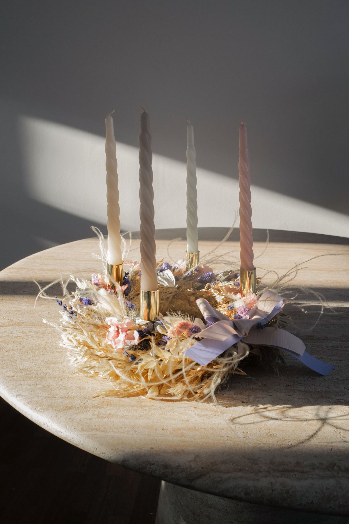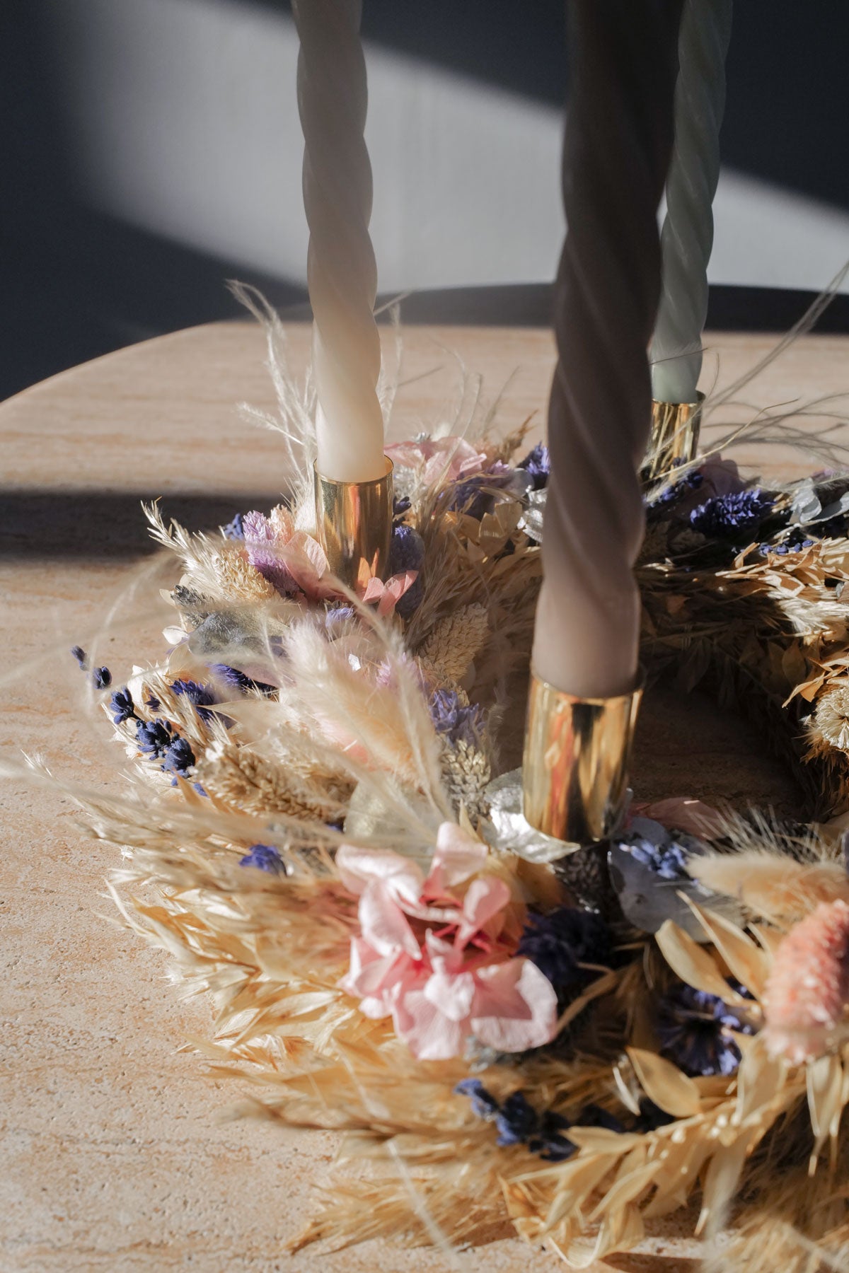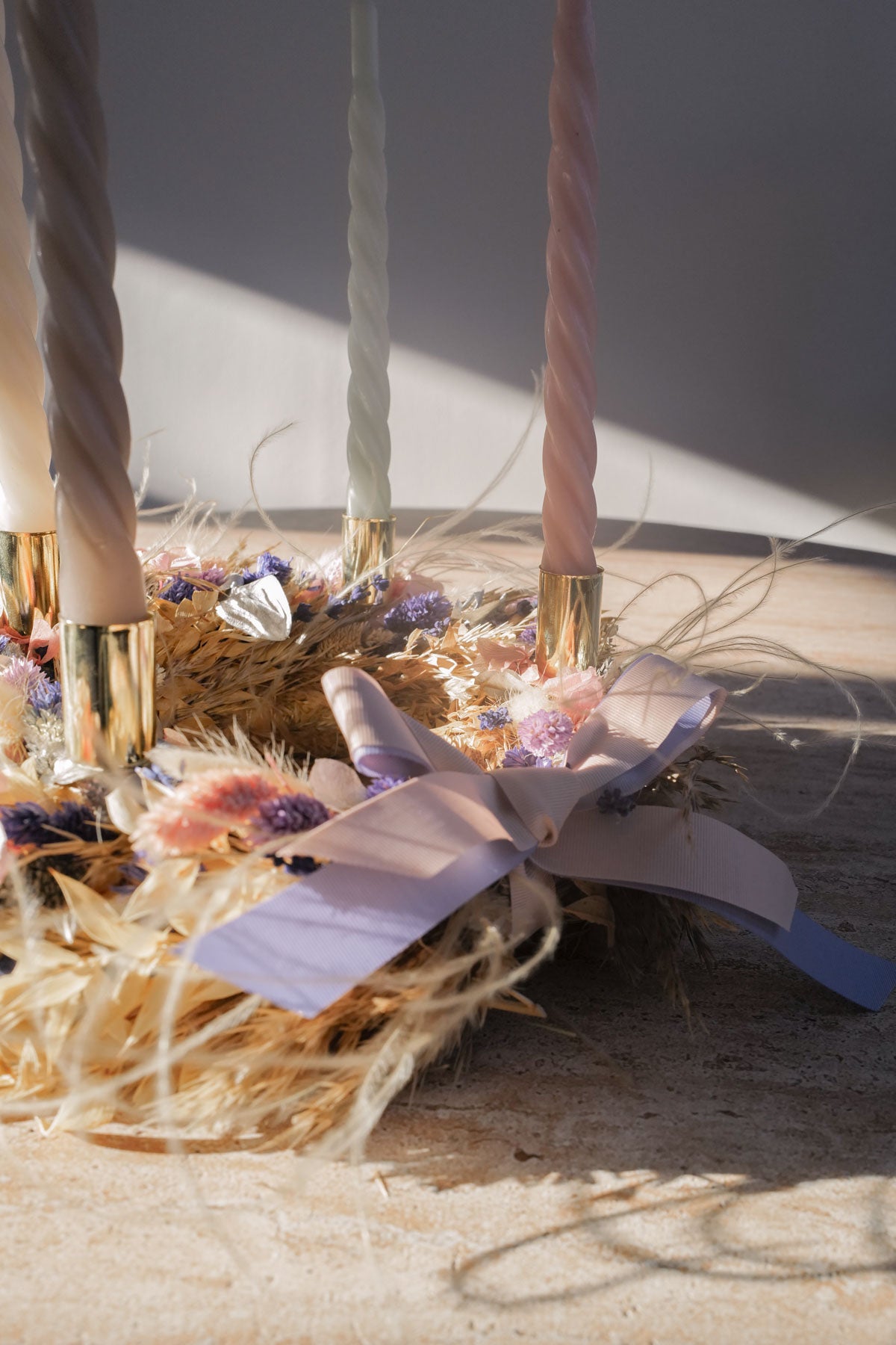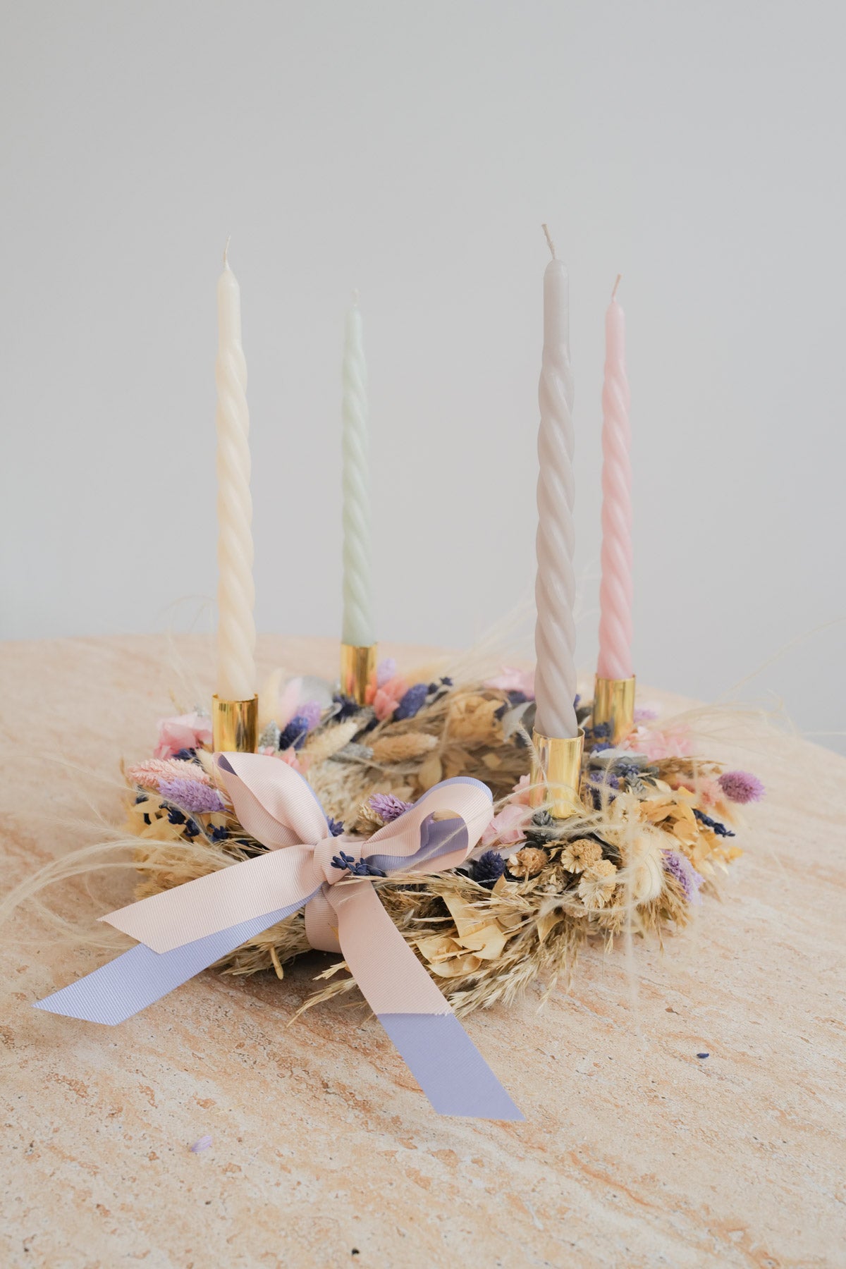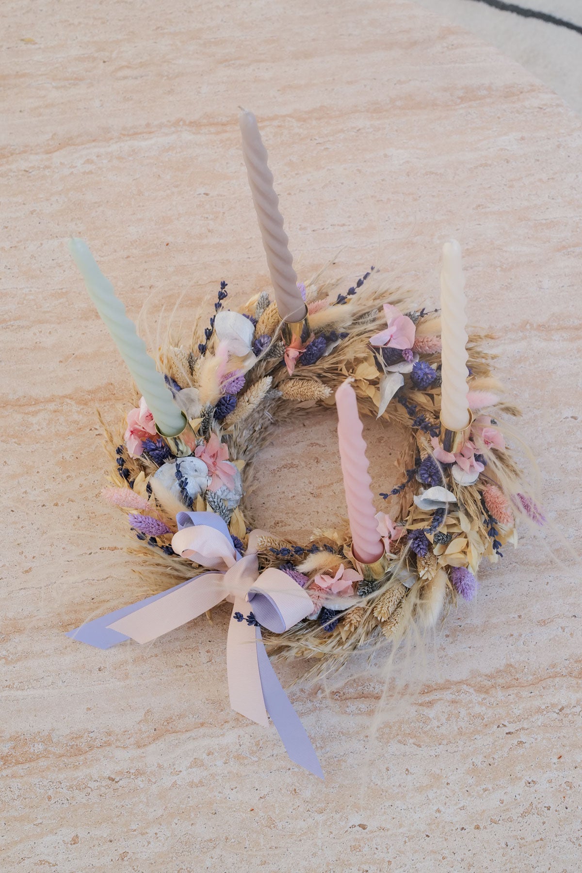 Mit unsere Kerzentellern und Kerzen kannst deinen Dried Flower Kranz ganz einfach vom Türkranz in einen Adventskranz umbauen. Kerzen & Teller kannst du beim Check Out dazu bestellen.