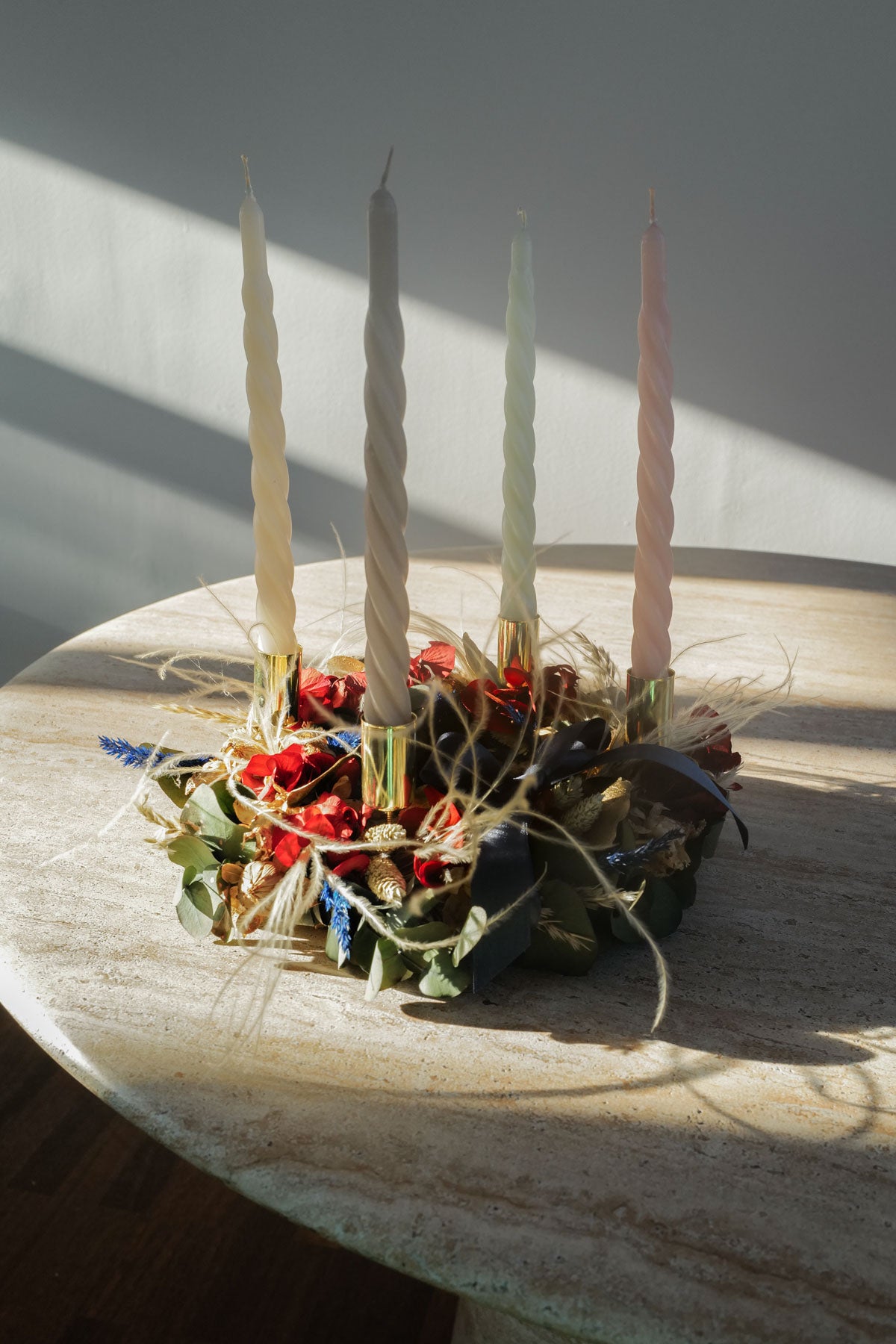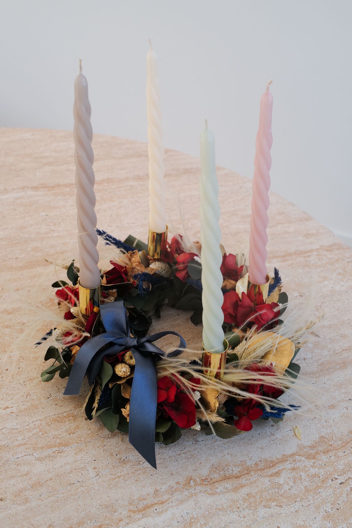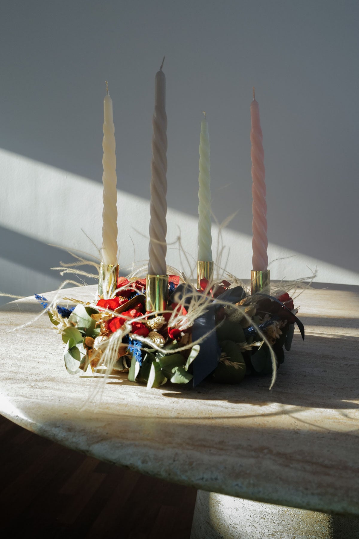 Mit unsere Kerzentellern und Kerzen kannst deinen Dried Flower Kranz ganz einfach vom Türkranz in einen Adventskranz umbauen. Kerzen & Teller kannst du beim Check Out dazu bestellen.
