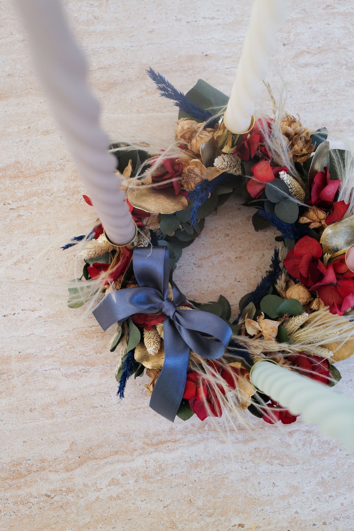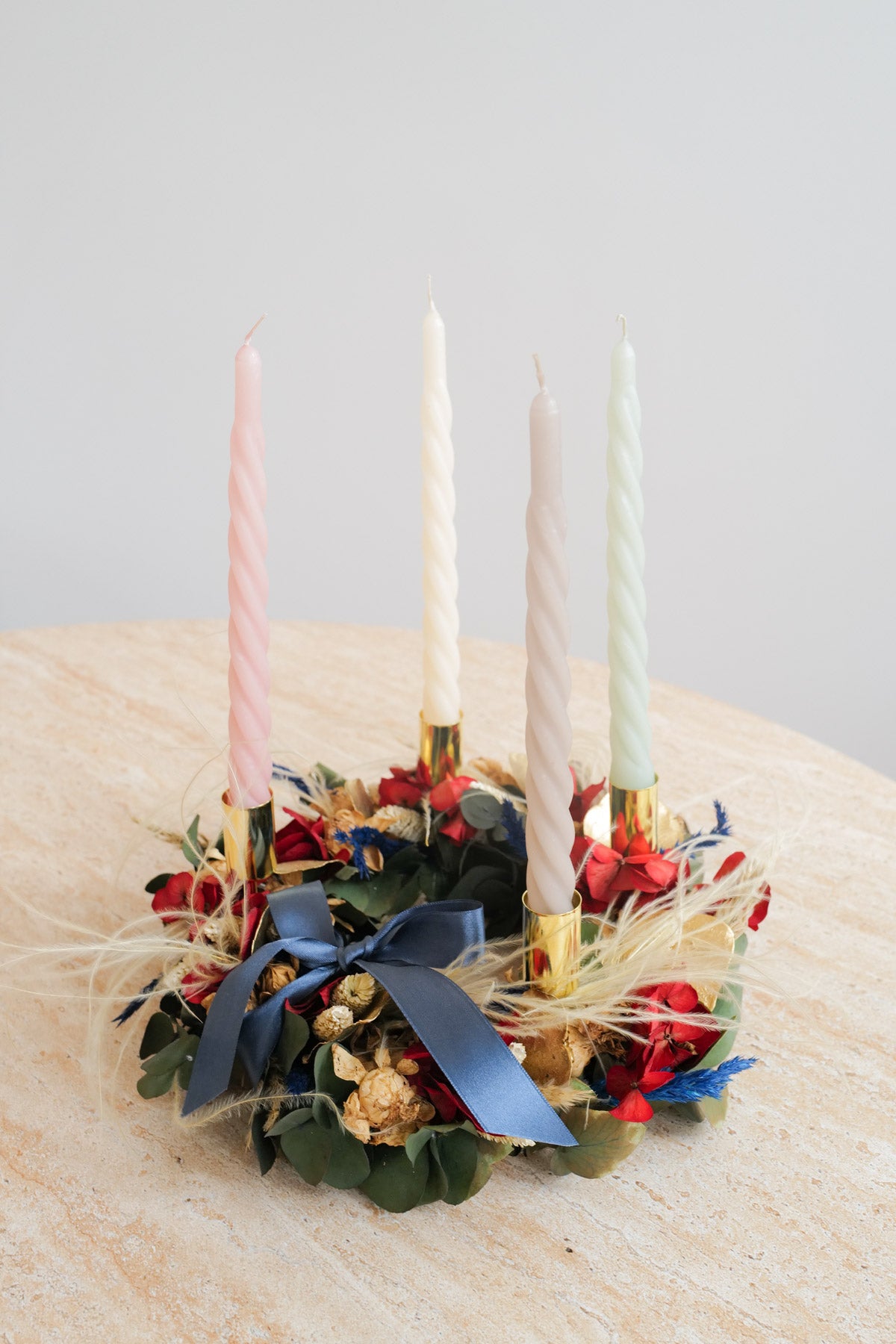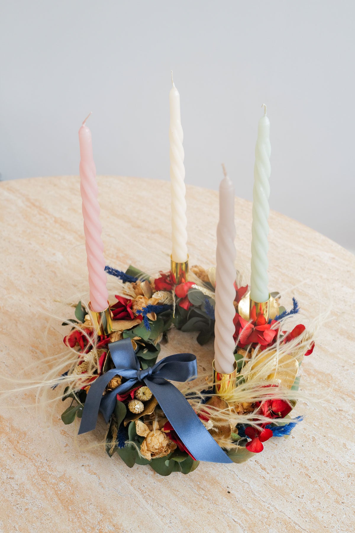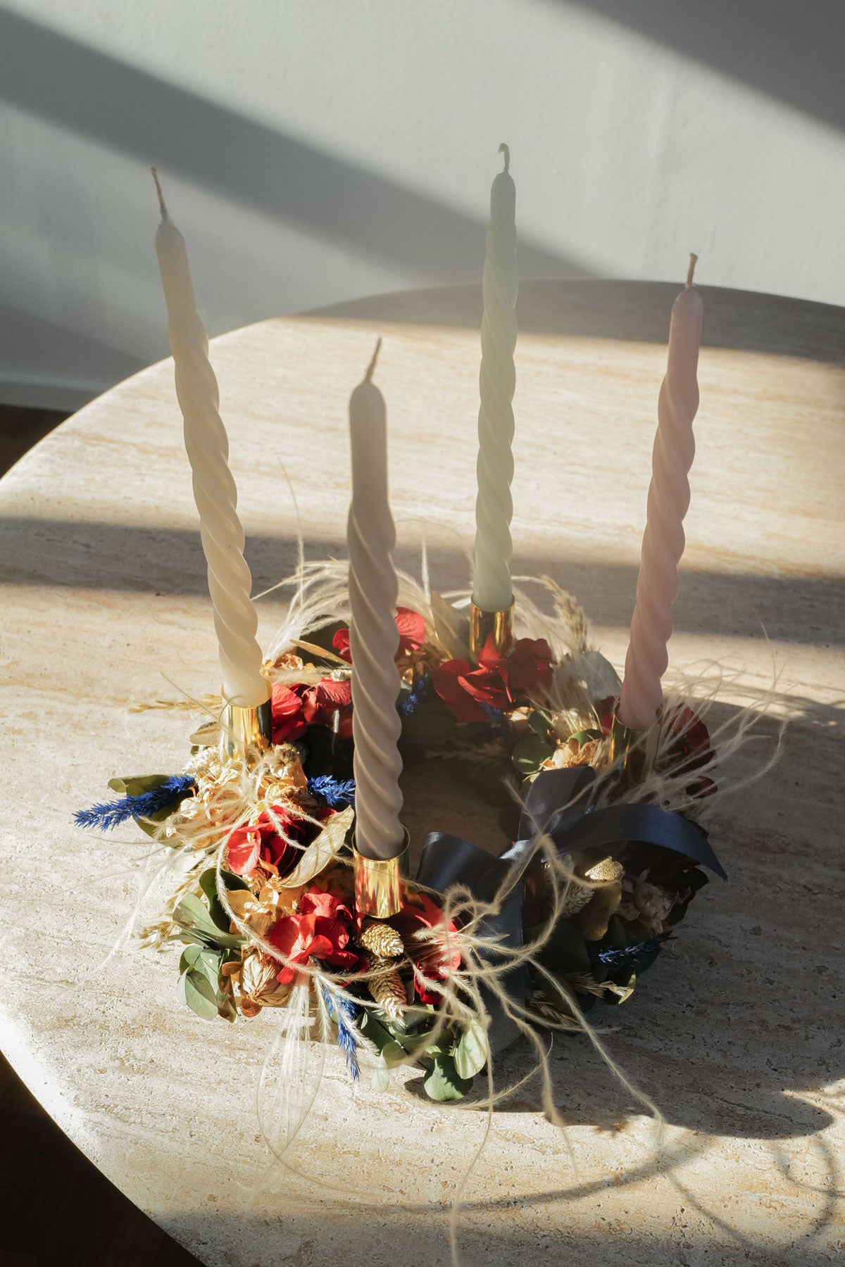 Mit unsere Kerzentellern und Kerzen kannst deinen Dried Flower Kranz ganz einfach vom Türkranz in einen Adventskranz umbauen. Kerzen & Teller kannst du beim Check Out dazu bestellen.
