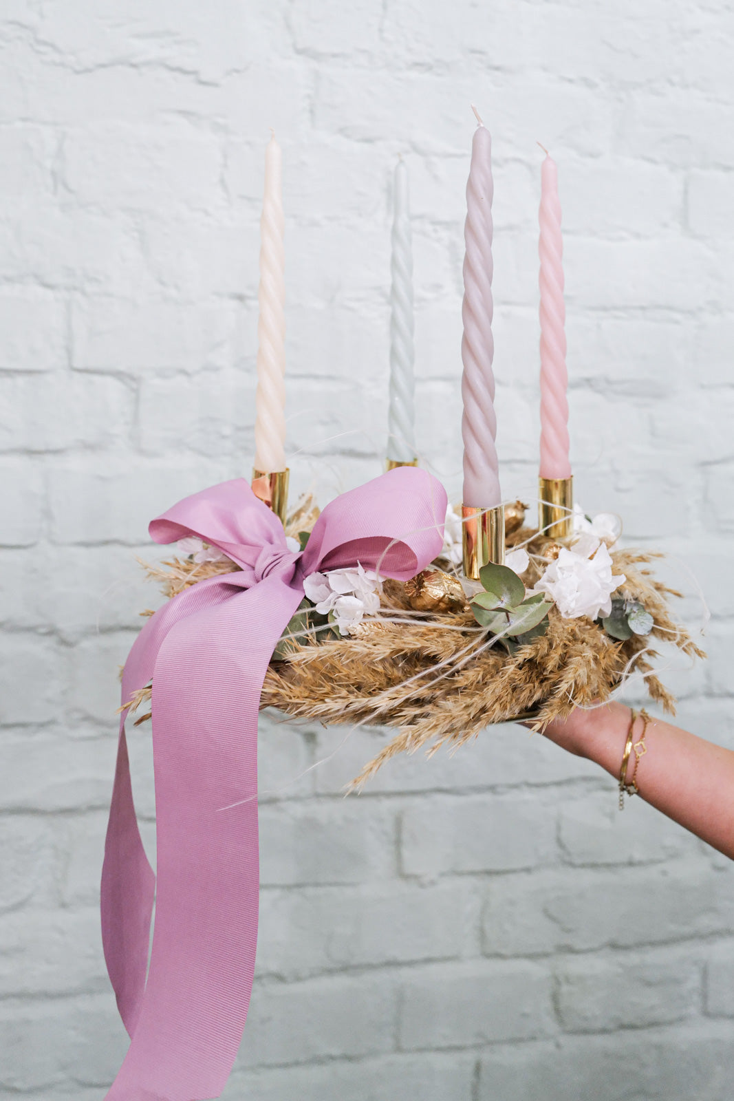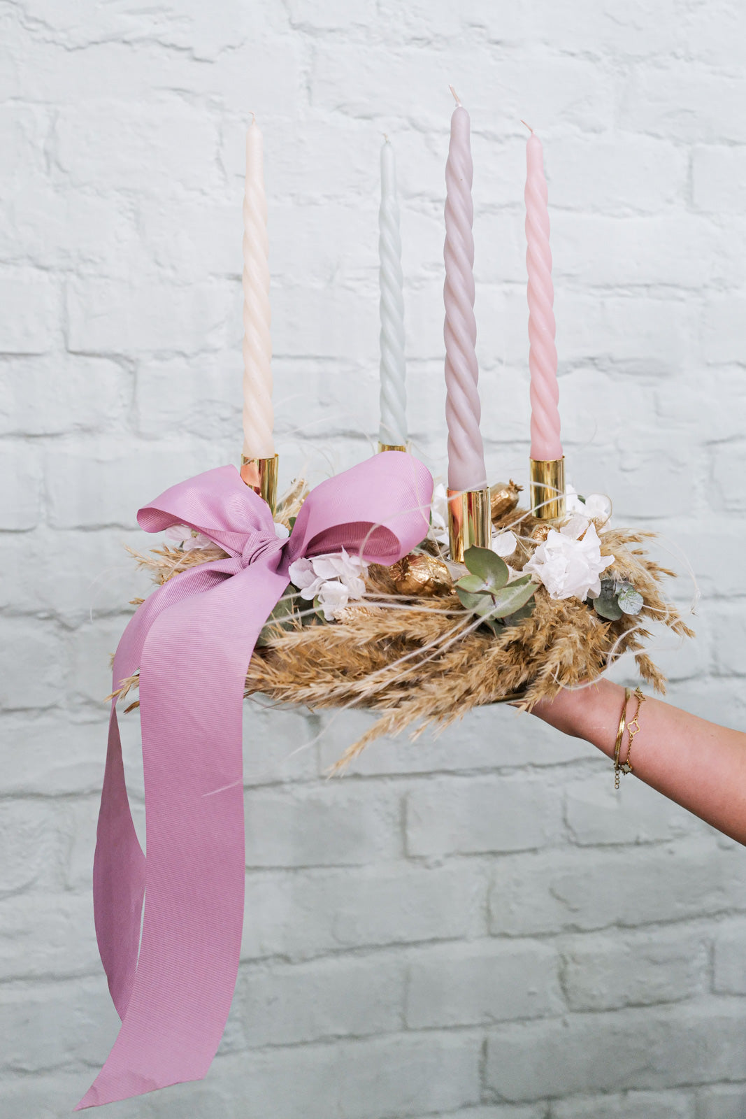 Mit unsere Kerzentellern und Kerzen kannst deinen Dried Flower Kranz ganz einfach vom Türkranz in einen Adventskranz umbauen. Kerzen & Teller kannst du beim Check Out dazu bestellen.