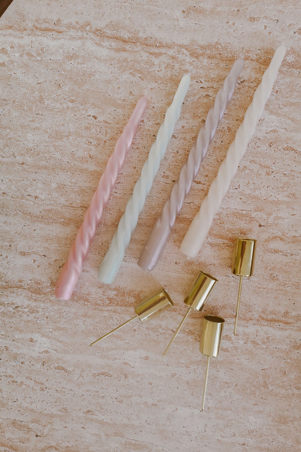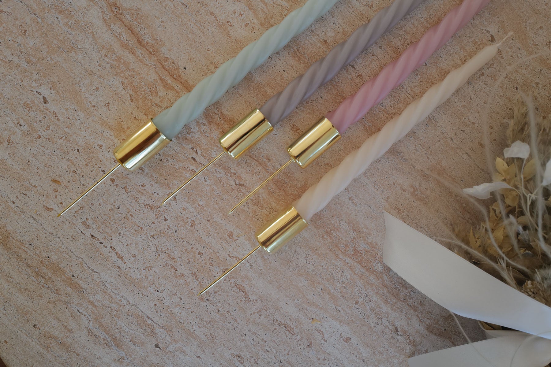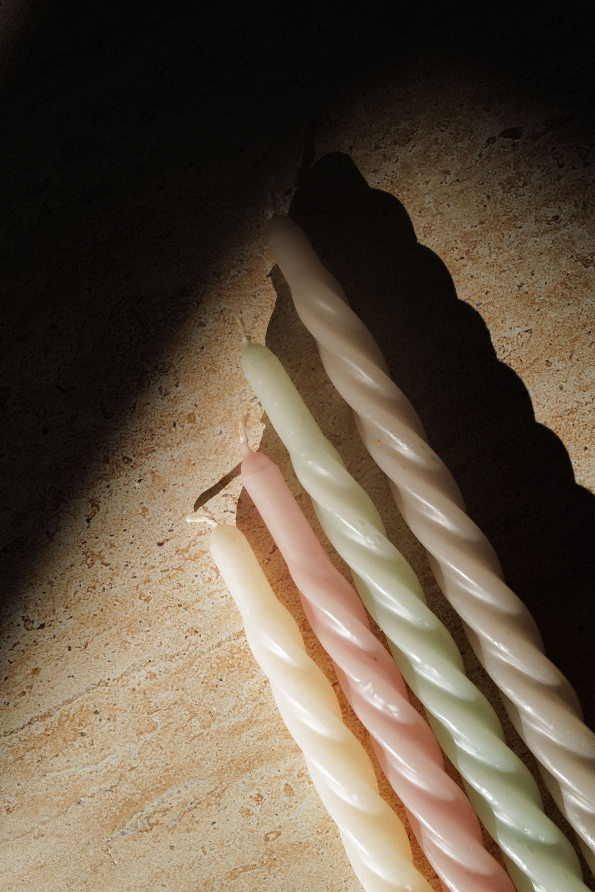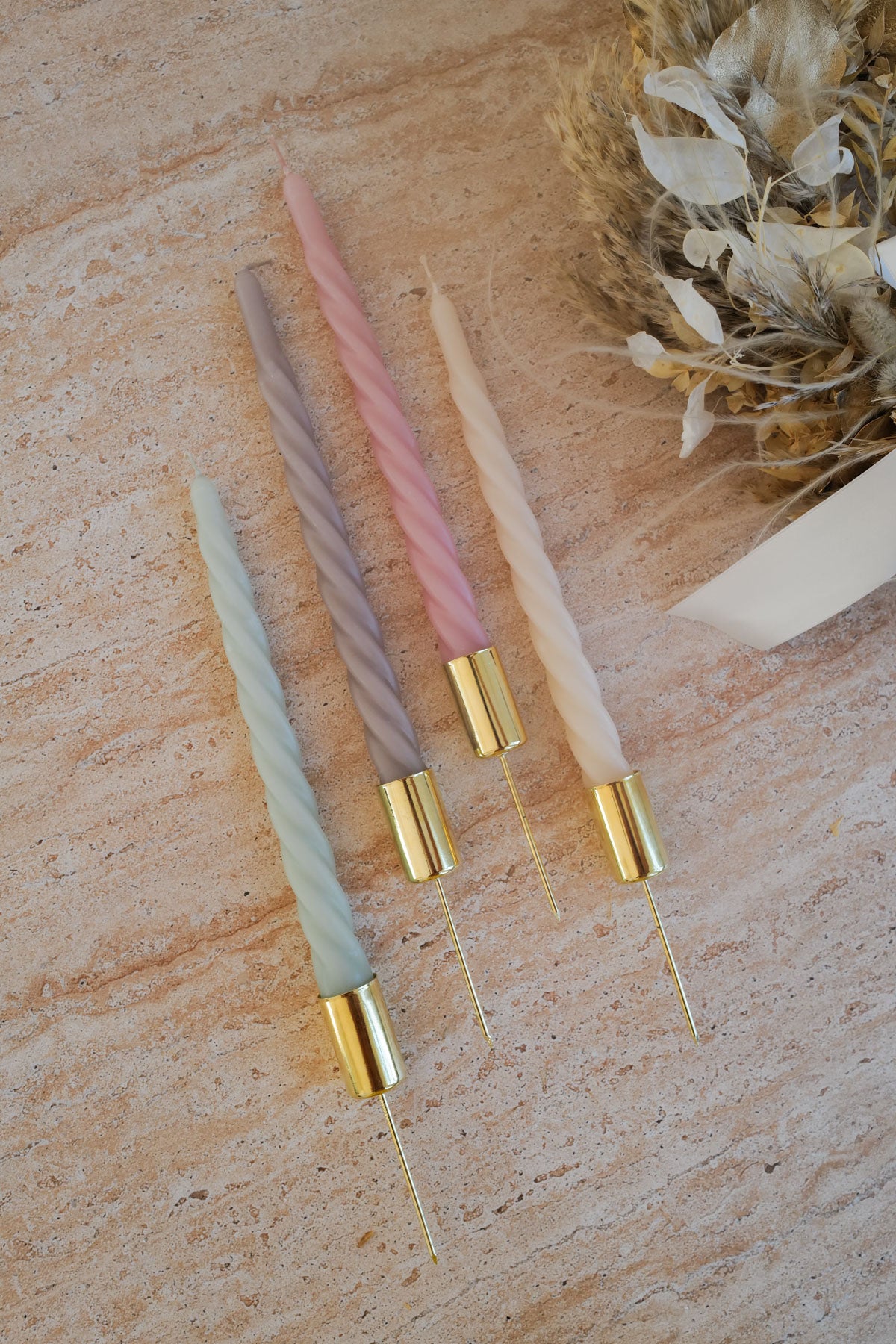 - 4 Stück bunte pastellfarbene Stabkerzen aus Wachs (gedreht)