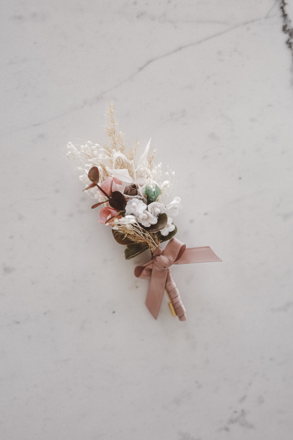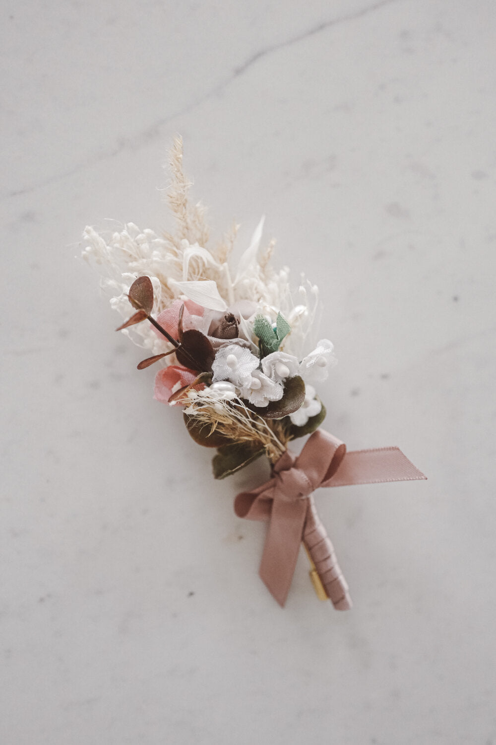 Ola is a delicate corsage for the groom. Handmade in Vienna from precious vintage silk flowers and dried flowers, it will last a lifetime.