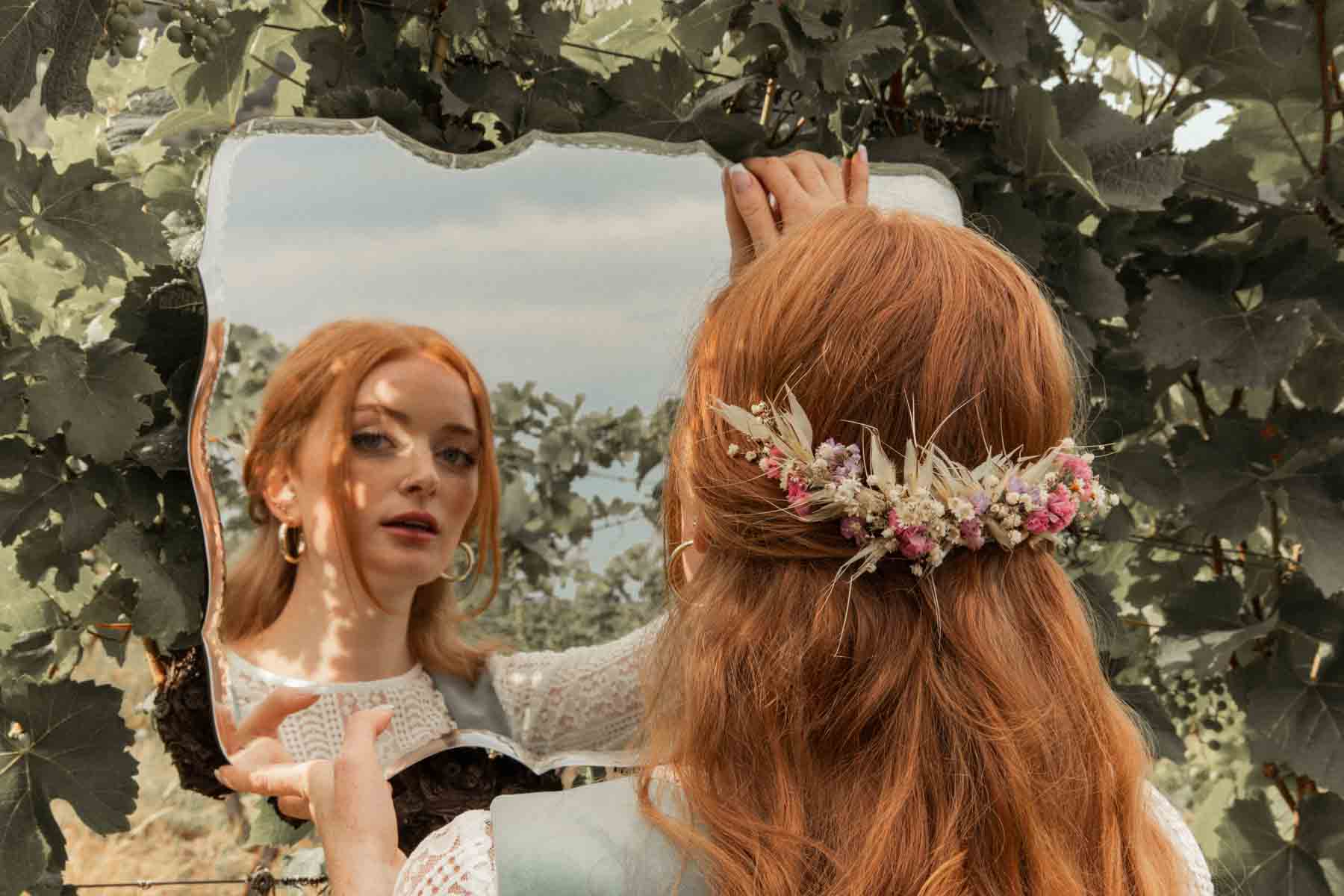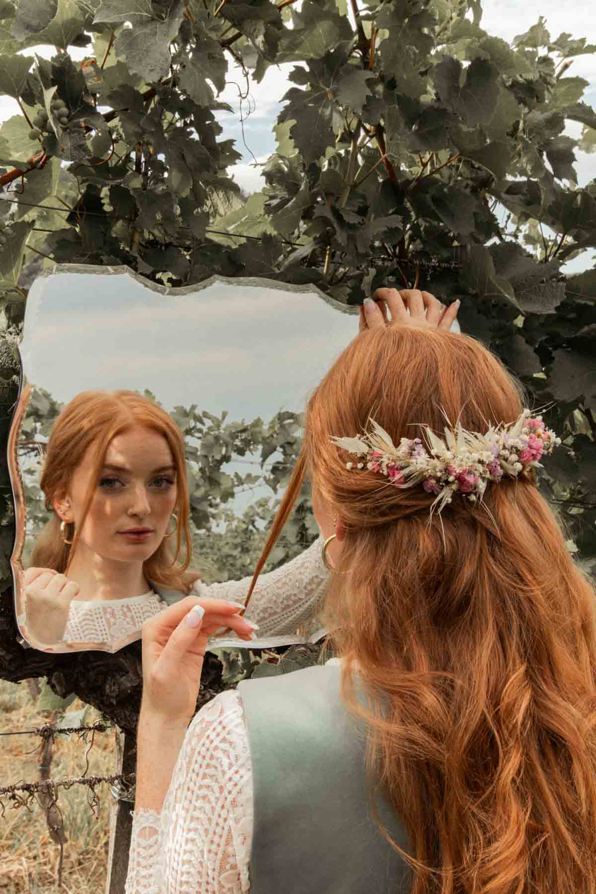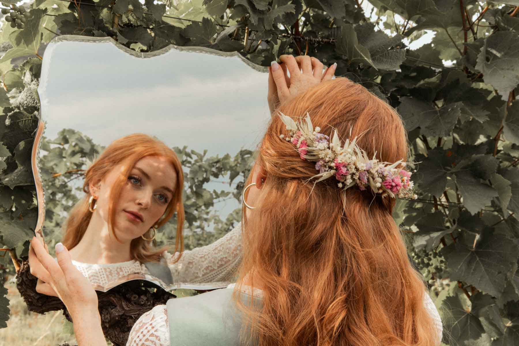 Note that our designs are made from high quality materials. Each piece is handmade in our Vienna studio with rare flowers from the 50s to the 90s as well as dried flowers, beads and stones. Therefore, please treat your piece with love, do not leave the design in the sun for a long time and protect it from moisture. This way your unique piece will last a lifetime and outlast generations.