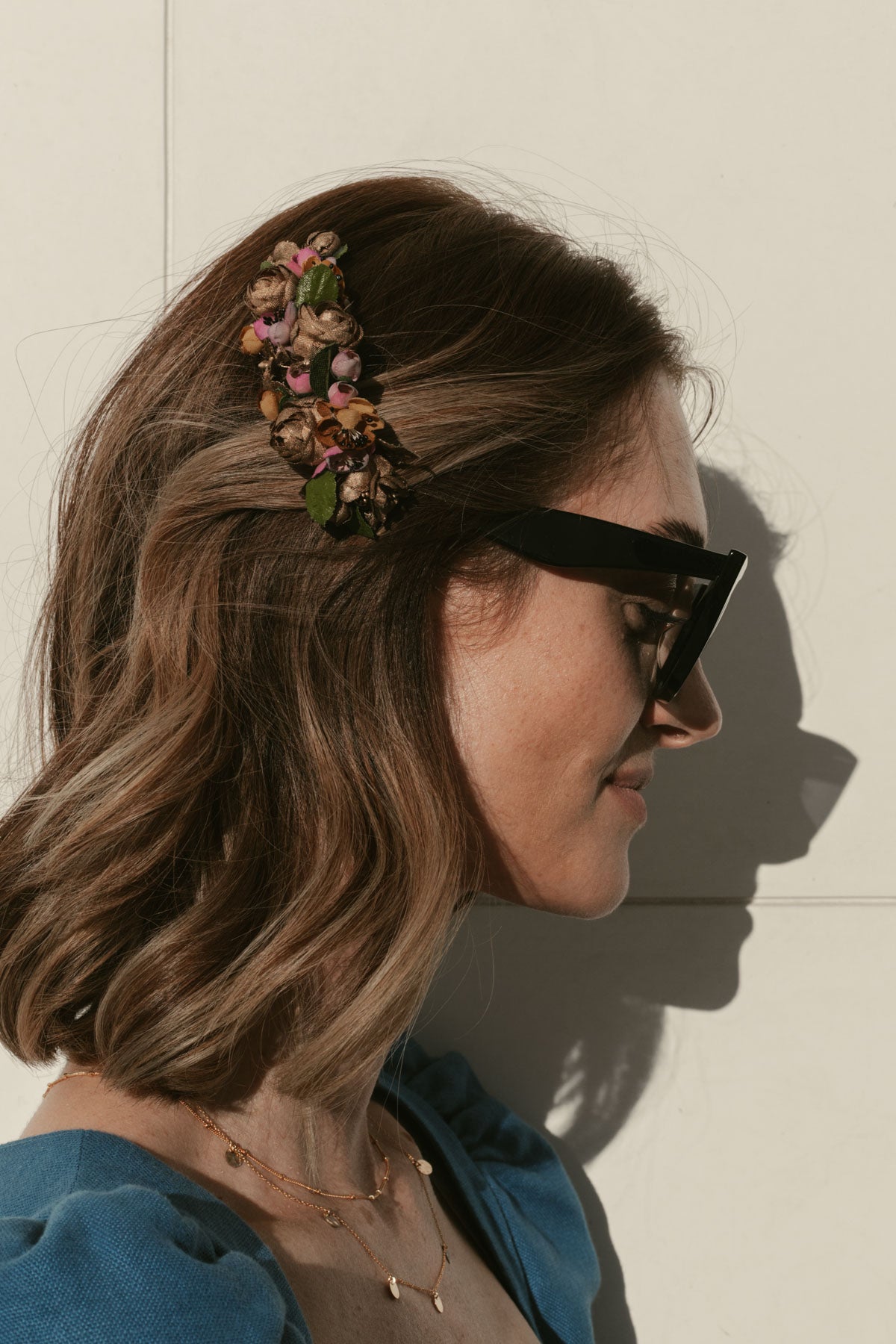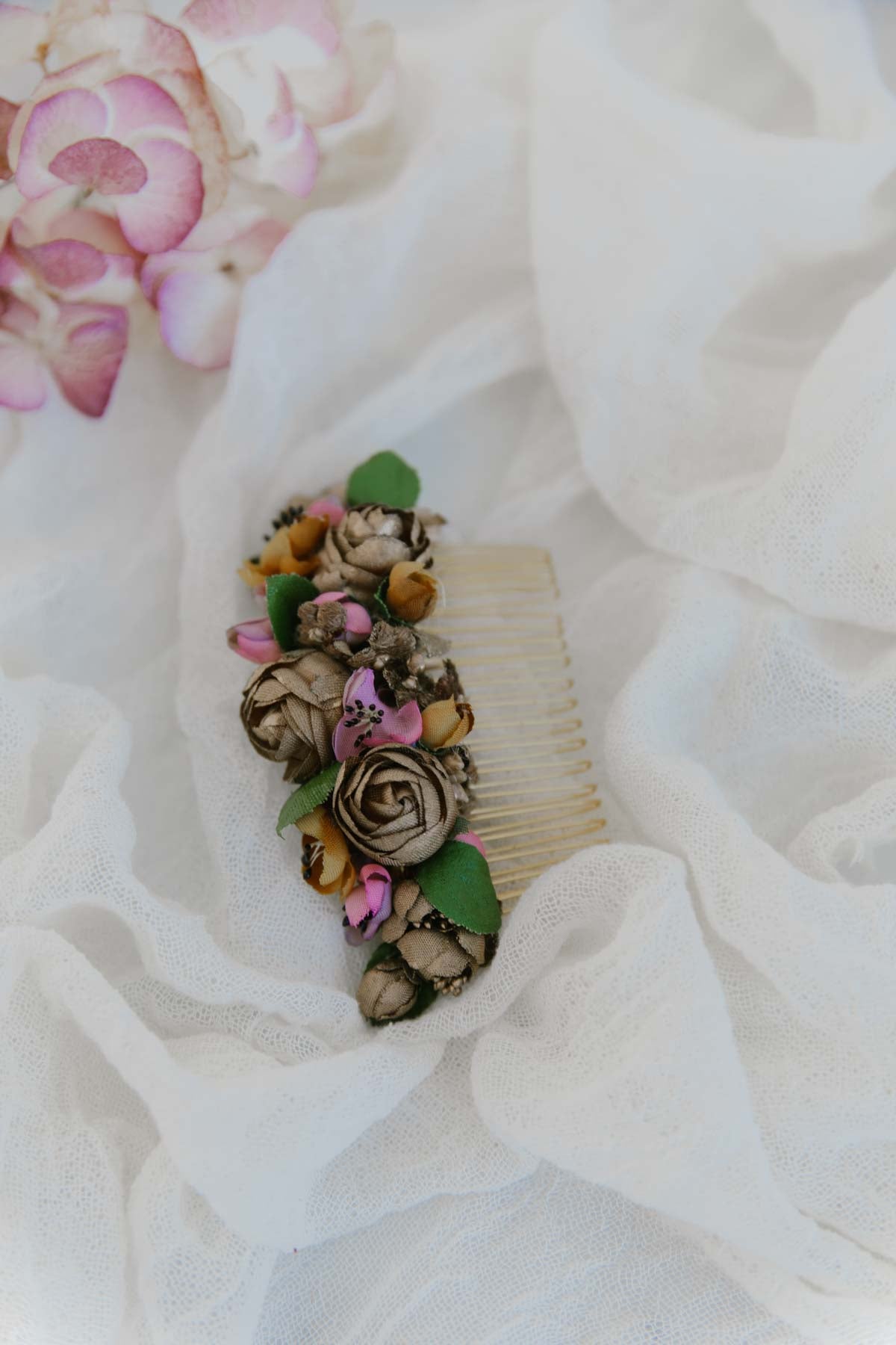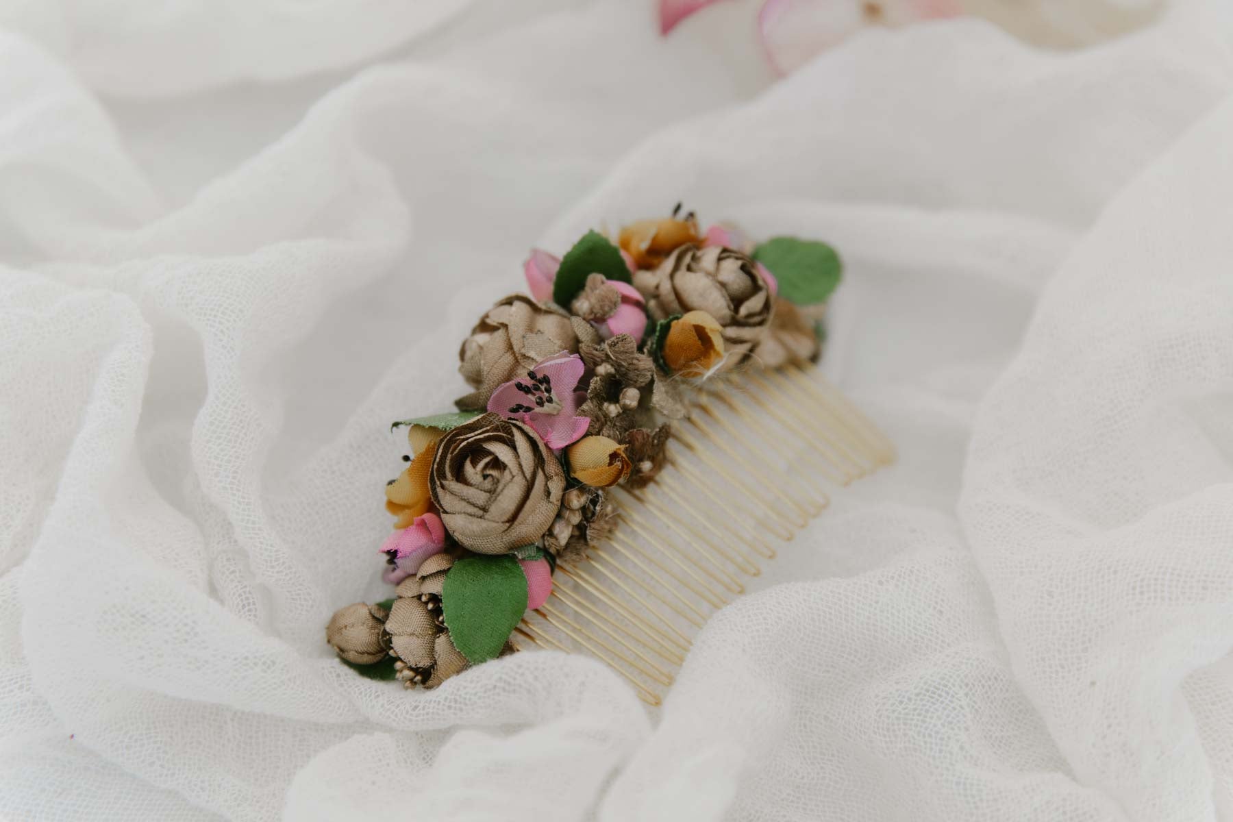 Helena ist das perfekte Statement-Piece für den romantischen Bridal- oder Trachten-Look. Handgemacht in Wien aus edlen Vintage Seidenblumen und hält so ein Leben lang. Ganz einfach zum Stecken ins Haar.