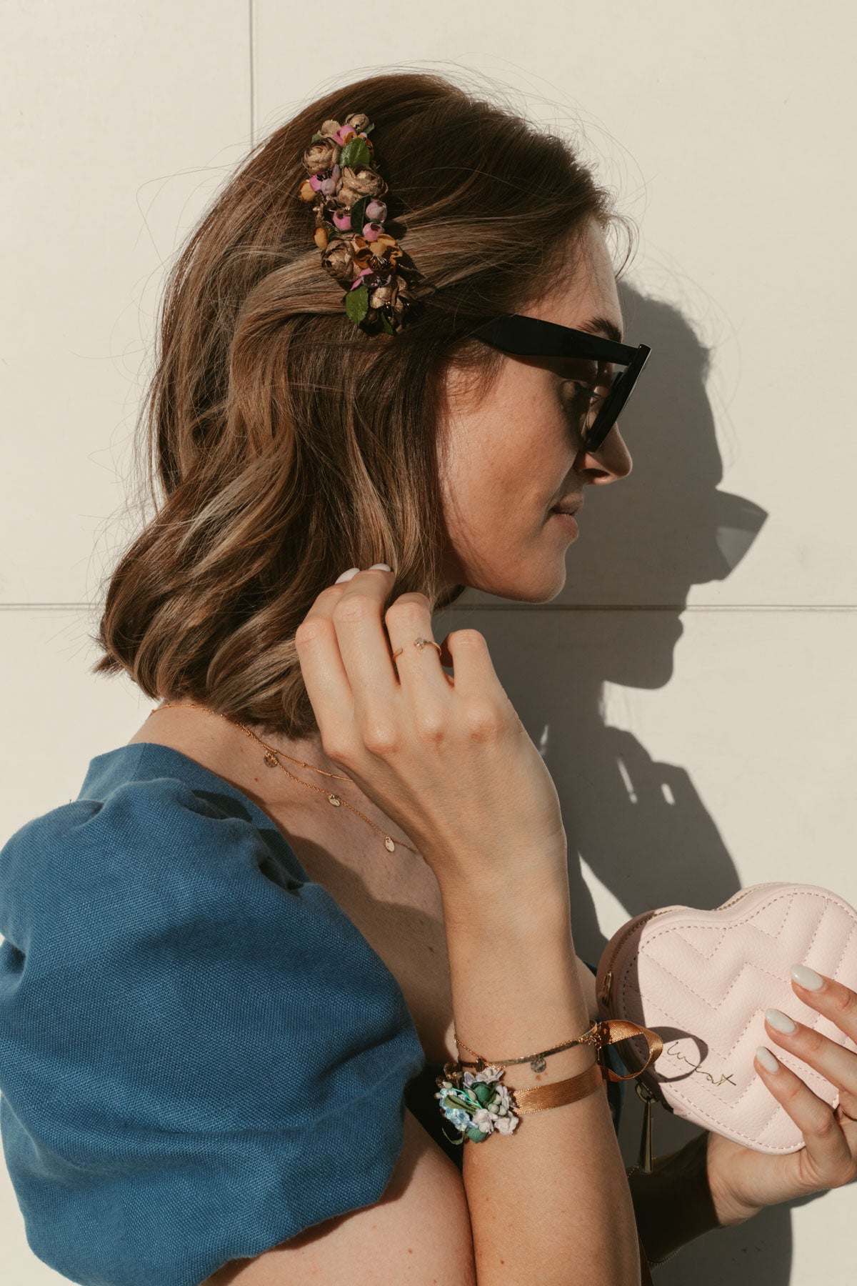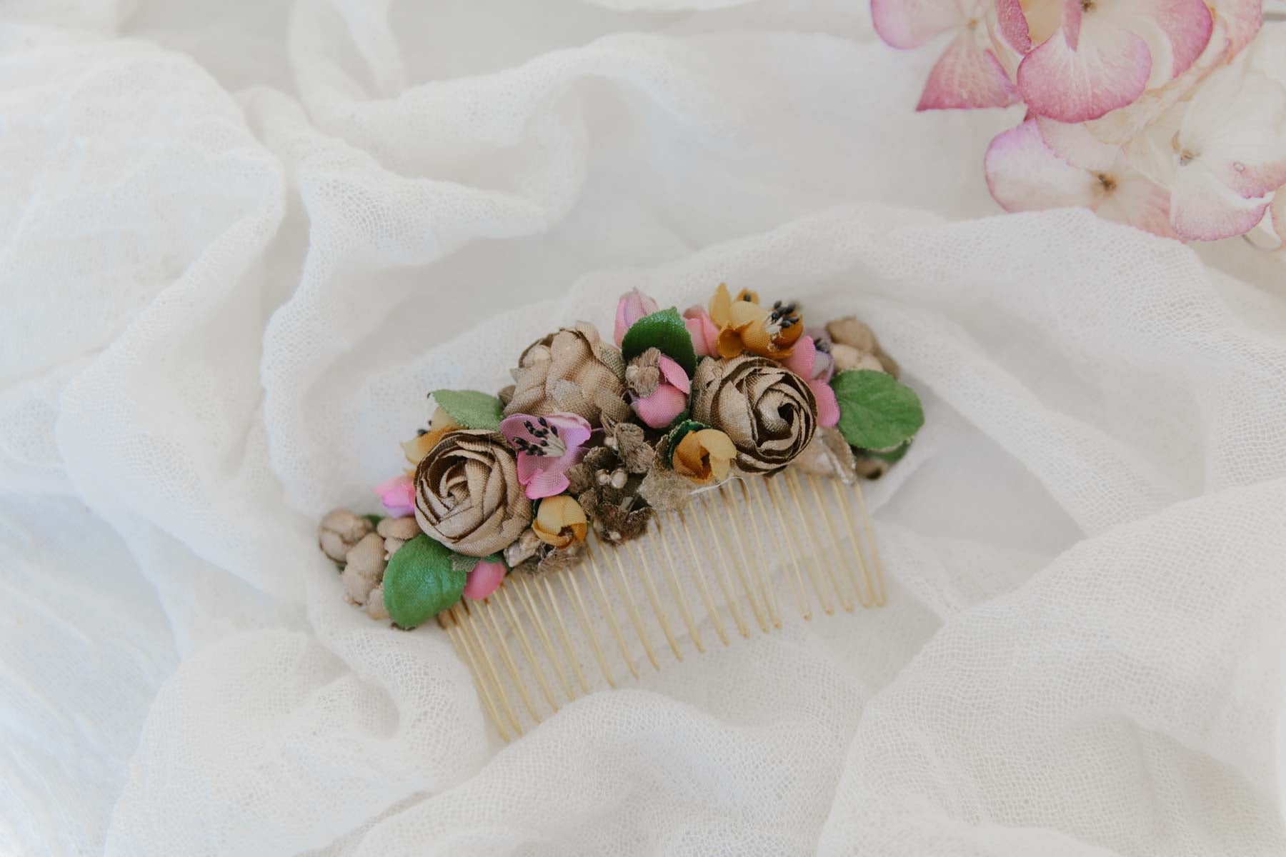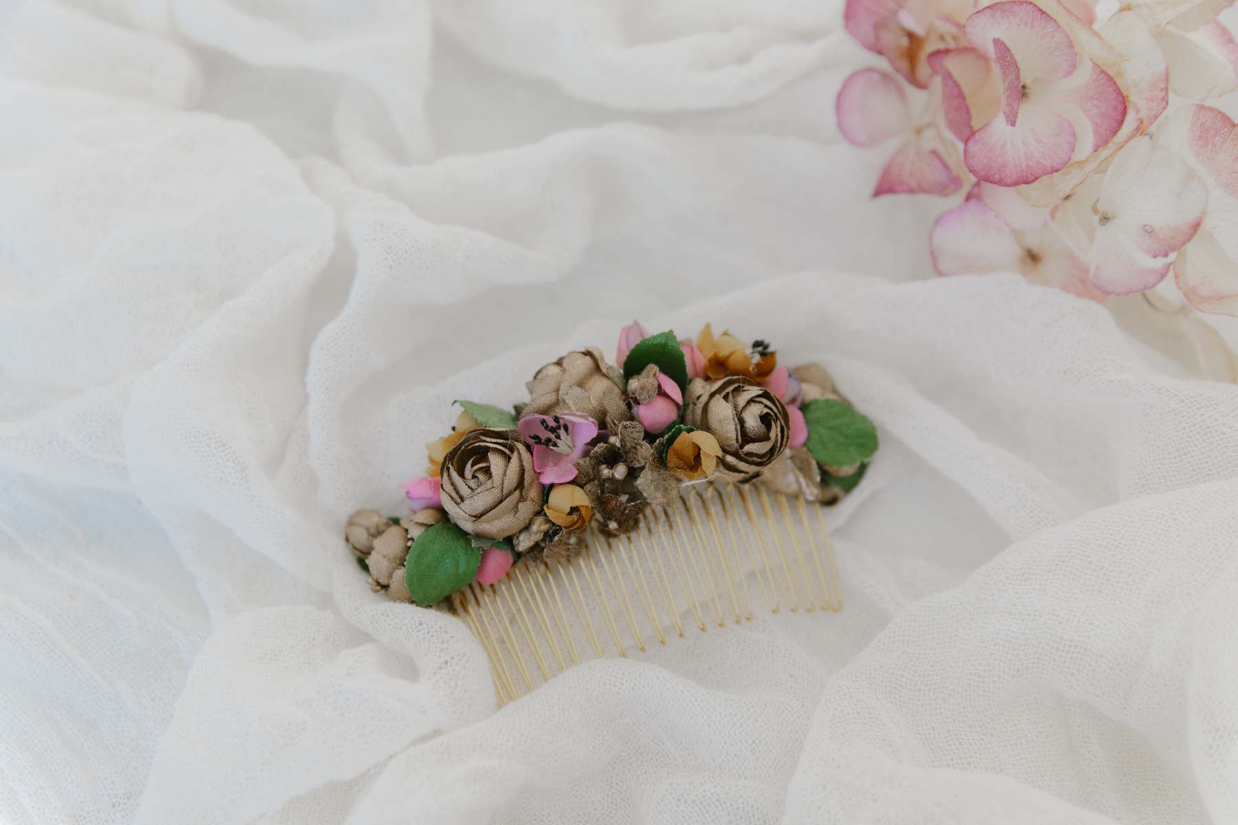 Helena ist das perfekte Statement-Piece für den romantischen Bridal- oder Trachten-Look. Handgemacht in Wien aus edlen Vintage Seidenblumen und hält so ein Leben lang. Ganz einfach zum Stecken ins Haar.