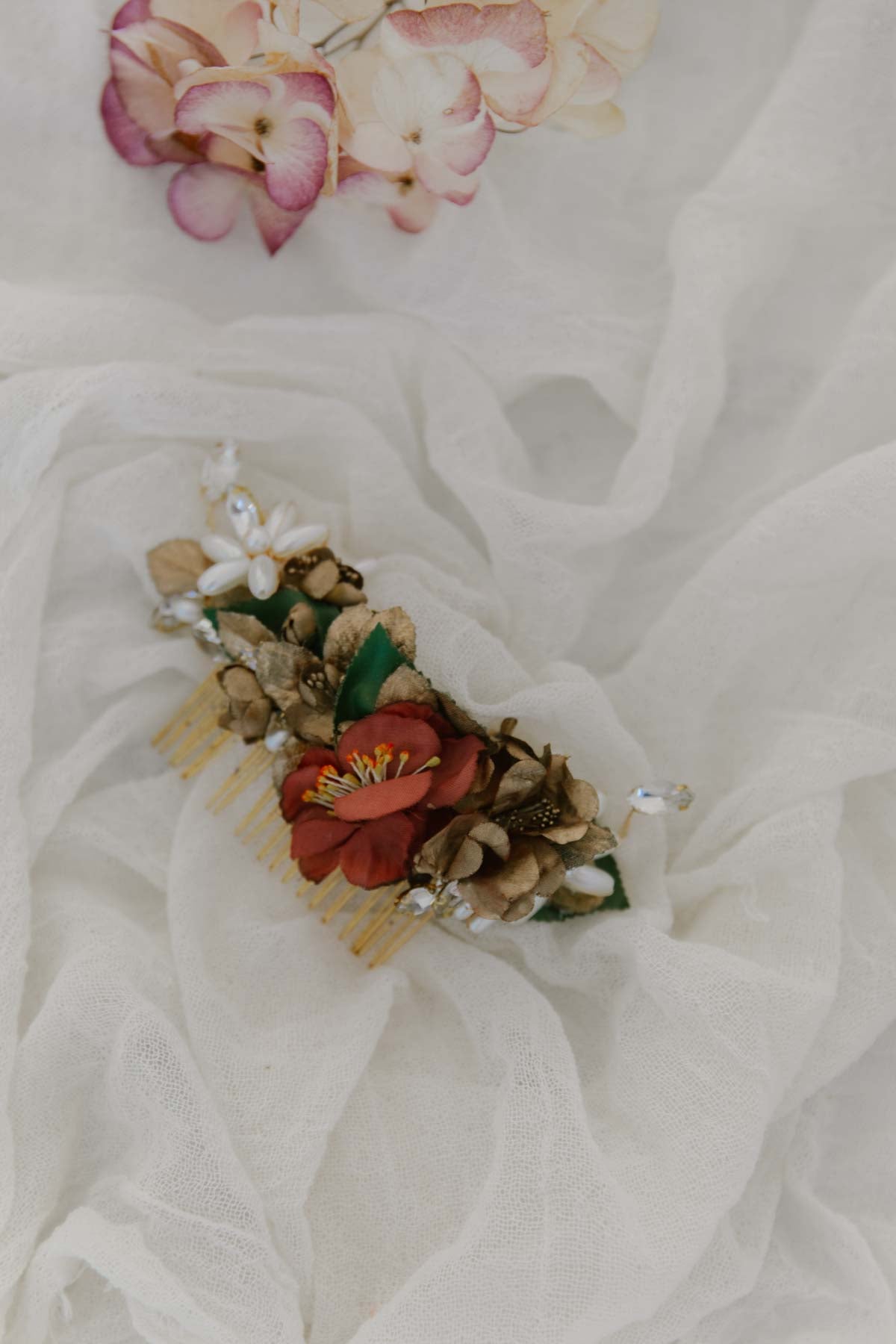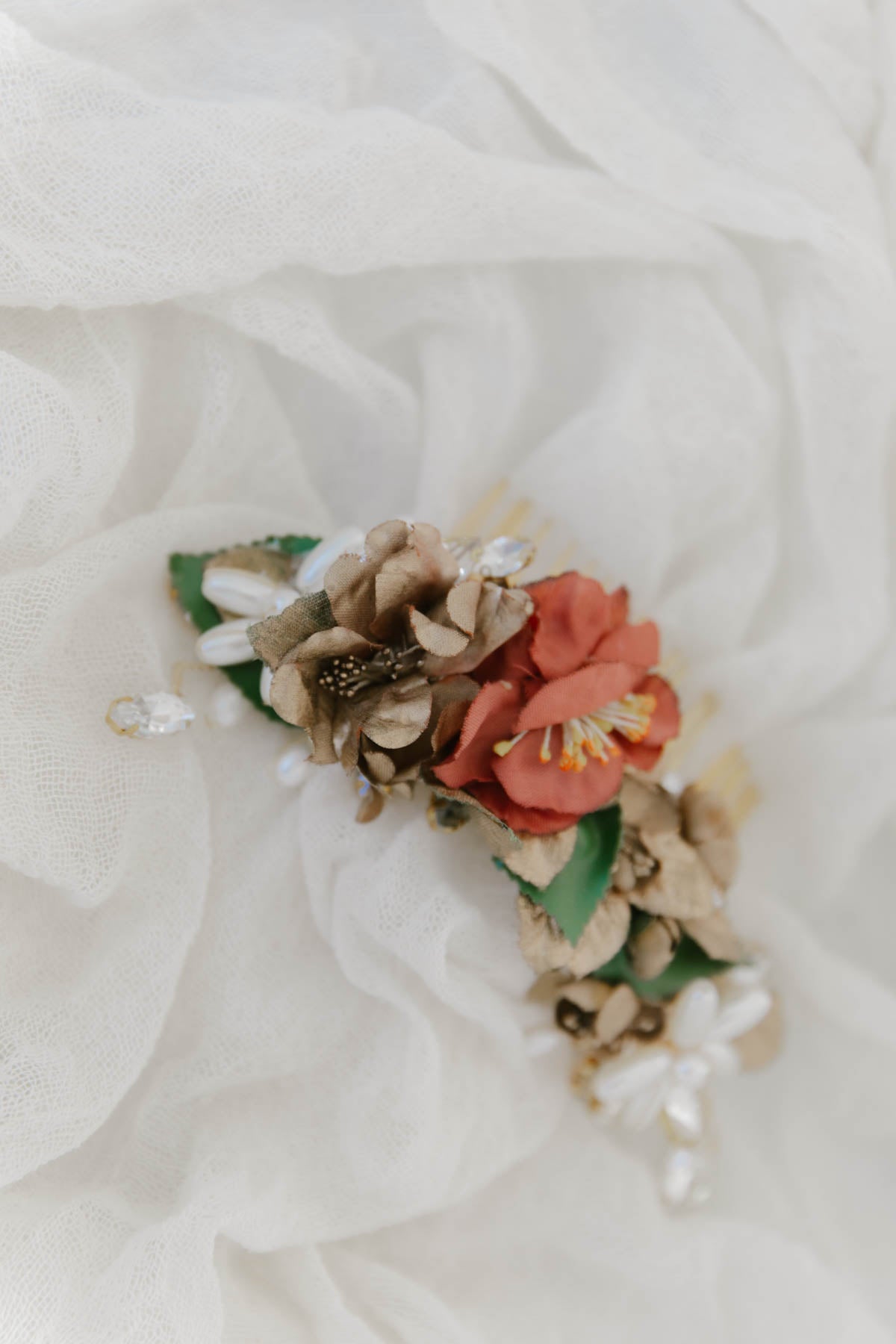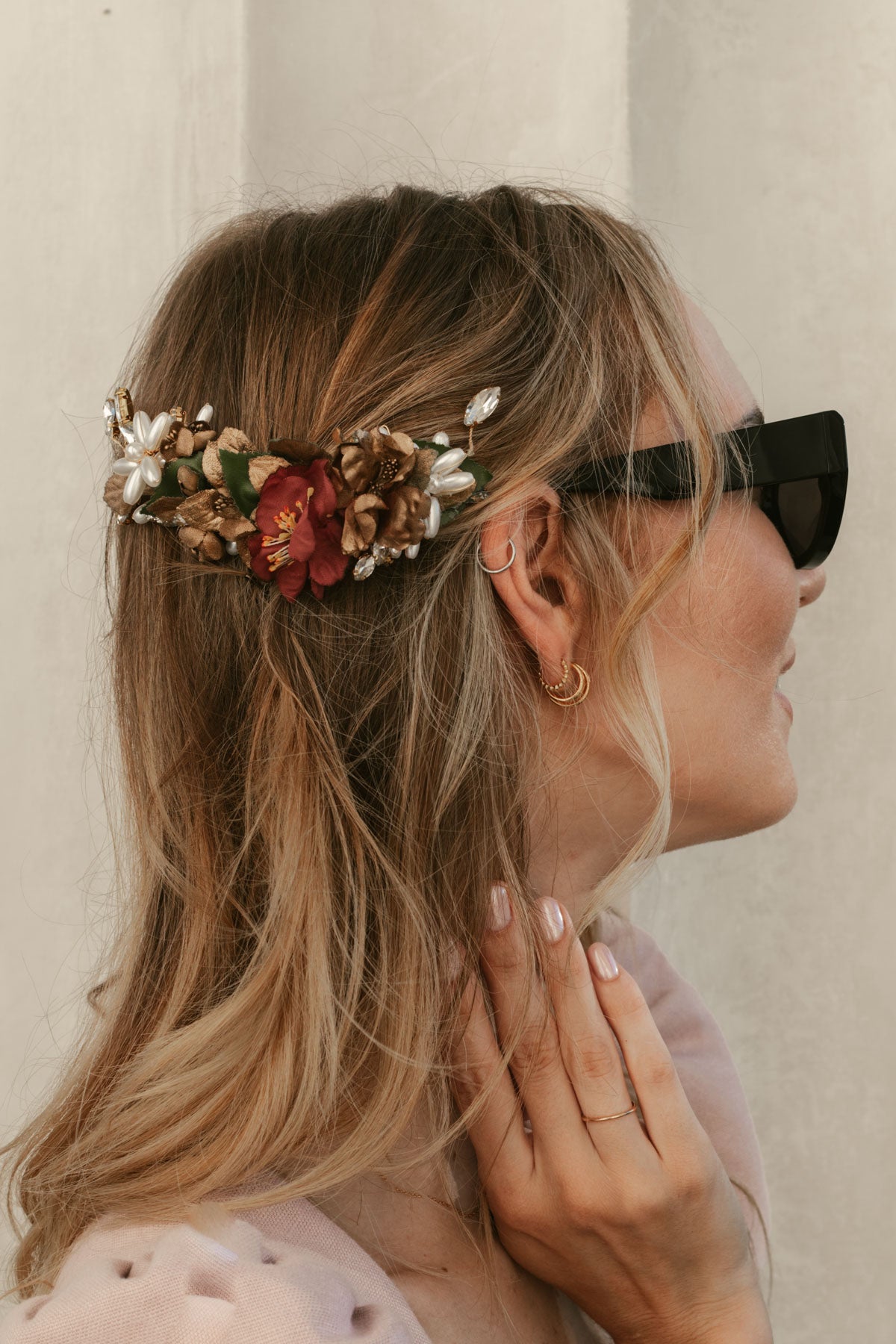 Helena ist das perfekte Statement-Piece für den romantischen Bridal- oder Trachten-Look. Handgemacht in Wien aus edlen Vintage Seidenblumen und hält so ein Leben lang. Ganz einfach zum Stecken ins Haar.