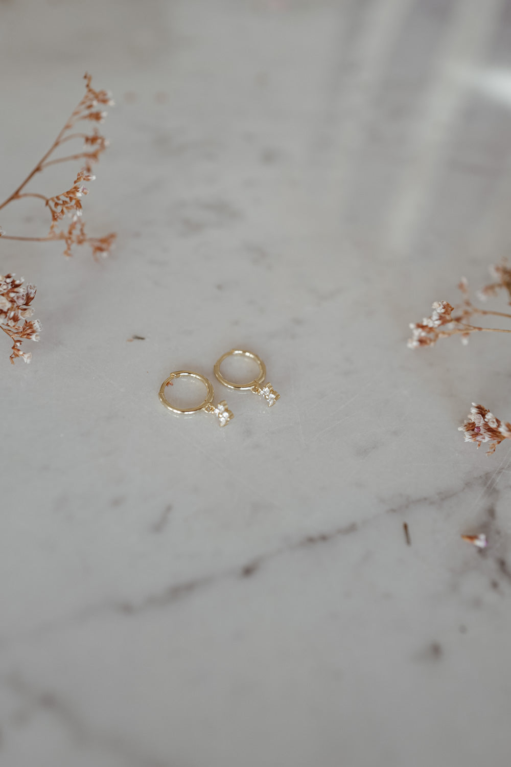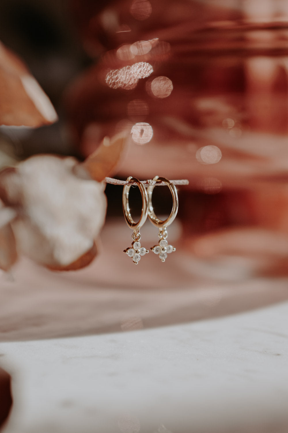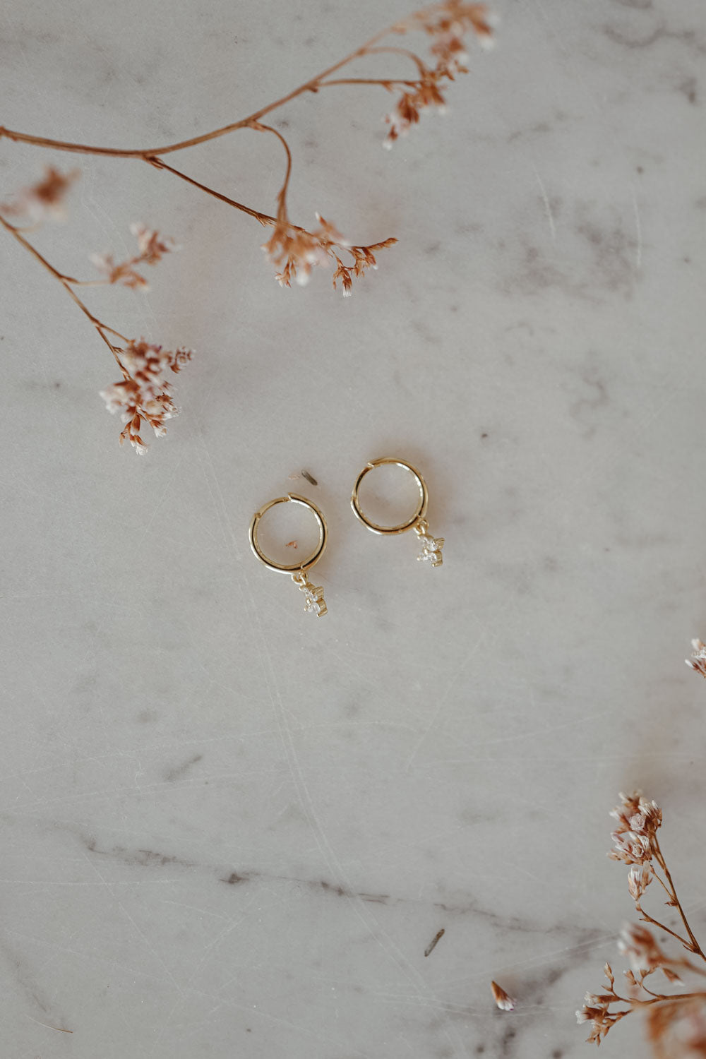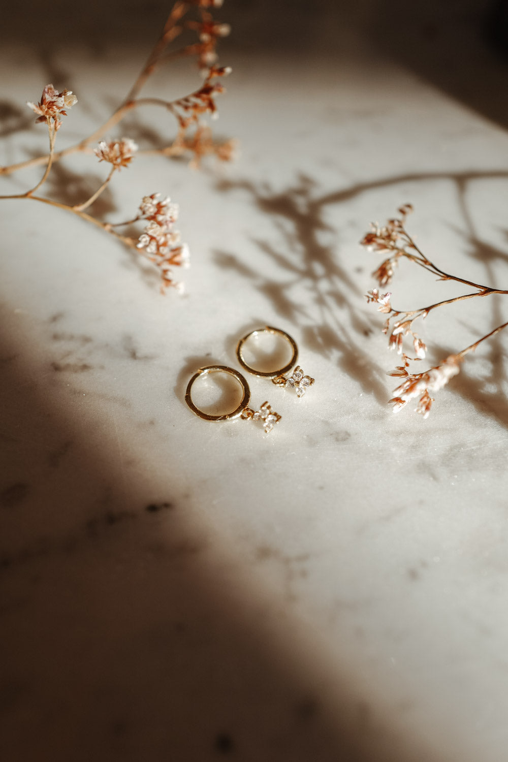 Our Bloom Hoops are part of our first Fine Jewelry Charity Collection. The delicate brass earrings, gold plated with 18k gold, each carry a small sparkling flower pendant.