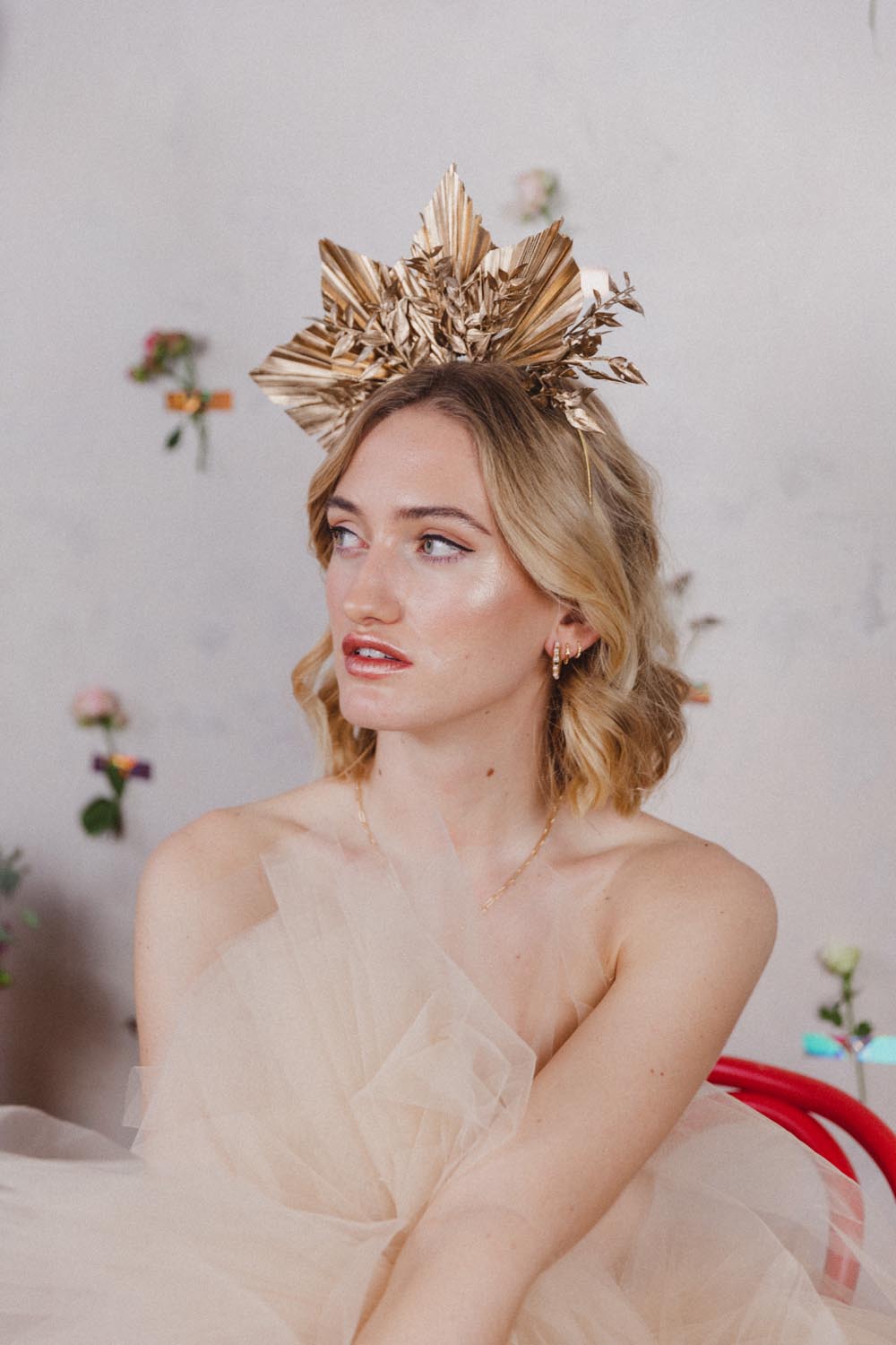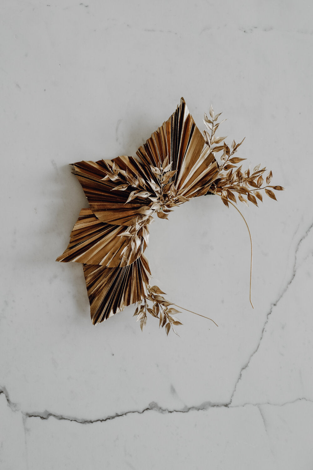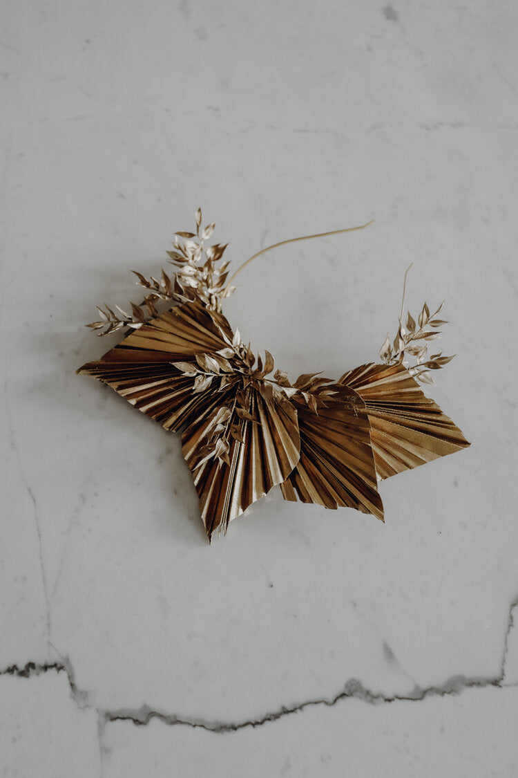 Michelle ist ein opulentes Dried Flower Headpiece aus Ruskus und Palmenblättern inn schimmerndem Gold für den großen Auftritt.