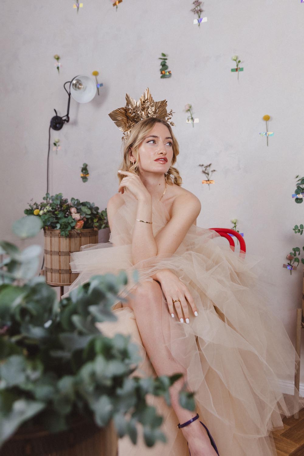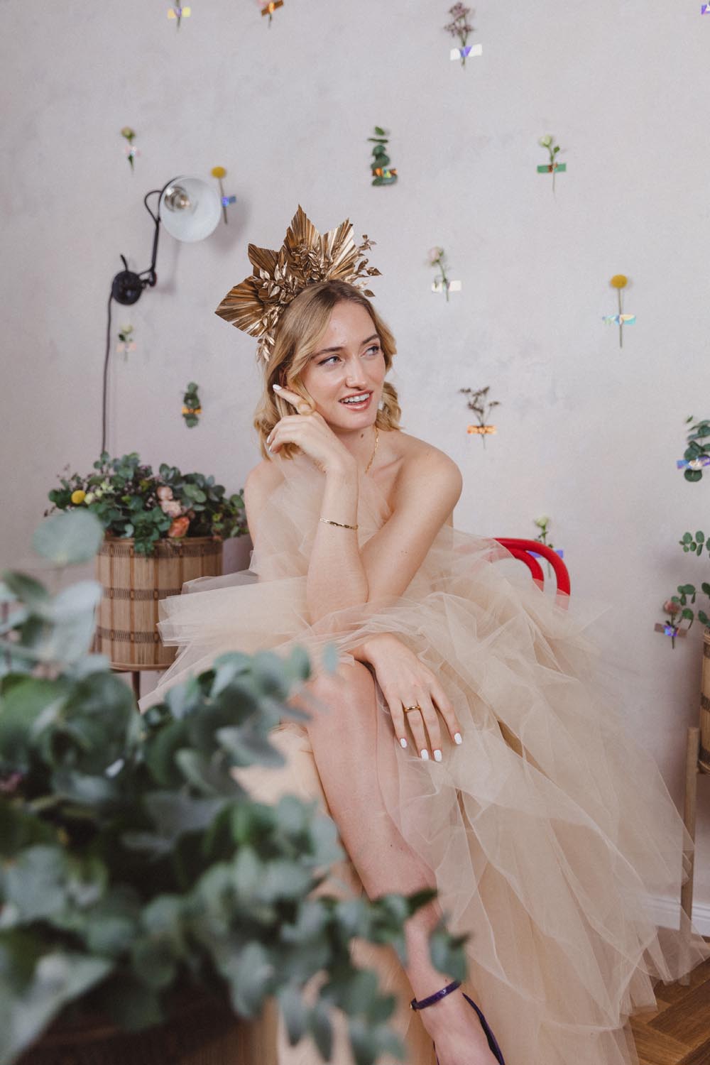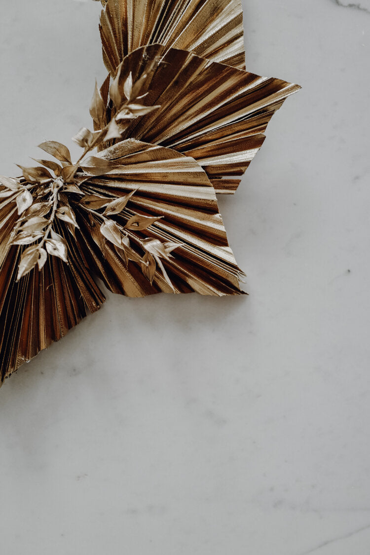 Michelle ist ein opulentes Dried Flower Headpiece aus Ruskus und Palmenblättern inn schimmerndem Gold für den großen Auftritt.