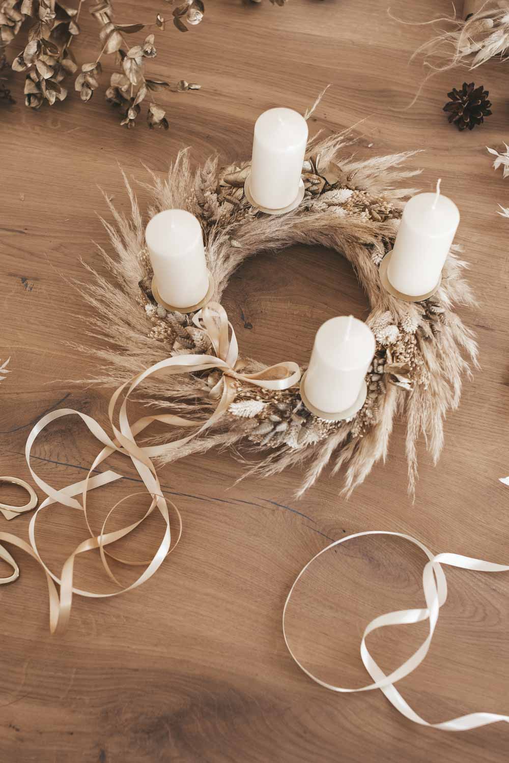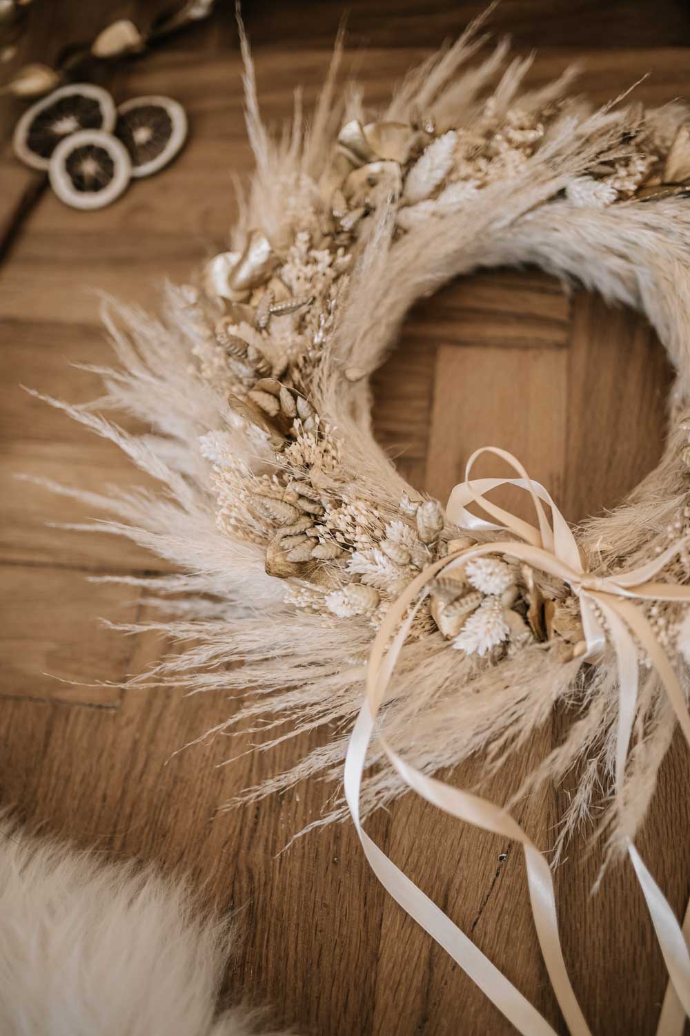 Wir kreieren gemeinsam einen Pampasgras-Kranz kombiniert mit deiner Wunschfarbe. Diesen kannst du sowohl als Türkranz oder Wandkranz verwenden und so nicht nur in der Adventszeit als Dekoration mit Kerzen nutzen. Dein Kranz hält Dank der hochwertig konservierten und getrockneten Gräser und Blüten viele Jahre und so kannst du ihn jede Saison wieder hervorholen.