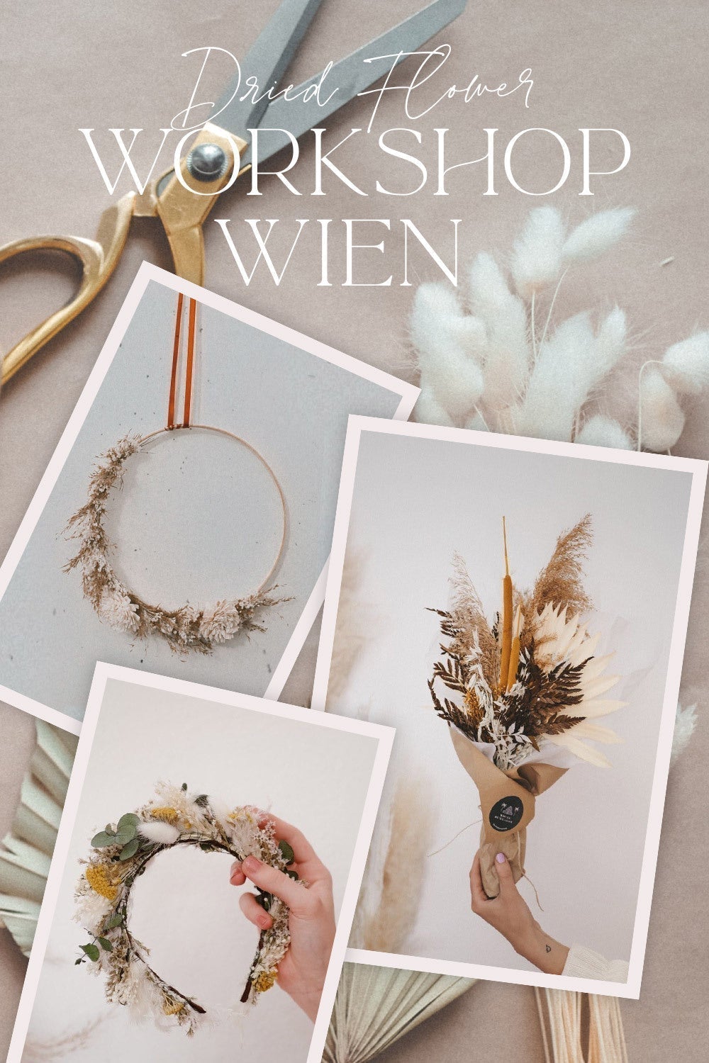 Werde kreativ mit Dried Flowers und lerne wie du mit getrockneten und konservierten Blüten und Gräsern tolle Kreationen zauberst. Du kannst entscheiden ob du im Workshop einen Dried Flower Hoop oder Flowercrown für die Ewigkeit binden möchtest. Lerne mit Dried Flowers zu binden und zaubere zugleich den perfekten Flowerkranz für die Wand oder die perfekte Blumenkrone fürs Haar!