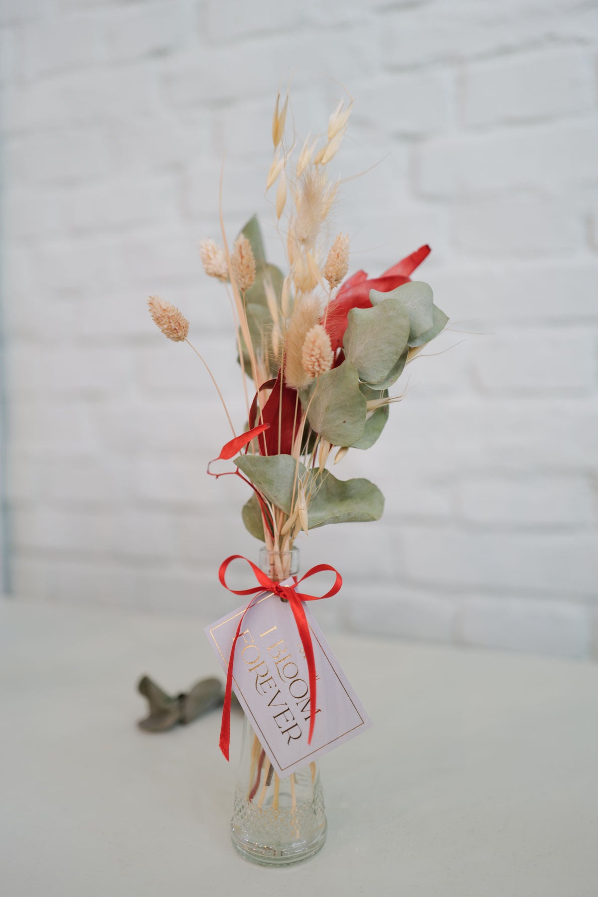 This piece is already planted in a vase and comes to you as finished home decor. Stabilized roses meet preserved and dried flowers and grasses. Your bouquet will last a lifetime.