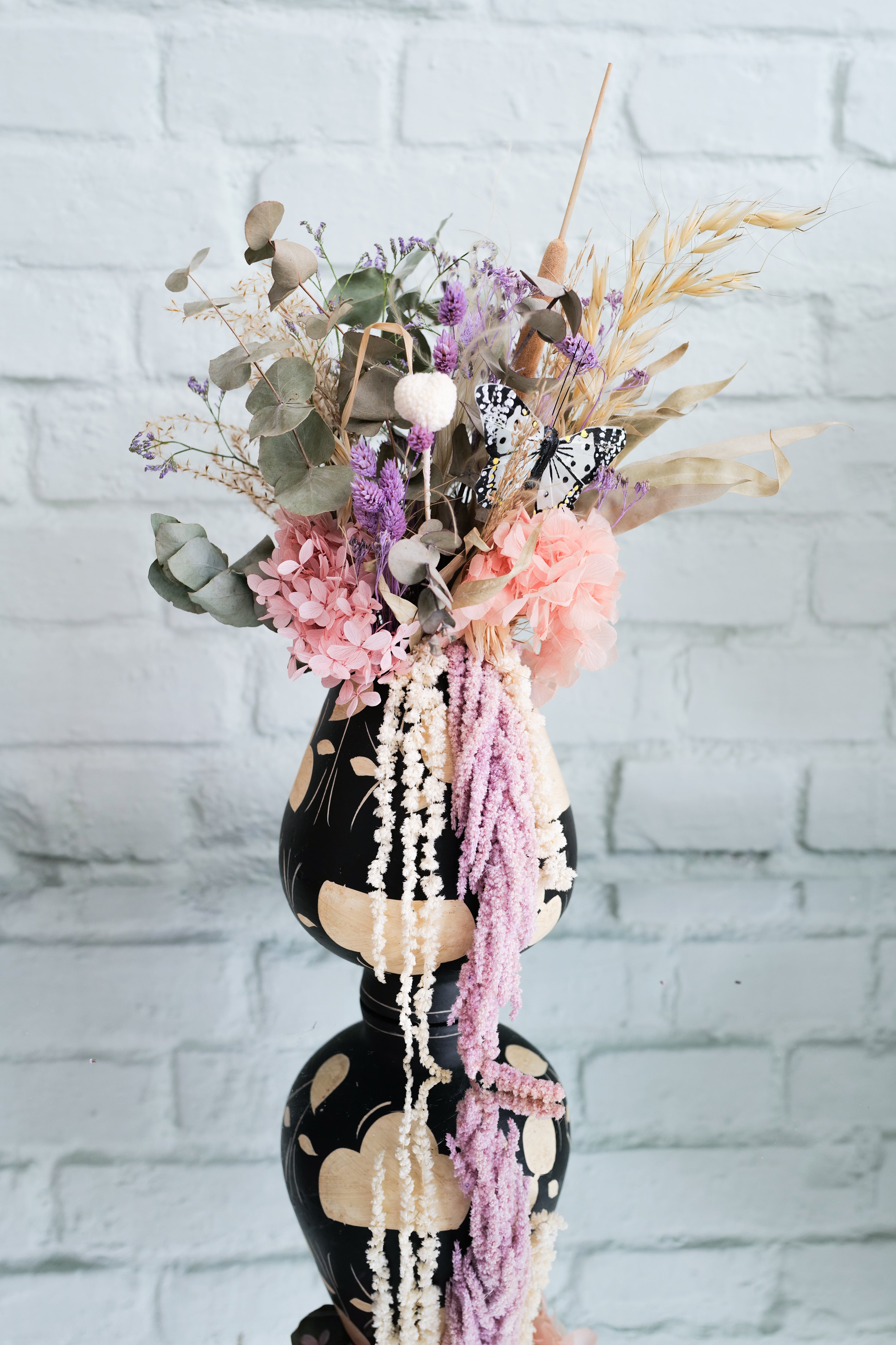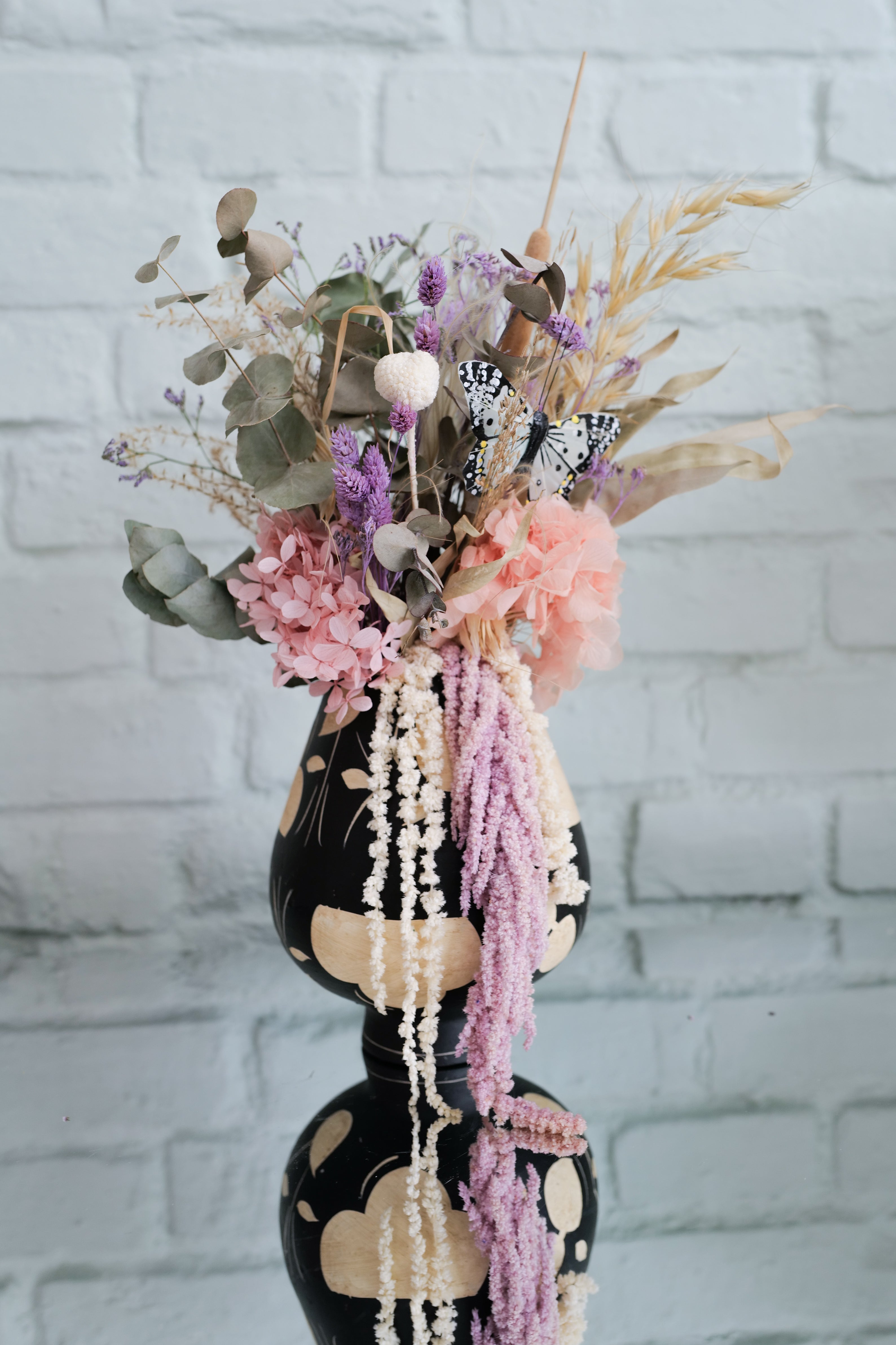 Dieses Stück ist bereits in eine Vase gepflanzt und kommt so als fertige Home-Decor zu dir. Stabilisierte Holz-Blume trifft auf konservierte und getrocknete Blumen und Gräser. So hält dein Strauss ein Leben lang.